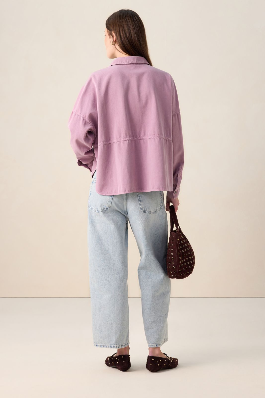 Stylishe lilafarbene Bluse der Marke Sissy-Boy. Die Bluse hat lange Puffärmel, Druckknöpfe, einen Kragen, überschnittene Schultern, lilafarbene Nähte und einen Relaxed Fit. Material: 100% Baumwolle.