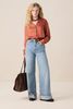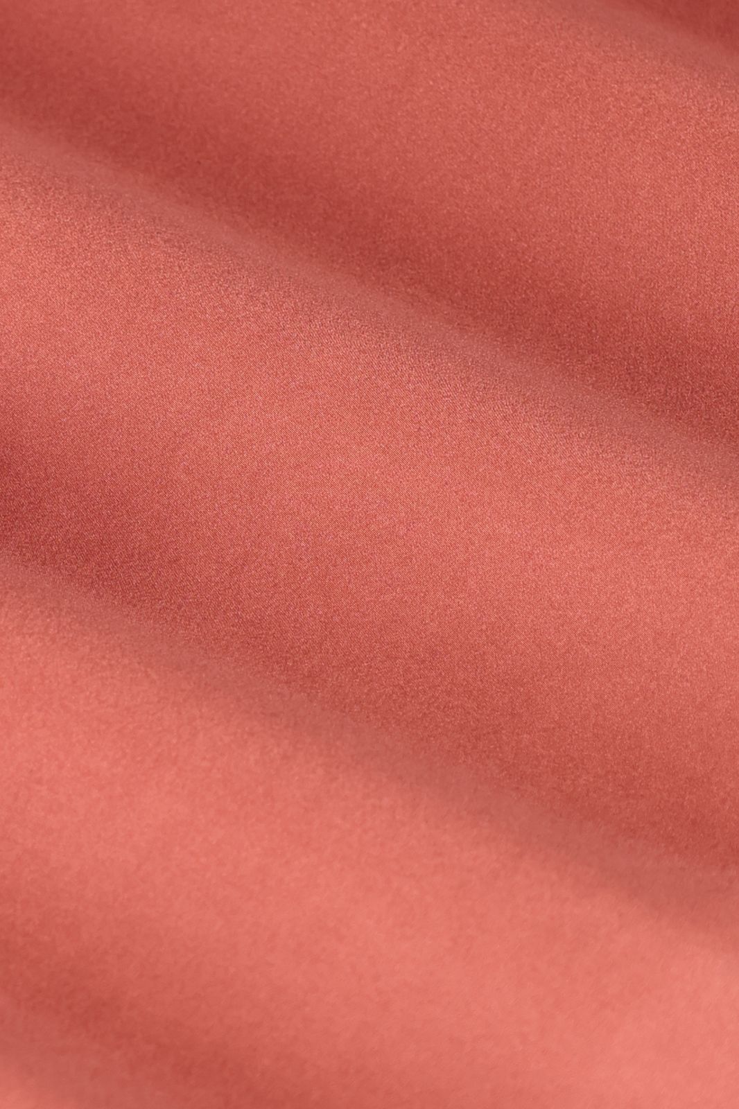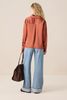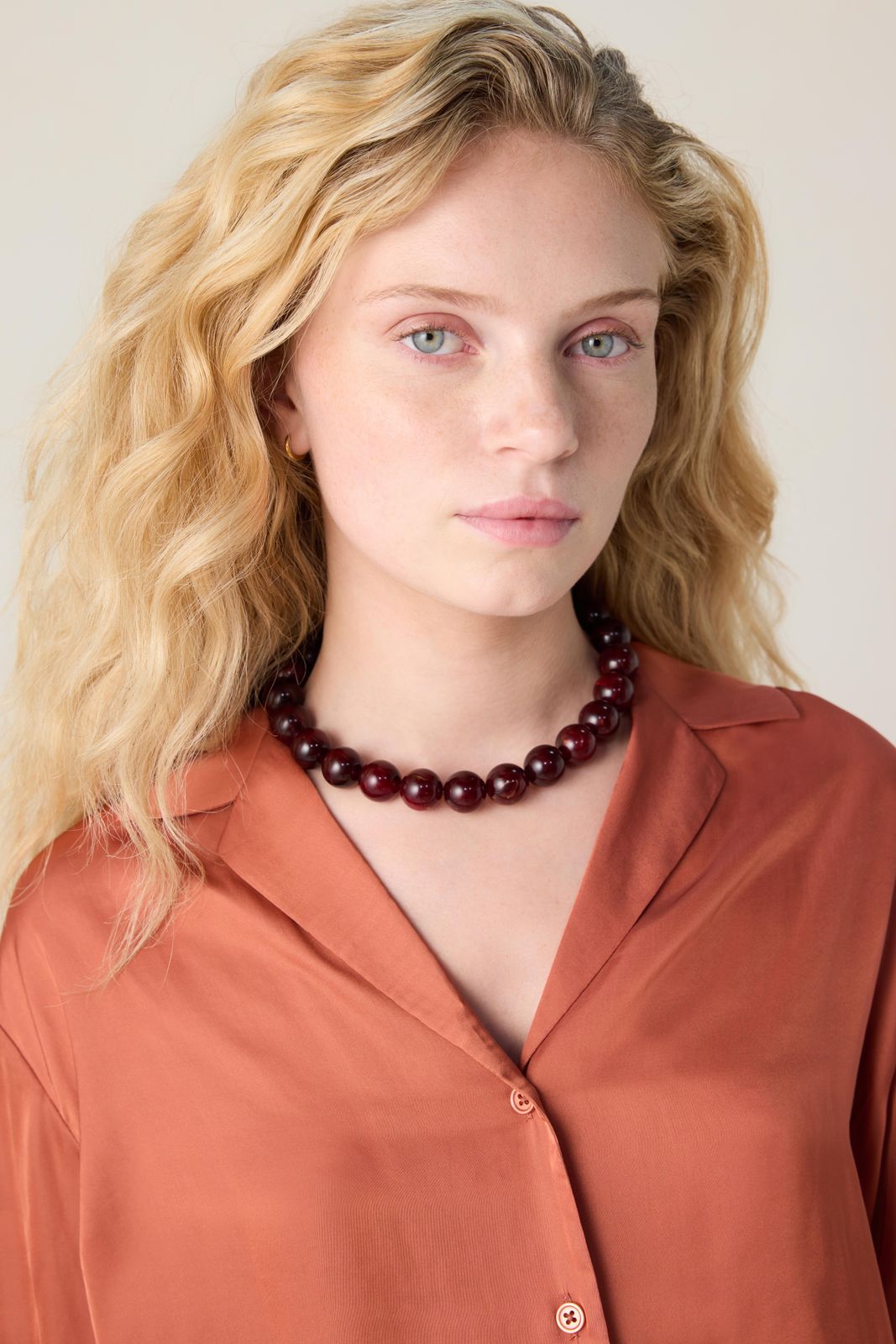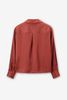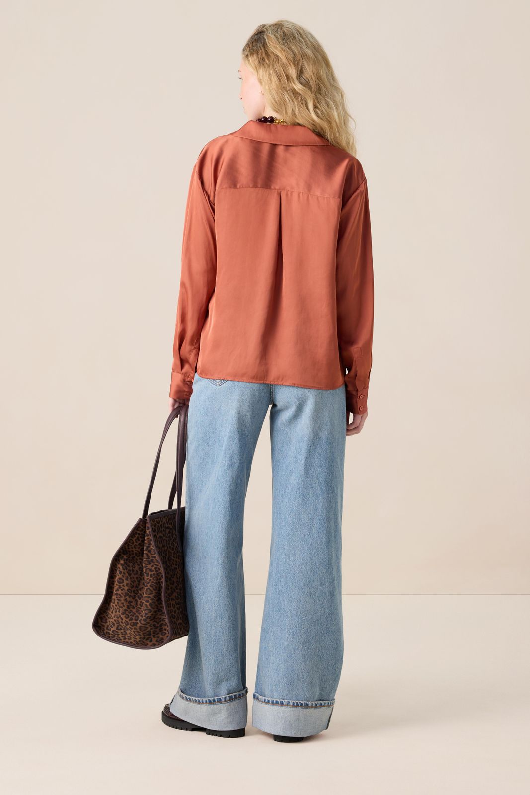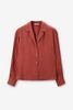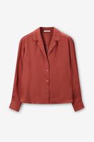 Rote Bluse mit Reverskragen der Marke Sissy-Boy. Die Bluse hat Puffärmel, einen V-Ausschnitt, eine Knopfleiste, eine reguläre Passform, Falten-Details auf der Rückseite und eine edle Satin-Optik. Material: 100% Polyester.