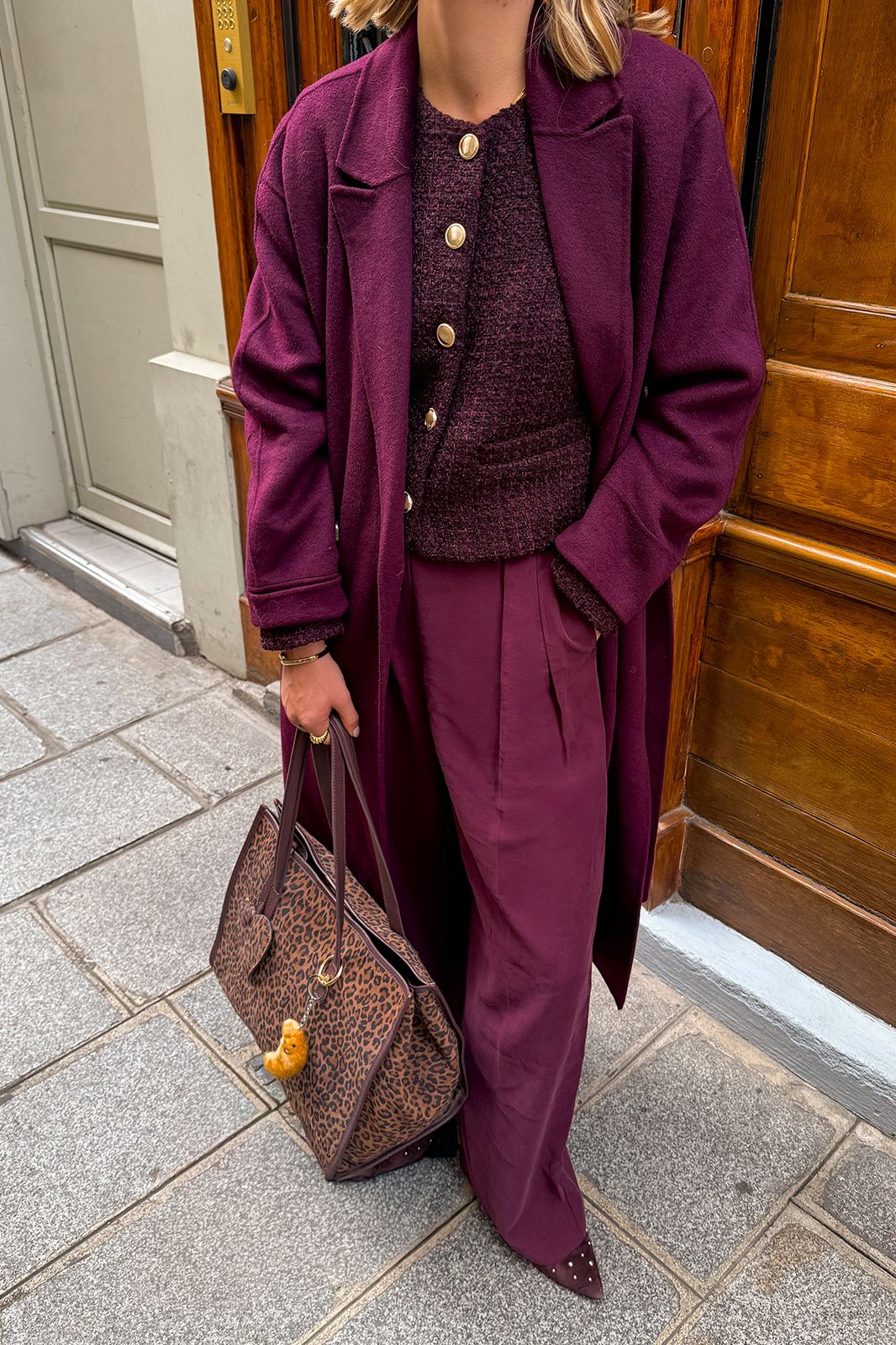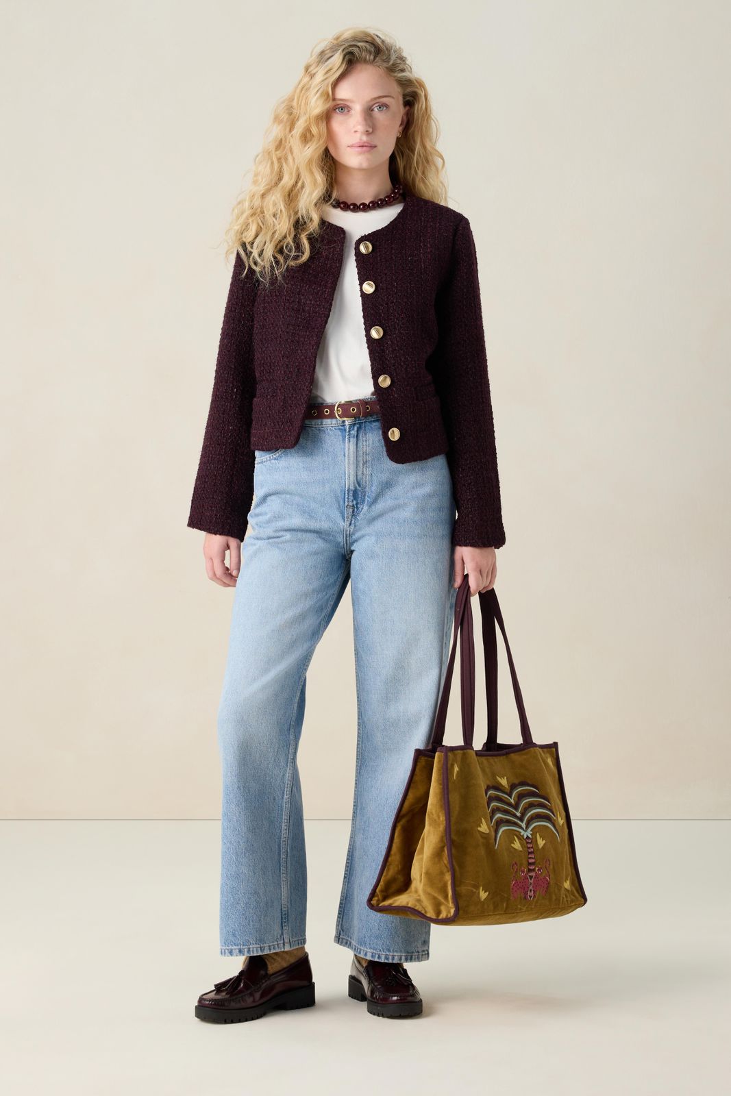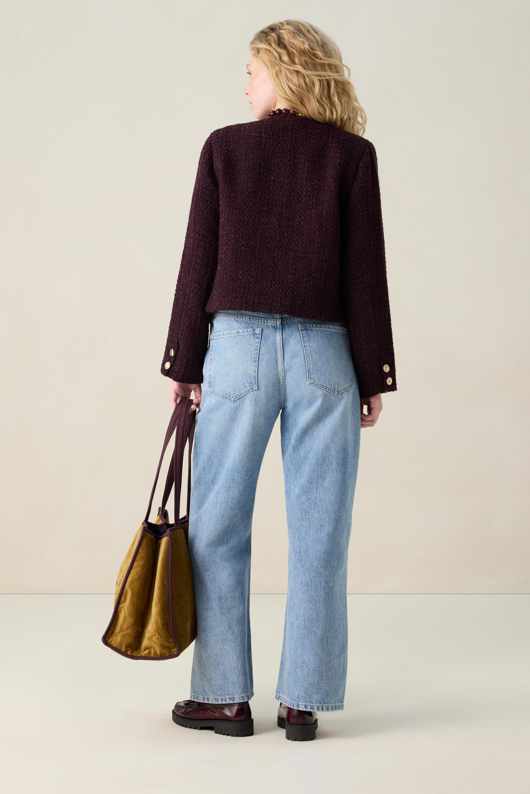 Dunkelrote Bouclé-Jacke der Marke Sissy-Boy. Die Jacke hat ein kurzes Modell, einen hohen Ausschnitt, zwei Seitentaschen, eine Knopfleiste und eine reguläre Passform. Material: 70% Polyester, 30% Wolle.
