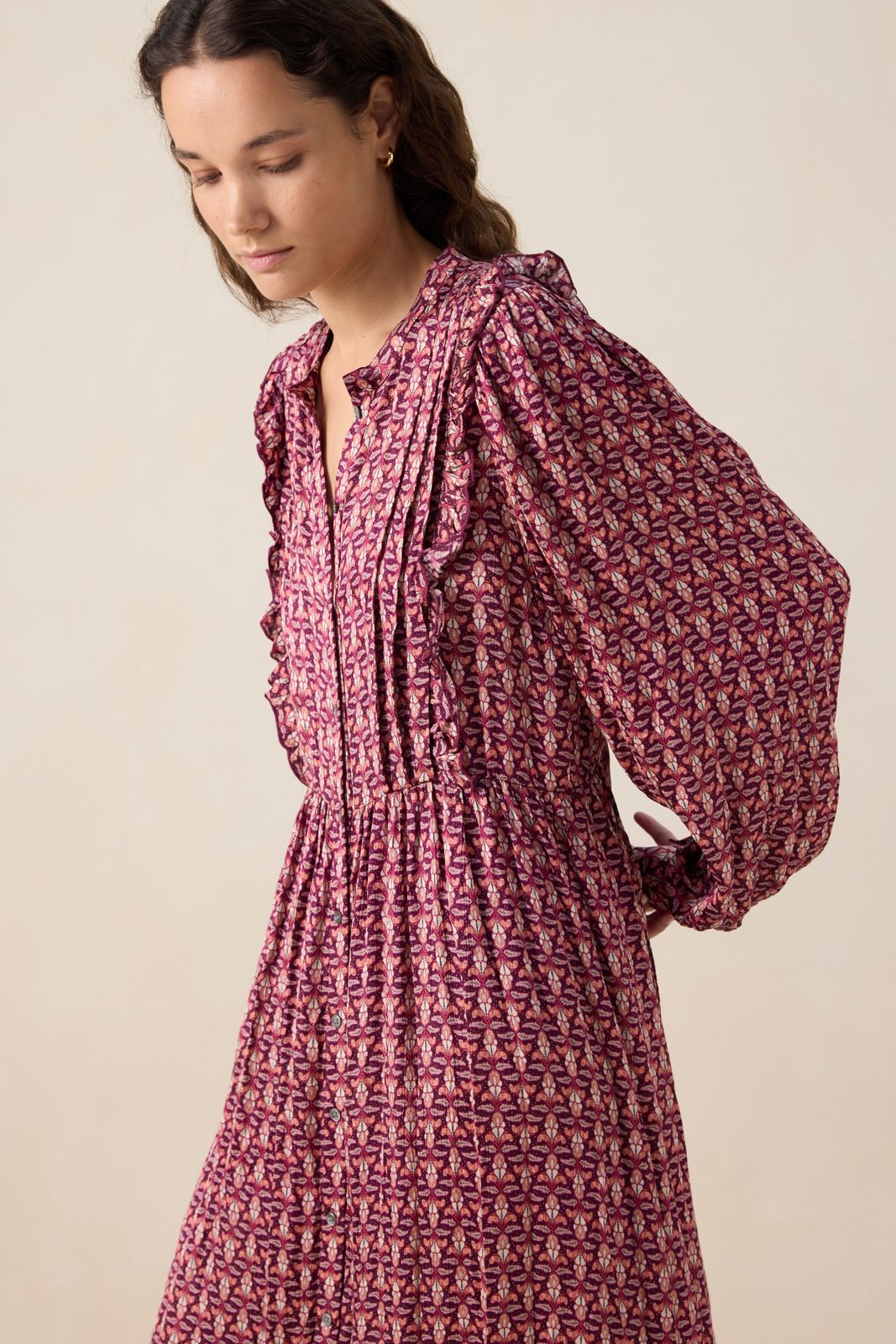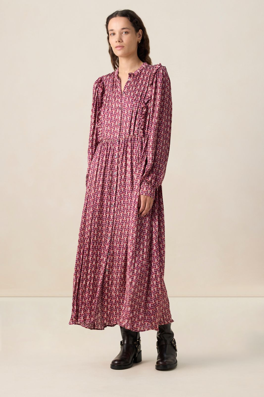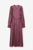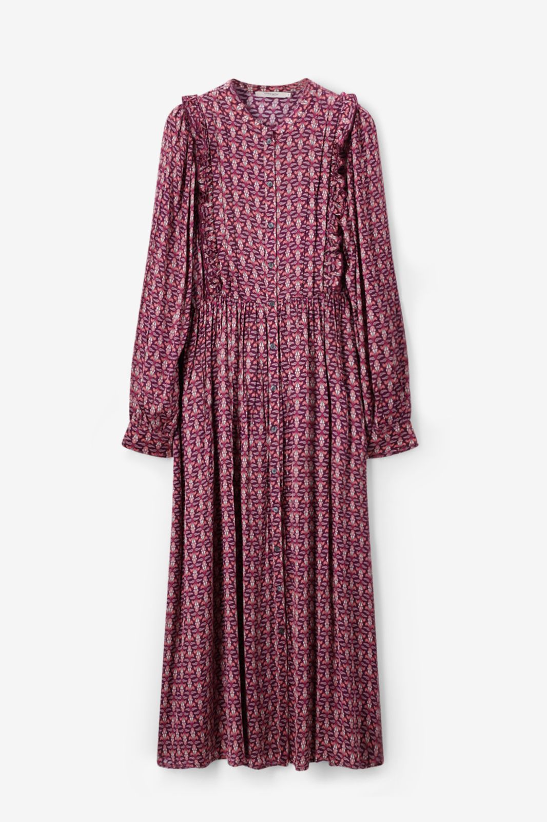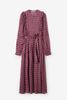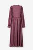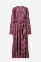 Dunkelrotes Kleid der Marke Sissy-Boy. Das gemusterte Maxi-Kleid hat lange Puffärmel, einen hohen Ausschnitt, eine Knopfleiste, eine reguläre Passform, verspielte Rüschen am Saum und ein feminines Taillenband. Material: 100% Viskose.