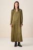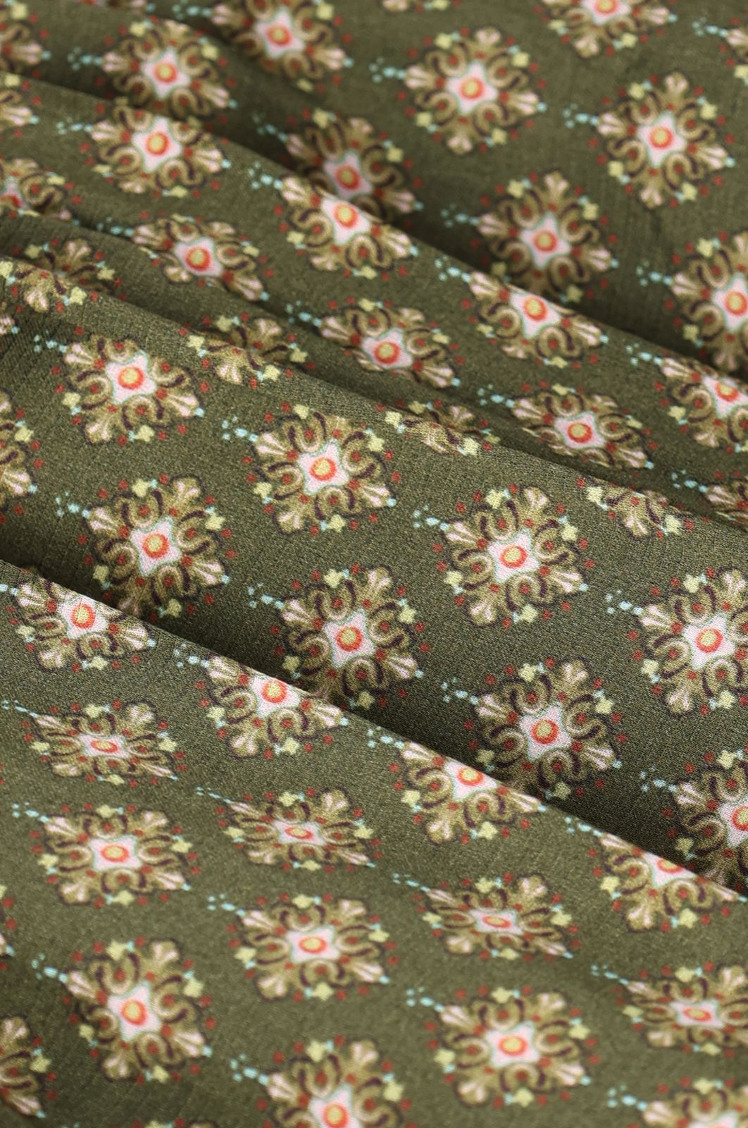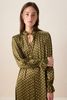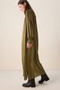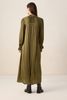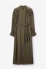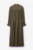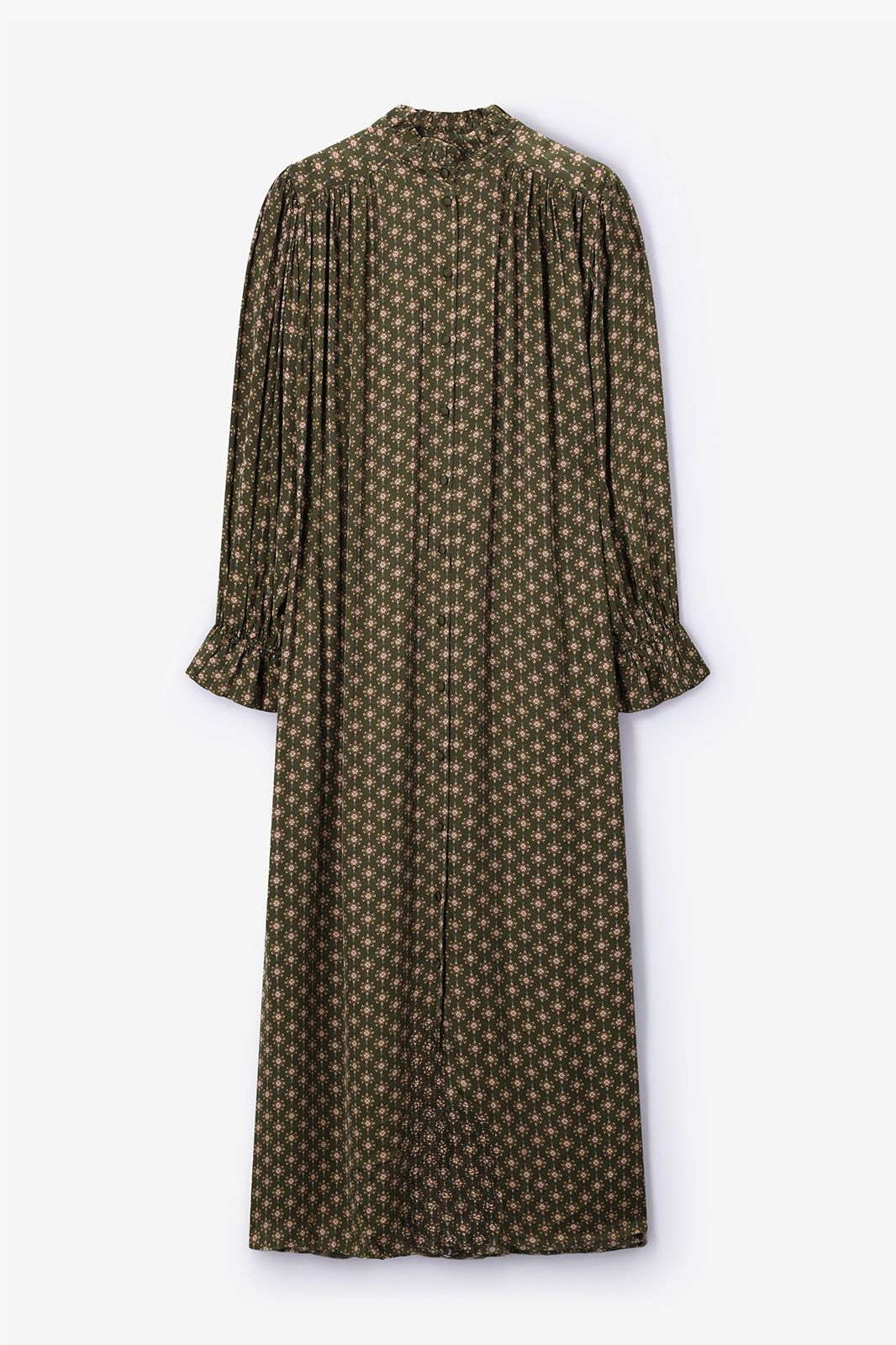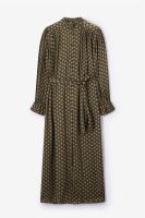 Dunkelgrünes Maxi-Kleid der Marke Sissy-Boy. Das Kleid hat lange Puffärmel, einen kleinen Stehkragen, eine Knopfleiste und ein Taillenband, das sich abnehmen lässt. Das Muster mit rosafarbenen Akzenten macht den Look des Kleids komplett. Material: 100% Viskose.