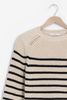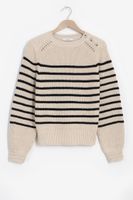 Beigefarbener Pullover mit schwarzen Querstreifen der Marke Sissy-Boy. Die Knöpfe an der Schulter geben dem Pulli den Finishing Touch. Das Item hat einen runden Ausschnitt und ist aus 60% Baumwolle, 30% Nylon und 10% Wolle gearbeitet.