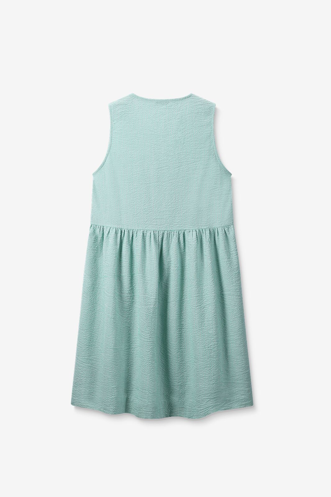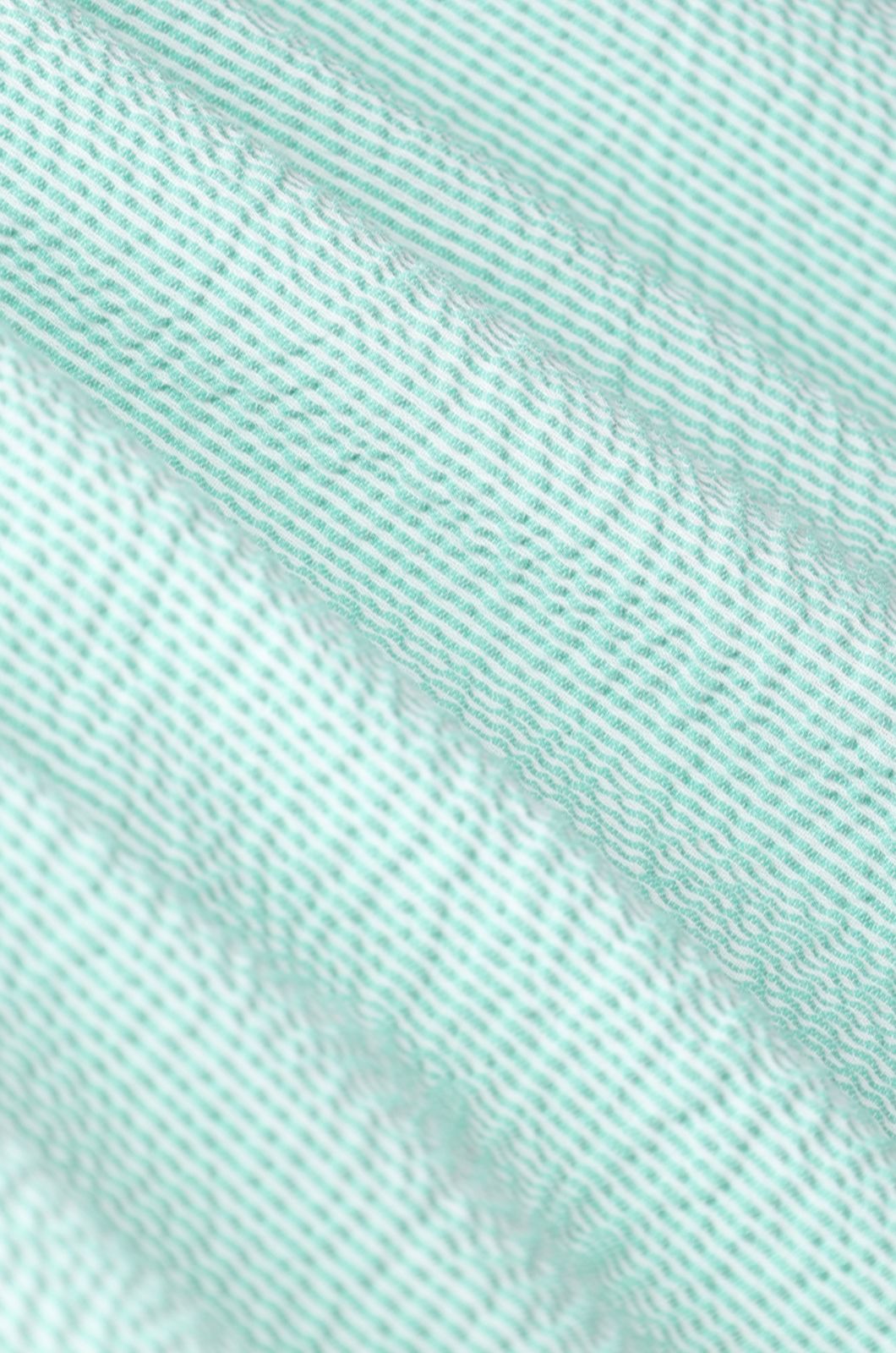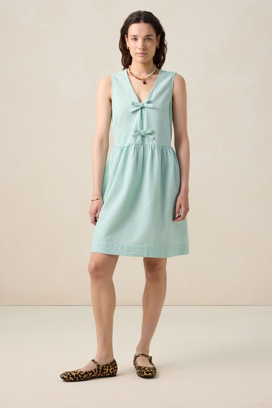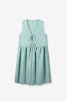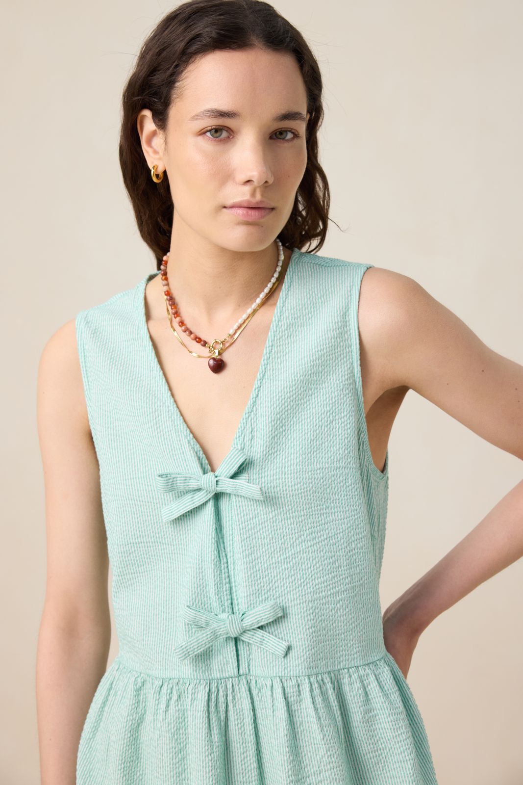 Grün gestreiftes Mini-Kleid der Marke Sissy-Boy. Das Kleid hat einen V-Ausschnitt, Falten-Details und wird auf der Vorderseite mit Schleifen gebunden. Material: 100% Baumwolle.