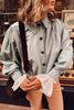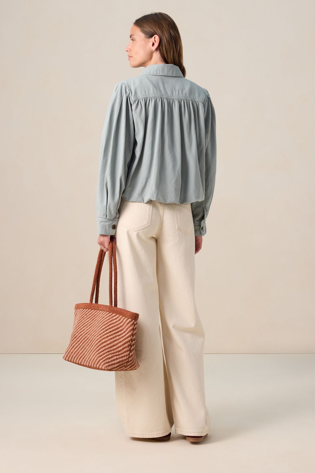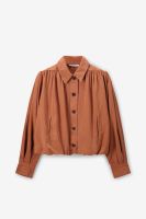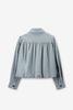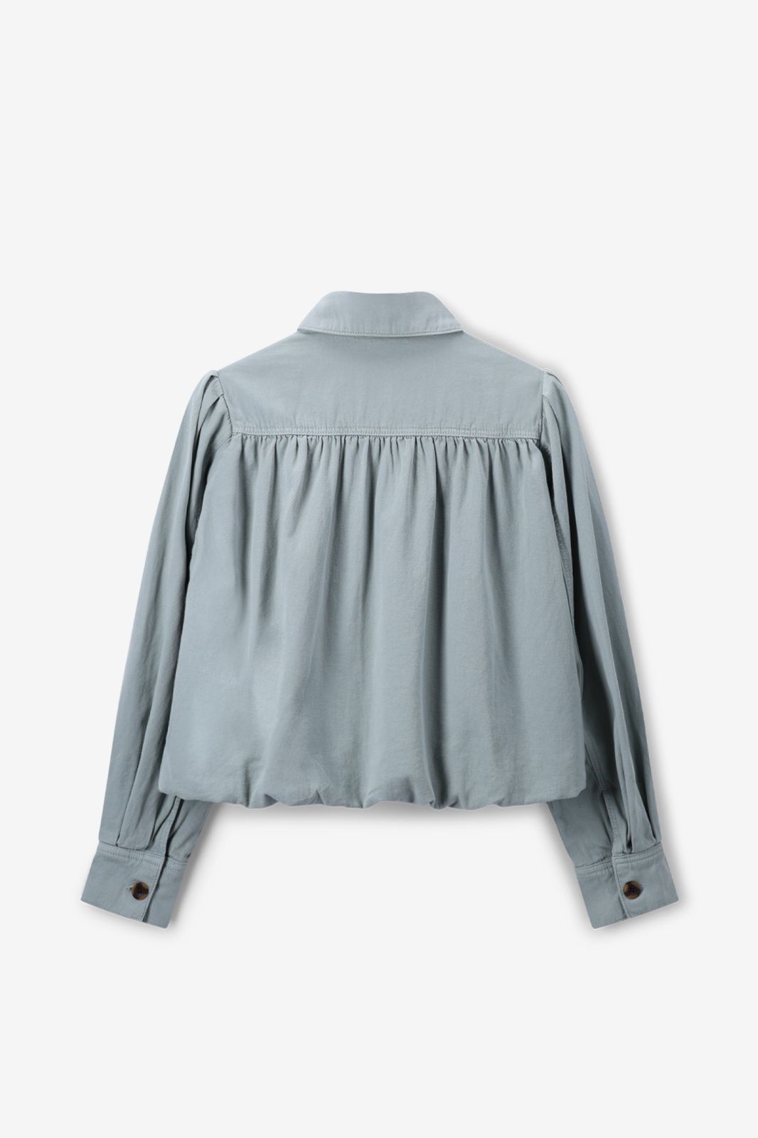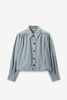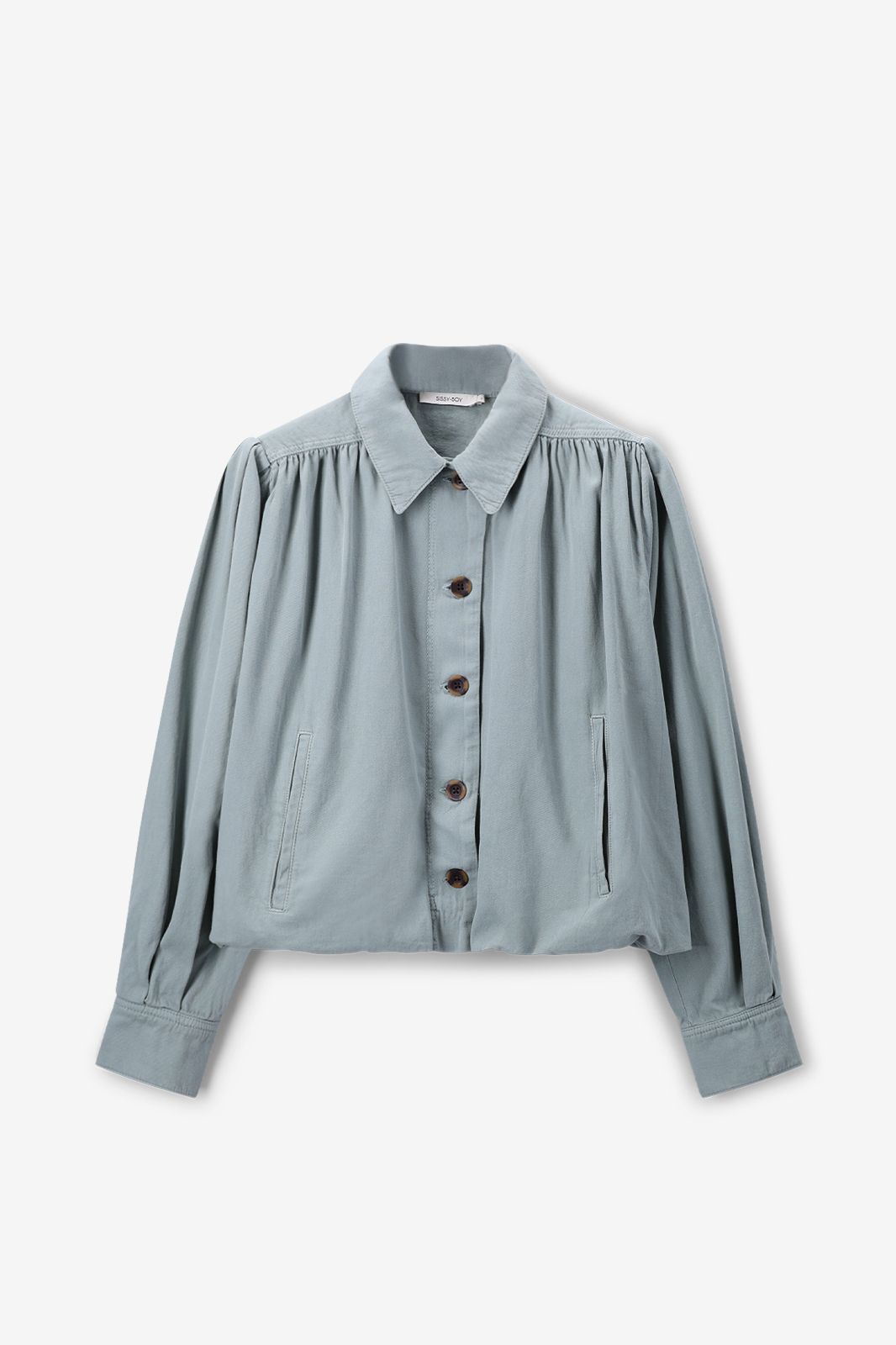 Blaue Jacke mit Ballonärmeln der Marke Sissy-Boy. Die Jacke hat einen klassischen Kragen, einen Relaxed Fit, eine Knopfleiste und feminine Falten an den Schultern und Ärmeln. Material: 100% Baumwolle.