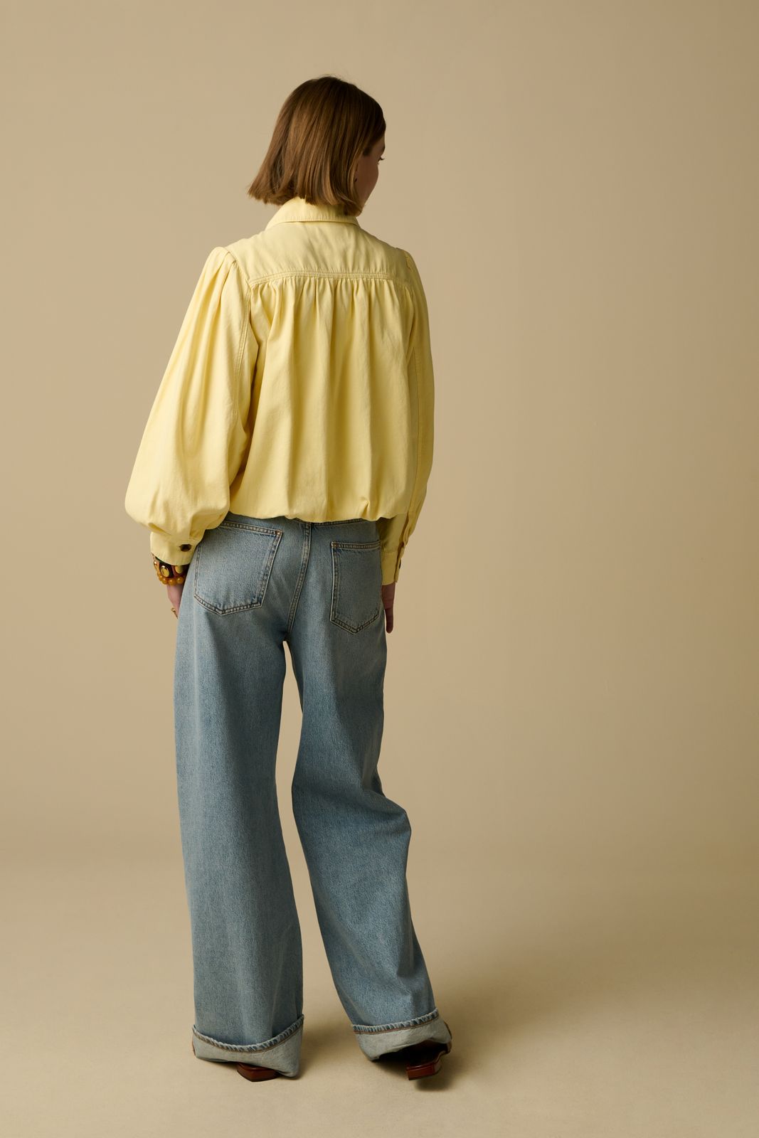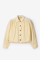 Gelbe Jacke mit Ballonärmeln der Marke Sissy-Boy. Die Jacke hat einen Kragen, einen Relaxed Fit, eine Knopfleiste, Seitentaschen und verspielte Falten an den Schultern und Ärmeln. Material: 100% Baumwolle.