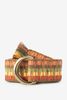 Grüner Jacquard-Gürtel der Marke Sissy-Boy. Das Gewebe des Gürtels hat die Farben Grün, Gelb, Rot, Dunkelgrün und Rosa. Der Gürtel wird mithilfe der D-Schnalle geknotet. Material: 100% Baumwolle.