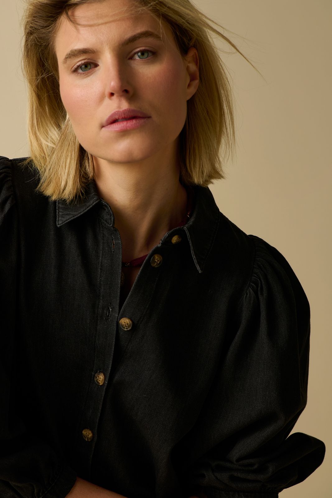 Graues Jeanskleid der Marke Sissy-Boy. Das Kleid hat lange Ballonärmel, einen kurzen Schnitt und eine Knopfleiste. Material: 100% Baumwolle.