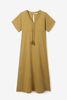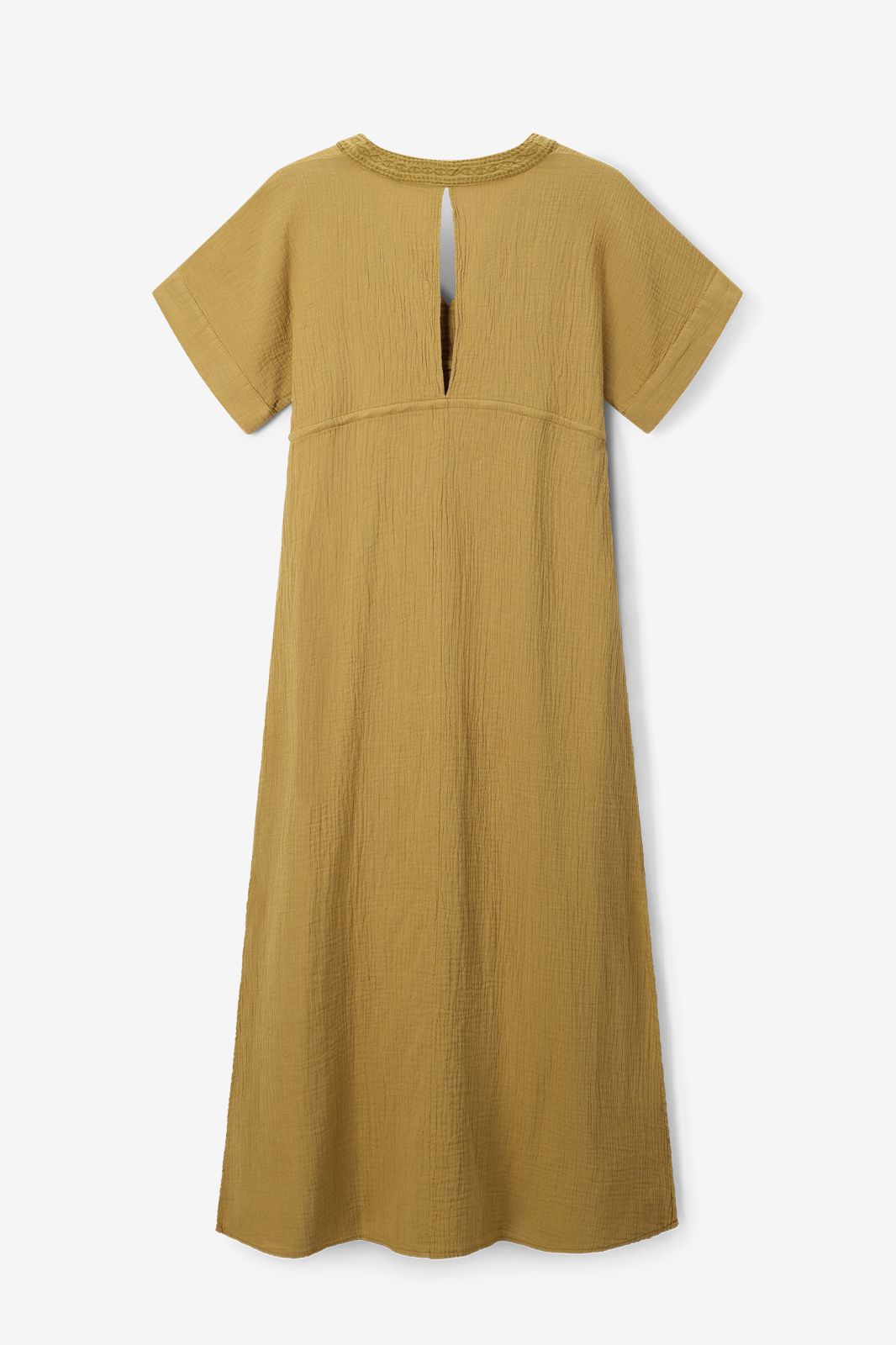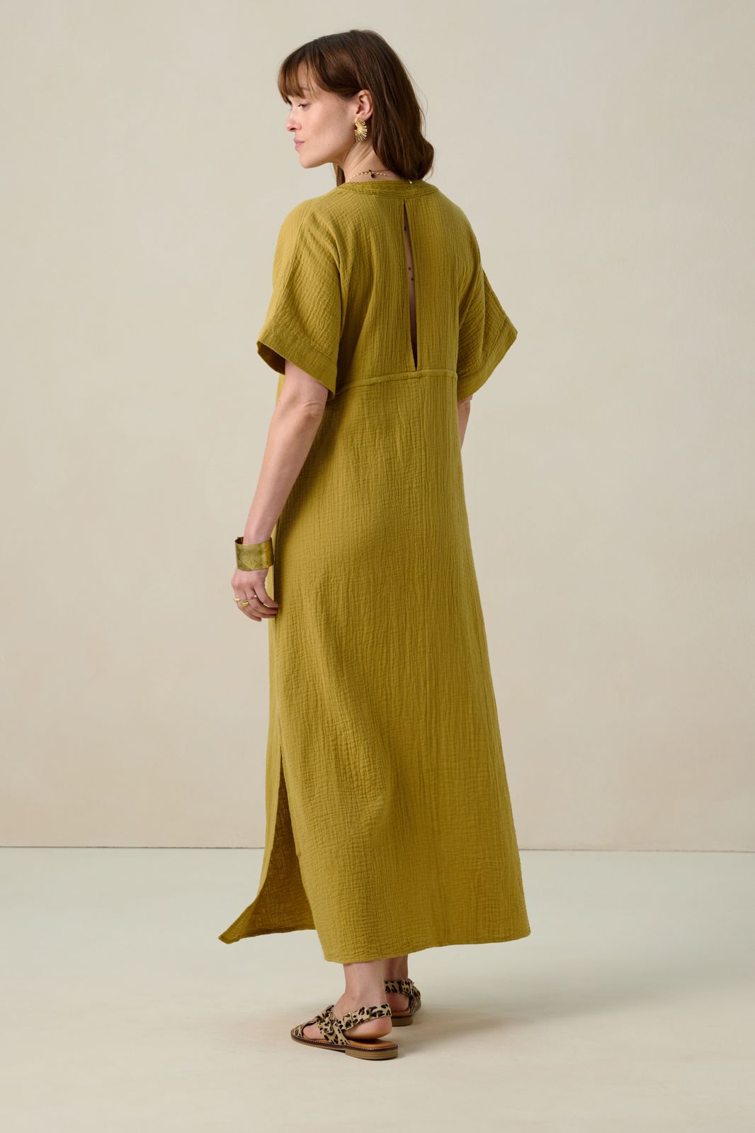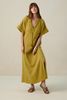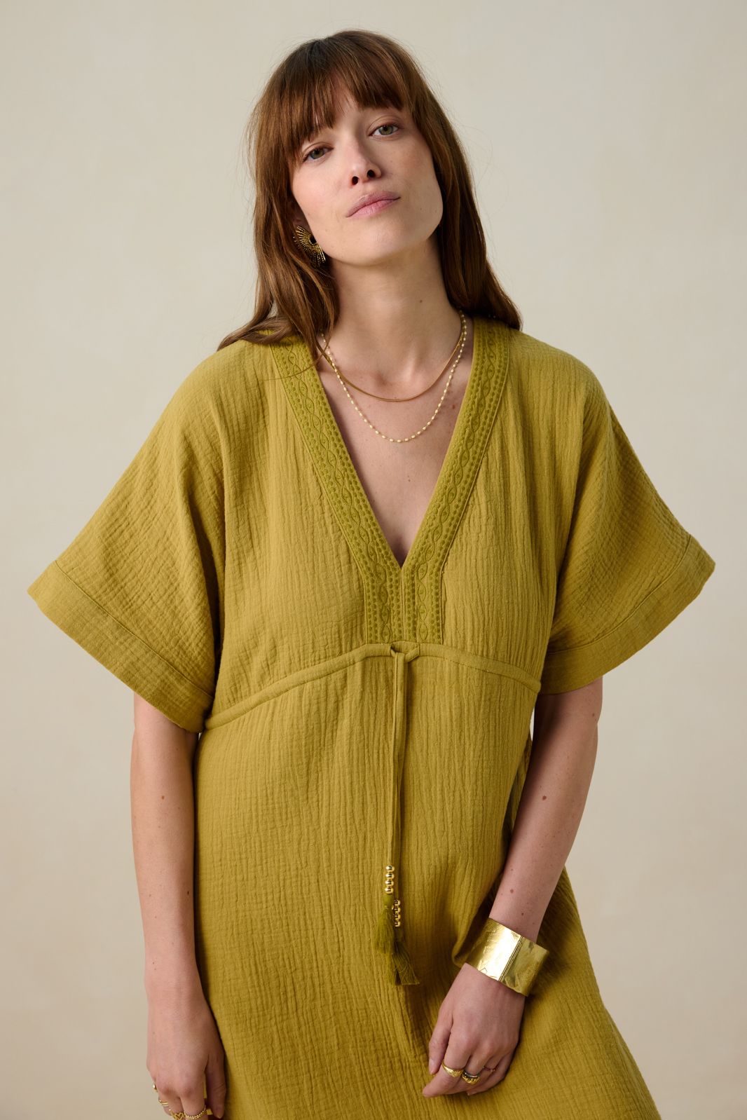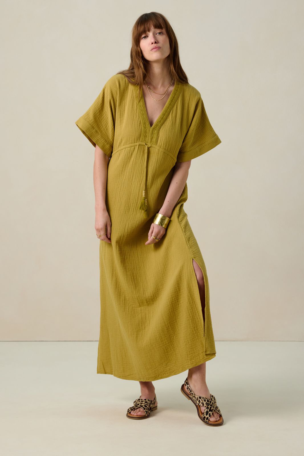 Hellgrünes Maxi-Kleid im Kaftan-Style der Marke Sissy-Boy. Das Kleid hat einen V-Ausschnitt, kurze Ärmel, eine Knopfleiste auf der Rückseite, zwei Schlitze und ist aus angenehmer Musselin-Baumwolle gearbeitet. Material: 100% Baumwolle.