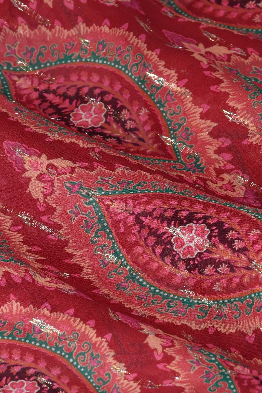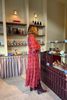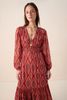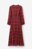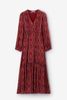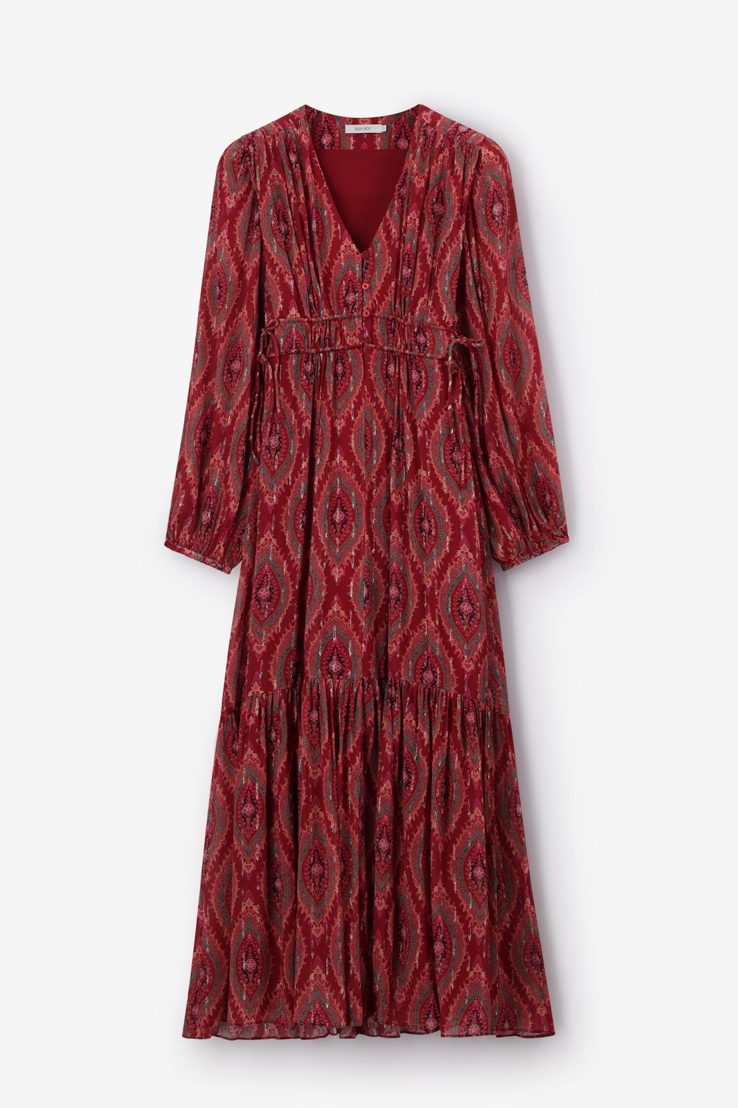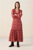 Gemustertes rotes Maxi-Kleid der Marke Sissy-Boy. Das Kleid hat lange Puffärmel, einen V-Ausschnitt, einen elastischen Bund, eine Knopfleiste und Rüschen am Saum. Das schöne Muster ist mit grünen und dunkelroten Details abgesetzt. Unser Model ist 1,77 m groß und trägt Größe S. Material: 97% Viskose, 3% Metallgarn.