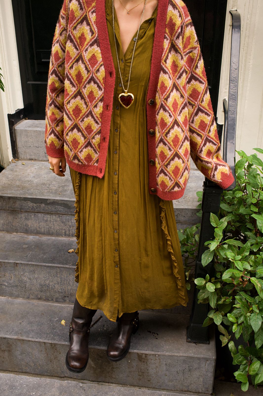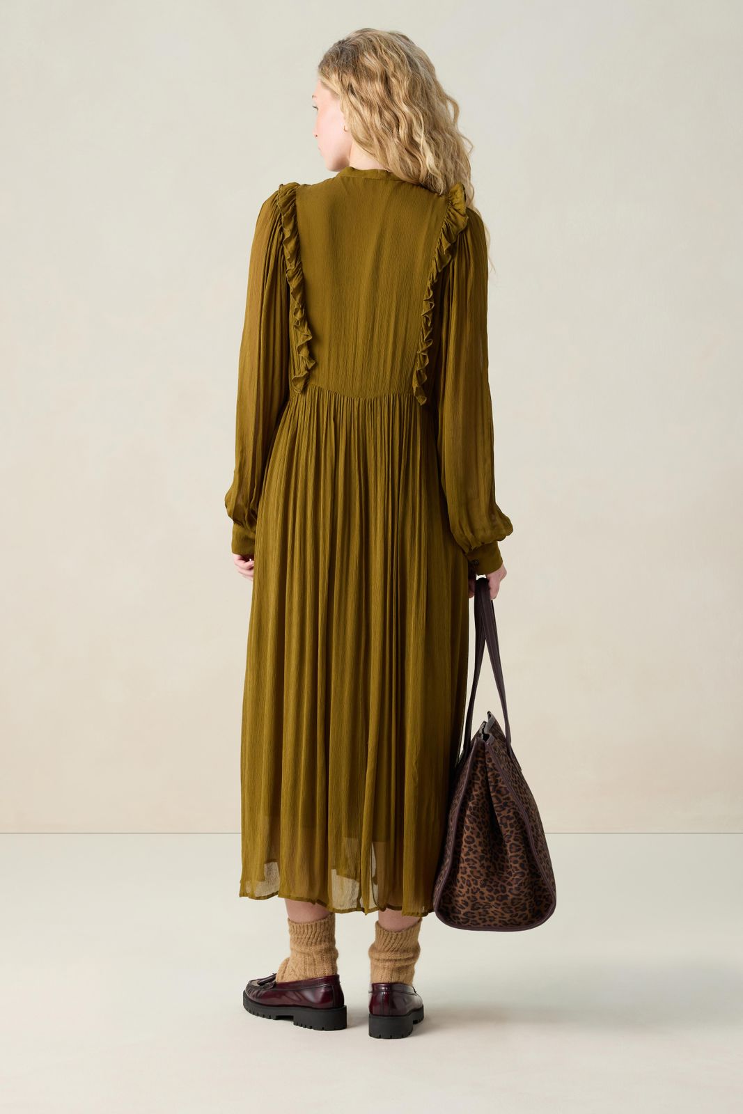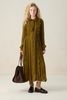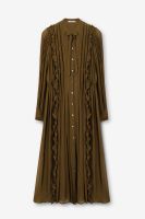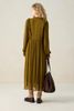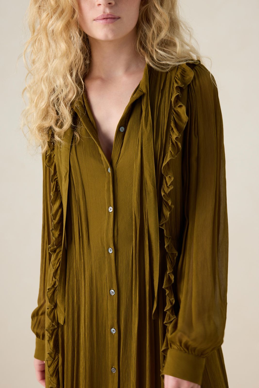 Grünes Maxi-Kleid der Marke Sissy-Boy. Das Kleid hat lange Ärmel, einen Ausschnitt mit Schleife, eine Knopfleiste, Puffärmel und feminine Falten-Details. Unser Model ist 1,71 m groß und trägt Größe S. Material: 100% Viskose.
