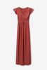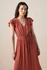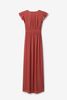 Rotes Maxi-Kleid mit Rüschen der Marke Sissy-Boy. Das Kleid hat einen V-Ausschnitt, kurze Rüschenärmel, einen elastischen Bund und Smok-Details. Material: 100% Viskose.
