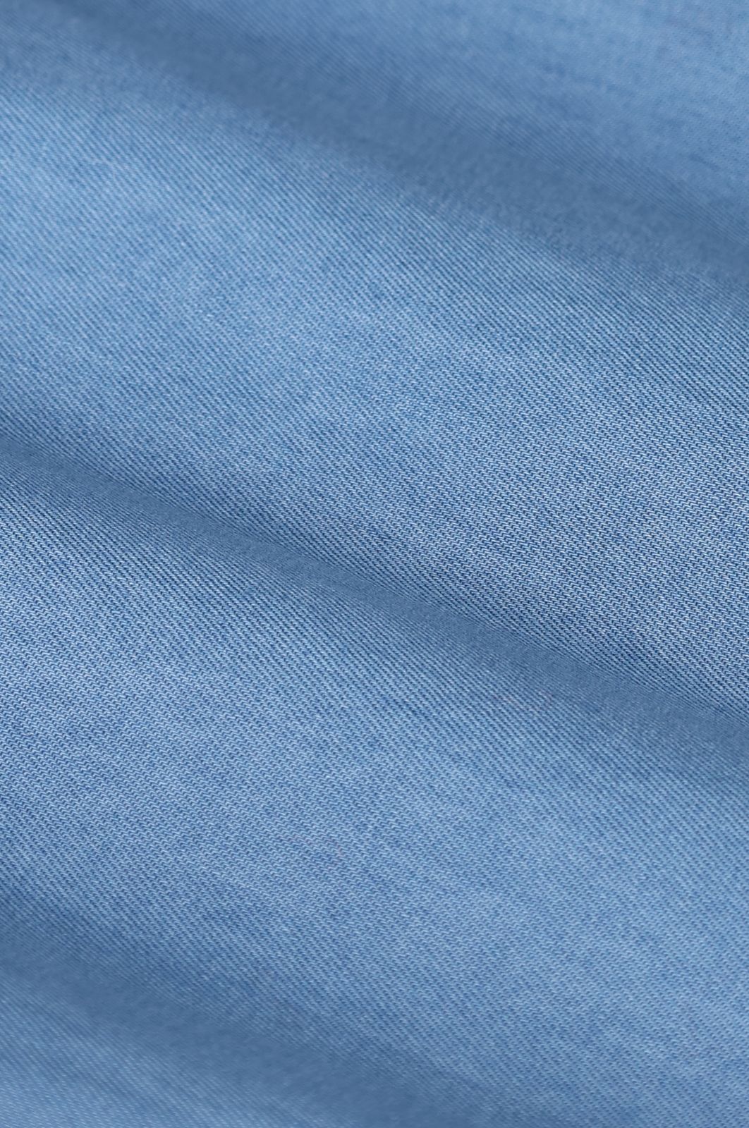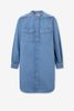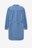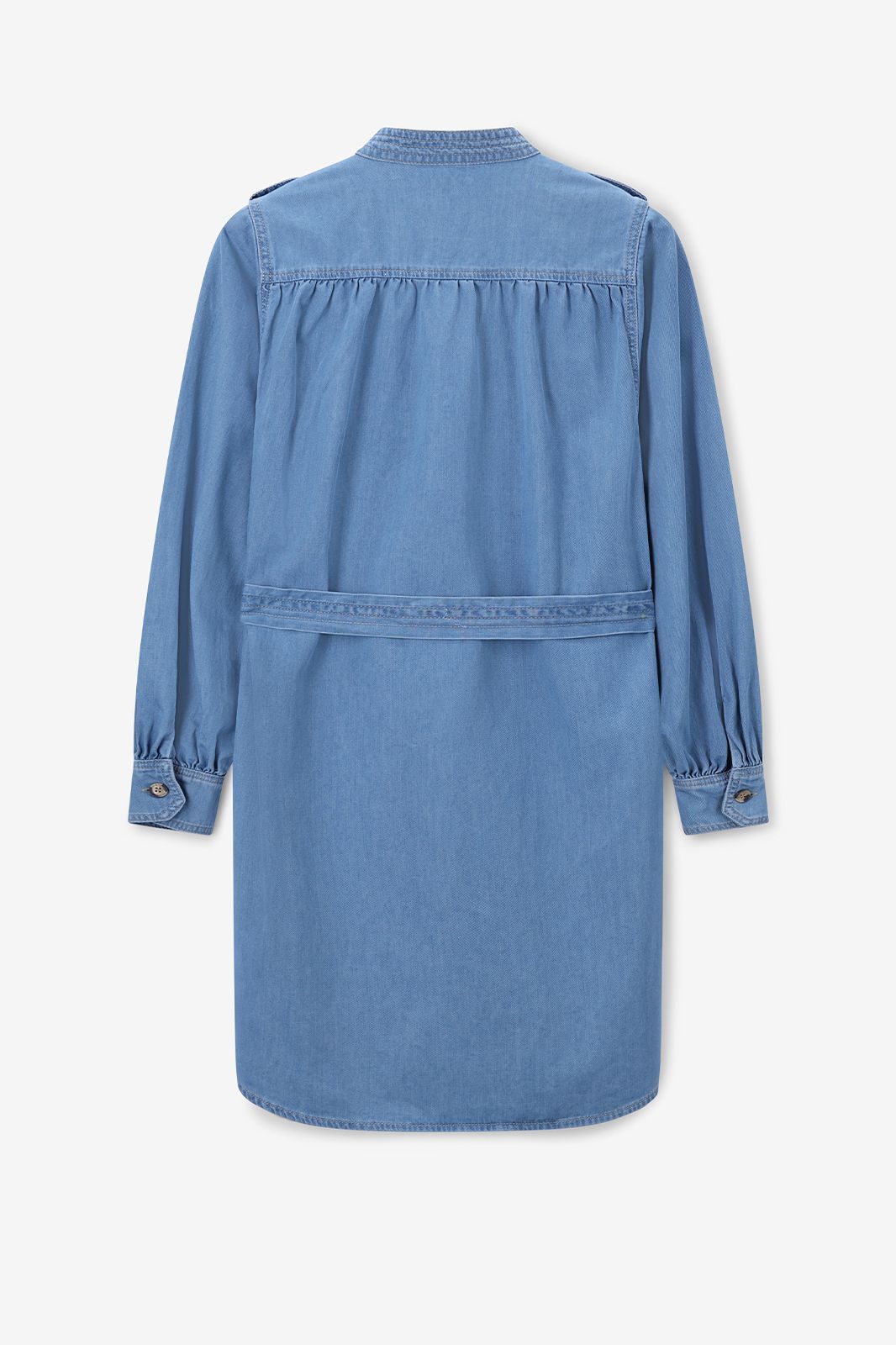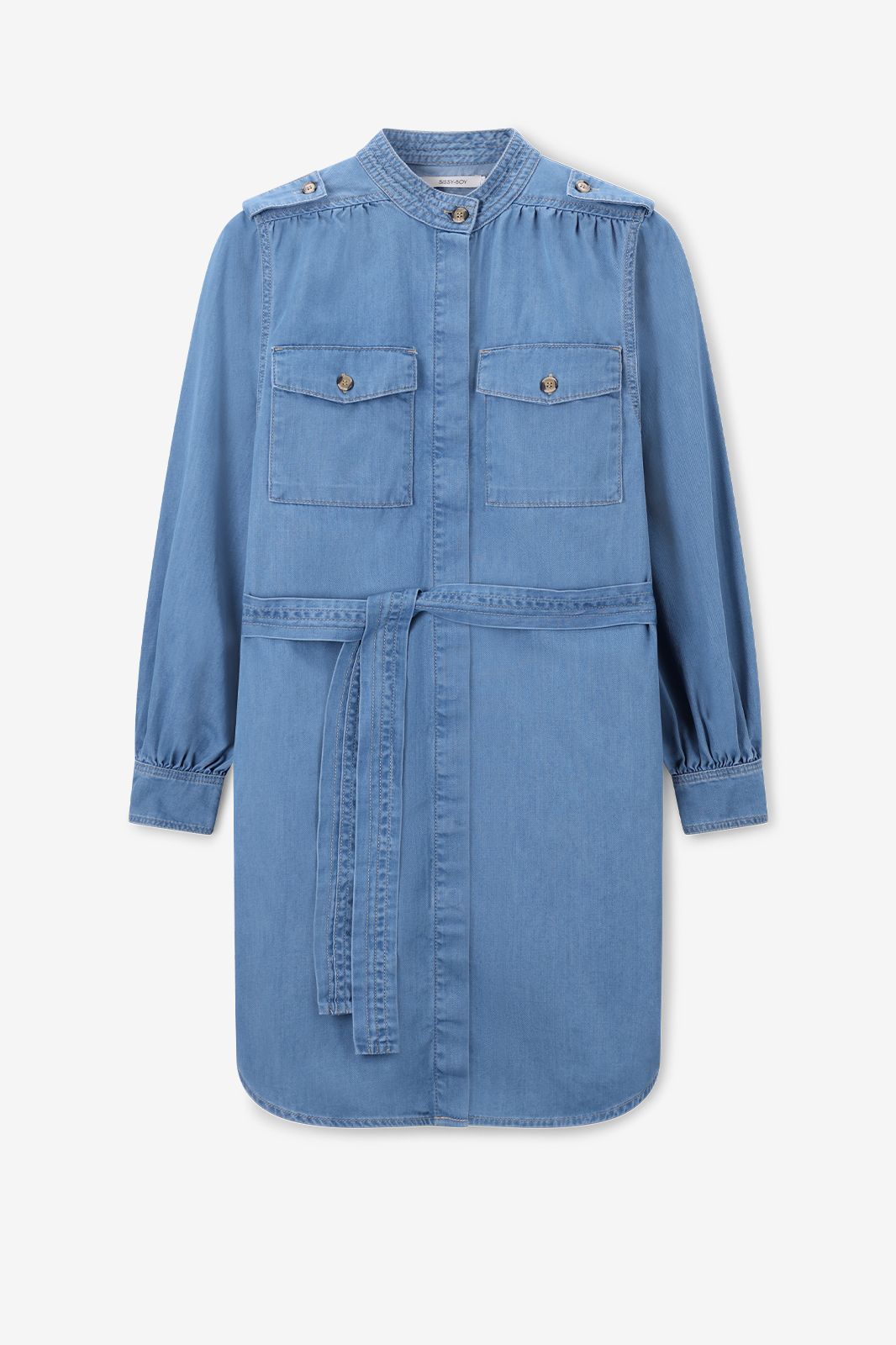 Blaues Midi-Kleid aus Denim der Marke Sissy-Boy. Das Kleid hat lange Puffärmel, eine Knopfleiste, einen hohen Ausschnitt, zwei Brusttaschen, einen abnehmbaren Gürtel und Falten-Details an den Schultern. Material: 100% Baumwolle.