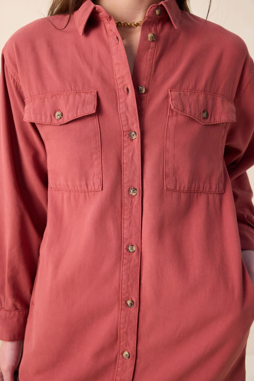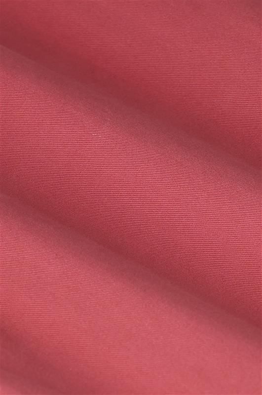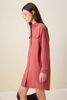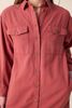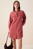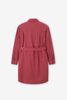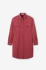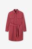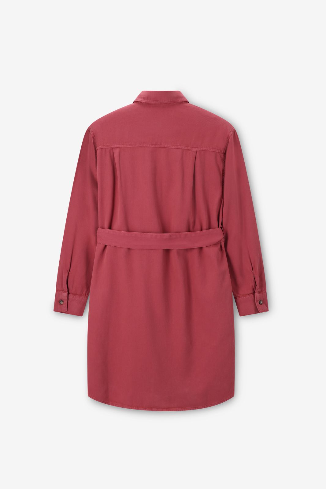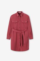 Dunkelrotes Midi-Kleid mit Taillenband der Marke Sissy-Boy. Das Kleid hat lange Puffärmel, einen Kragen, eine Knopfleiste und zwei aufgenähte Brusttaschen. Material: 100% Baumwolle.