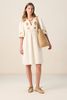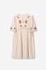 Weißes Kleid mit Stickerei-Details der Marke Sissy-Boy. Das Kleid hat einen V-Ausschnitt, Dreiviertelärmel, Falten-Details am Bund und eine wunderschöne Muschel-Stickerei mit Perlen auf der Brust. Material: 100% Baumwolle.