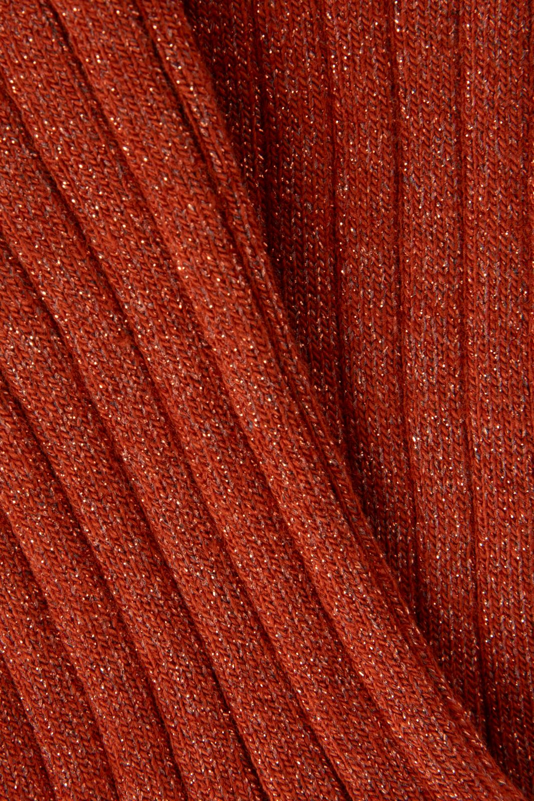 Rote Ripp-Socken der Marke Sissy-Boy. Die Socken sind mit goldfarbenen Glitzer-Details abgesetzt. Material: 60% Baumwolle, 28% Polyamid, 10% Polyester, 2% Elasthan.