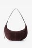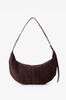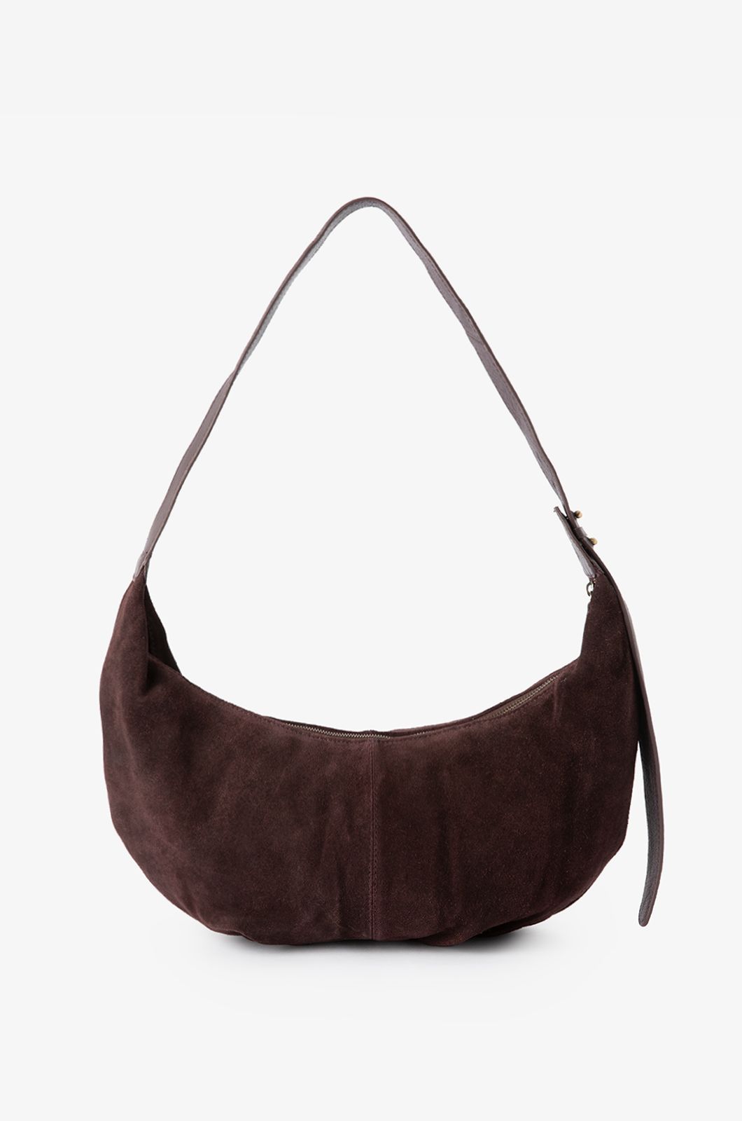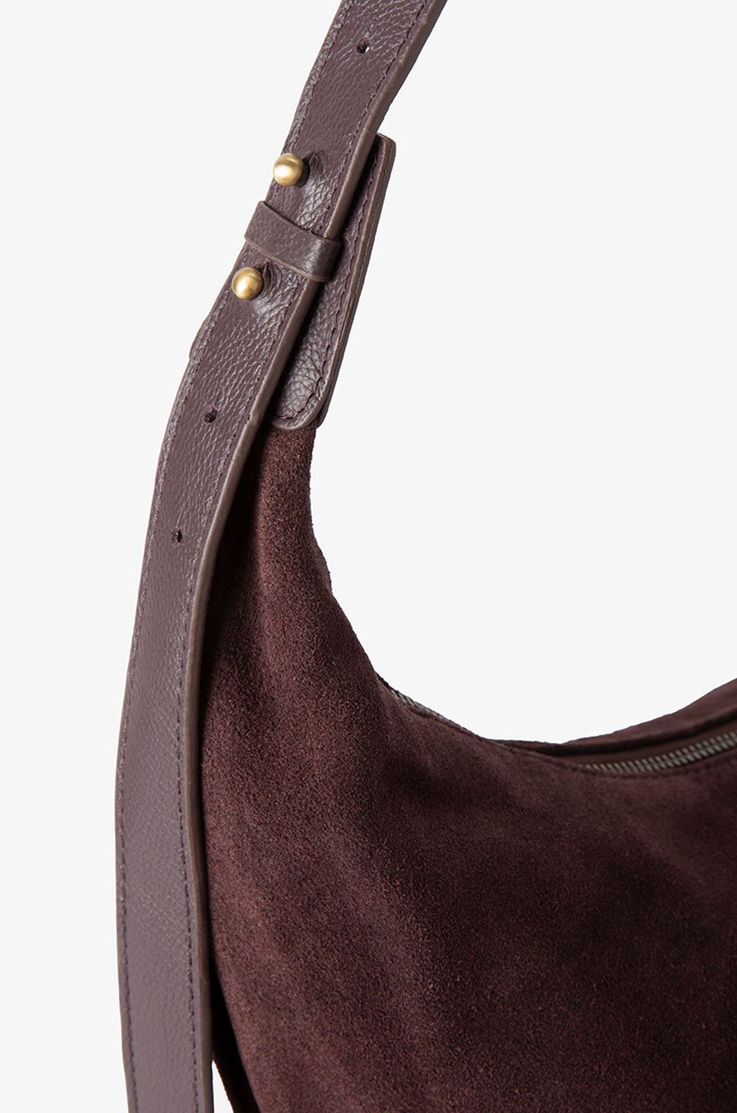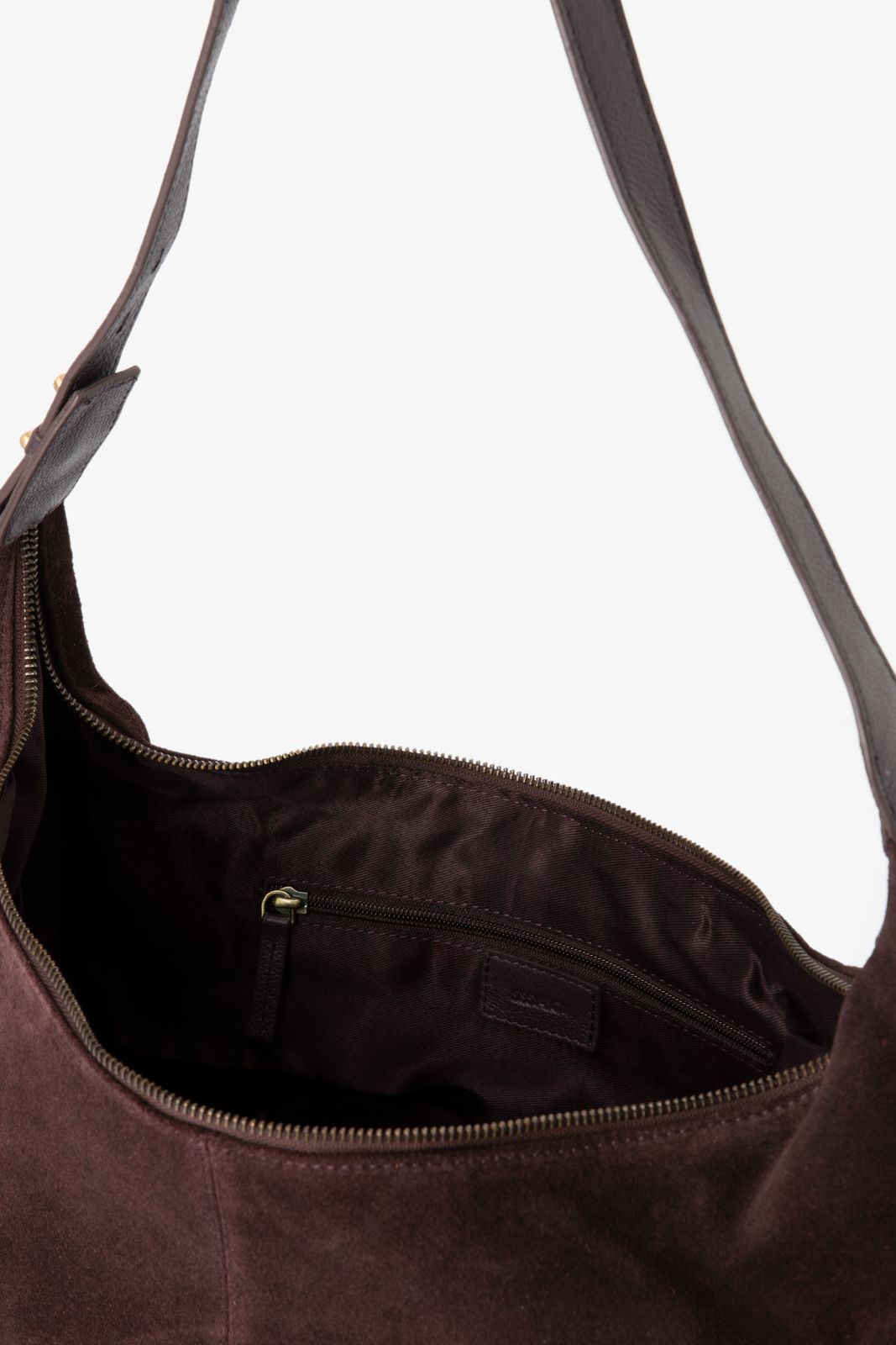 Braune Schultertasche aus Veloursleder der Marke Sissy-Boy. Die Tasche hat einen Reißverschluss, ein kleines Innenfach mit Reißverschluss und einen verstellbaren Trageriemen, sodass du sie auch als Crossbody Bag tragen kannst. Länge des Tragriemens: 70 cm. Material: 100% Veloursleder.