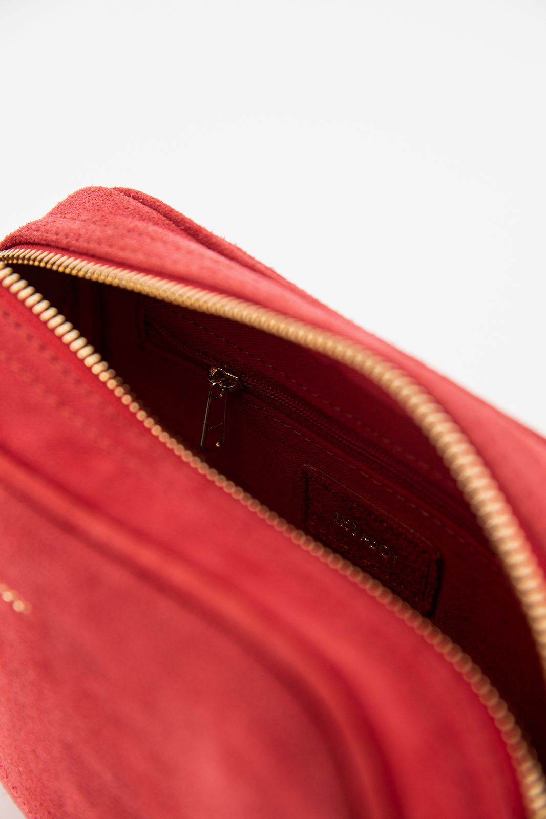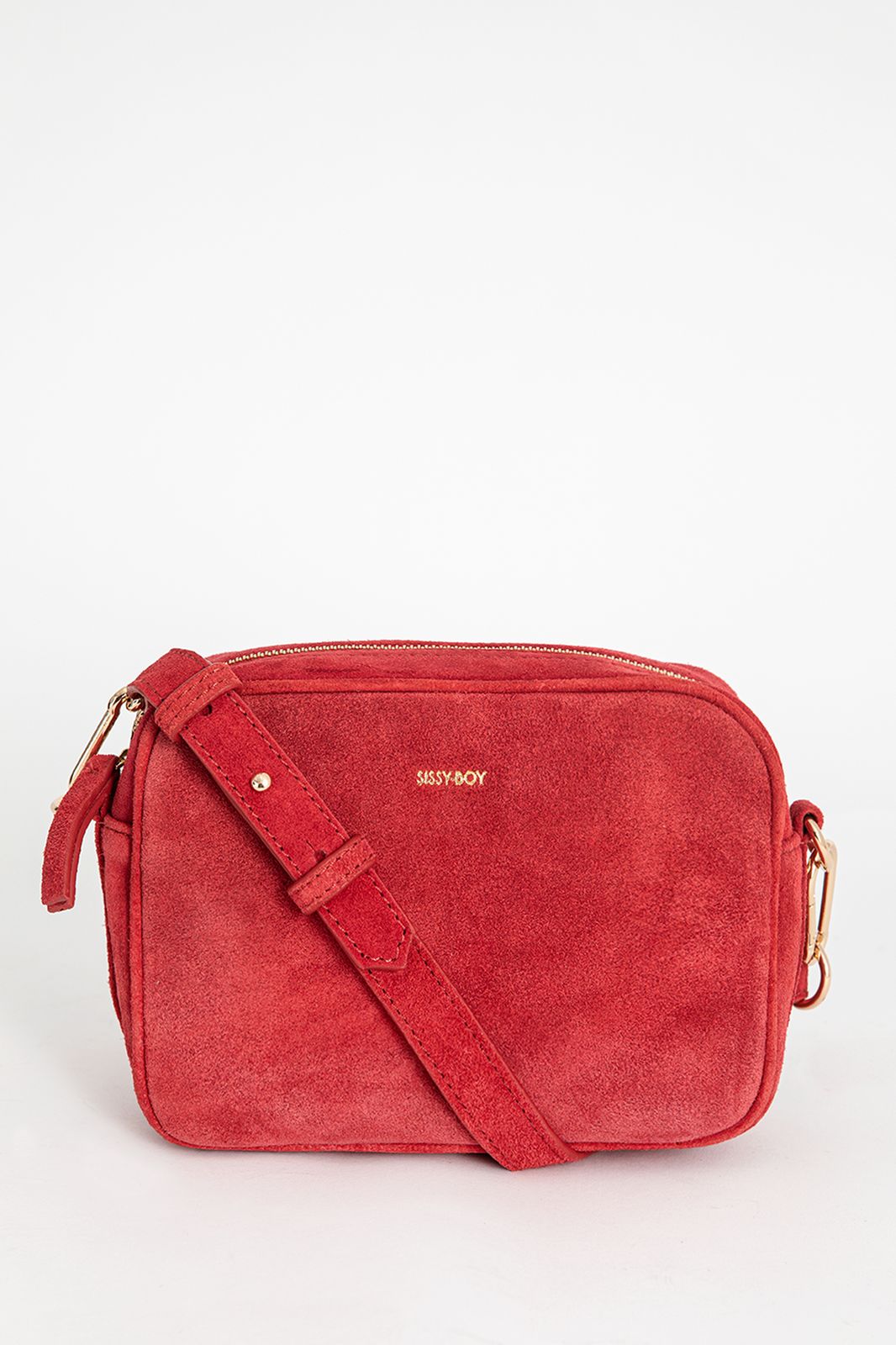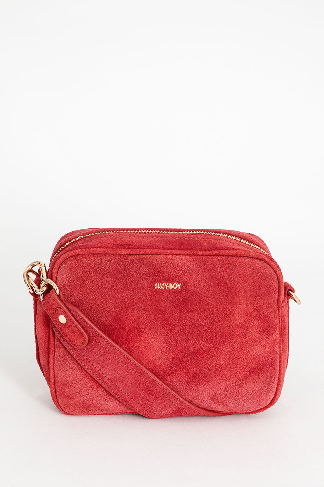 Kleine rote Schultertasche aus Veloursleder der Marke Sissy-Boy. Die Tasche ist mit zwei Tragriemen versehen und lässt sich somit auf unterschiedliche Weise tragen!