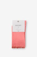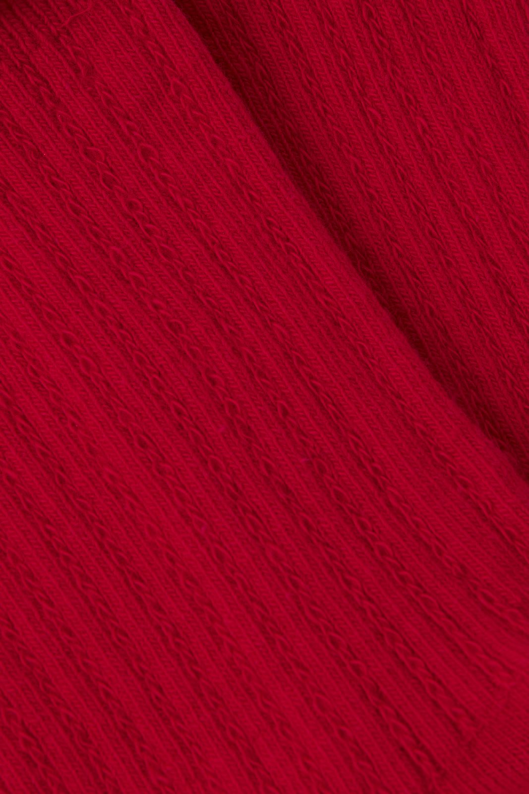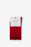 Rote Socken der Marke Sissy-Boy. Die Socken haben ein Rippmuster und einen verspielten Rüschenrand am Saum. Material: 80% Baumwolle, 17% Polyester, 3% Elasthan.