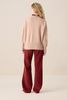 Dunkelrote Cordhose mit geradem Schnitt, Seitentaschen und zwei Paspeltaschen auf der Rückseite. Die Hose wird mit einem Knopf und einem Reißverschluss geschlossen. Unser Model ist 1,71 m groß und trägt Größe S. Material: 100% Baumwolle.