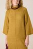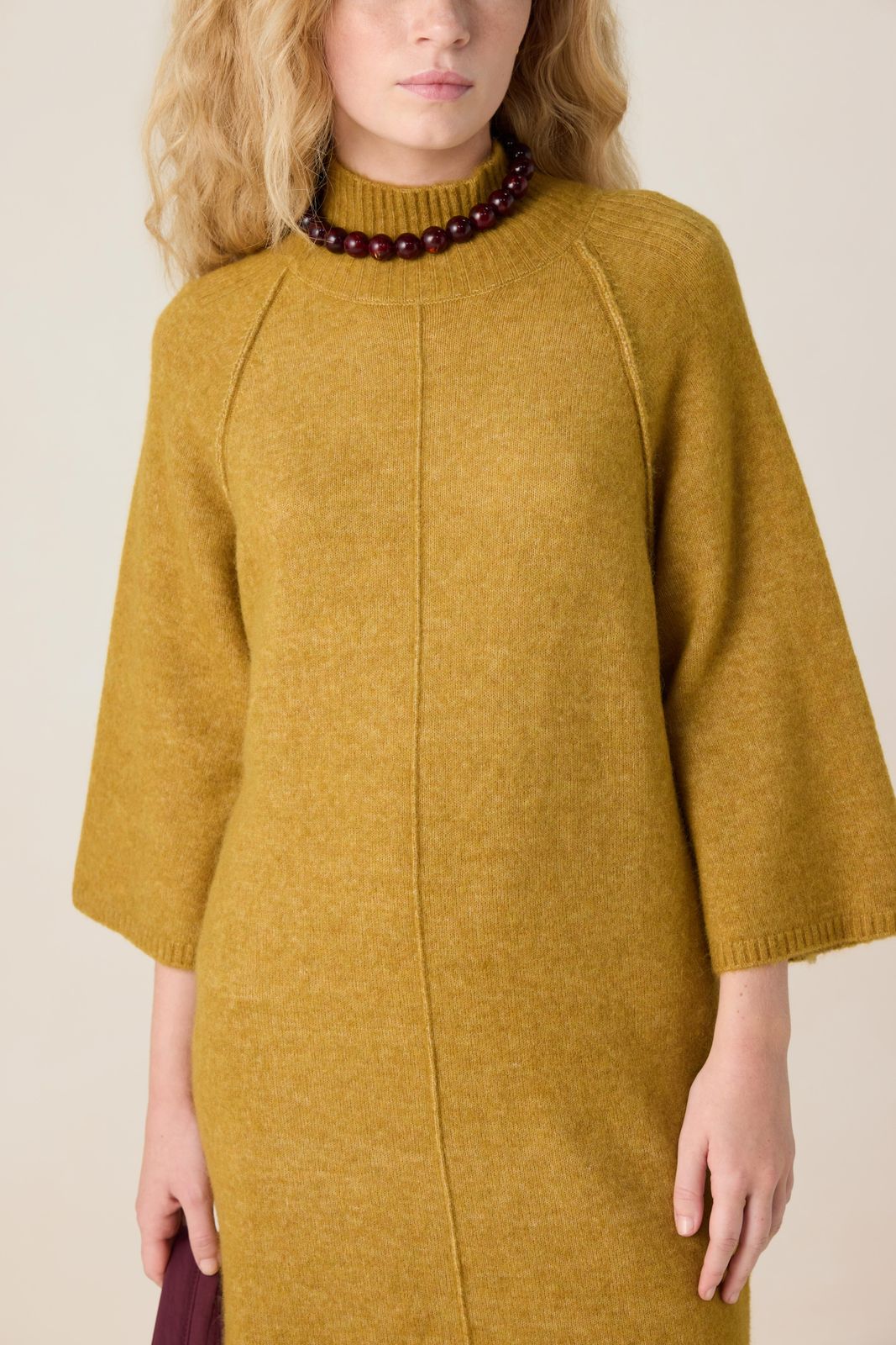 Grünes Strickkleid der Marke Sissy-Boy. Das Kleid hat Dreiviertelärmel, einen Stehkragen und ein Rippmuster am Kragen und am unteren Saumabschluss. Unser Model ist 1,71 m groß und trägt Größe S. Material: 38% Wolle, 38% Polyamid, 16% Alpaka, 8% Elasthan.