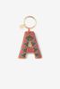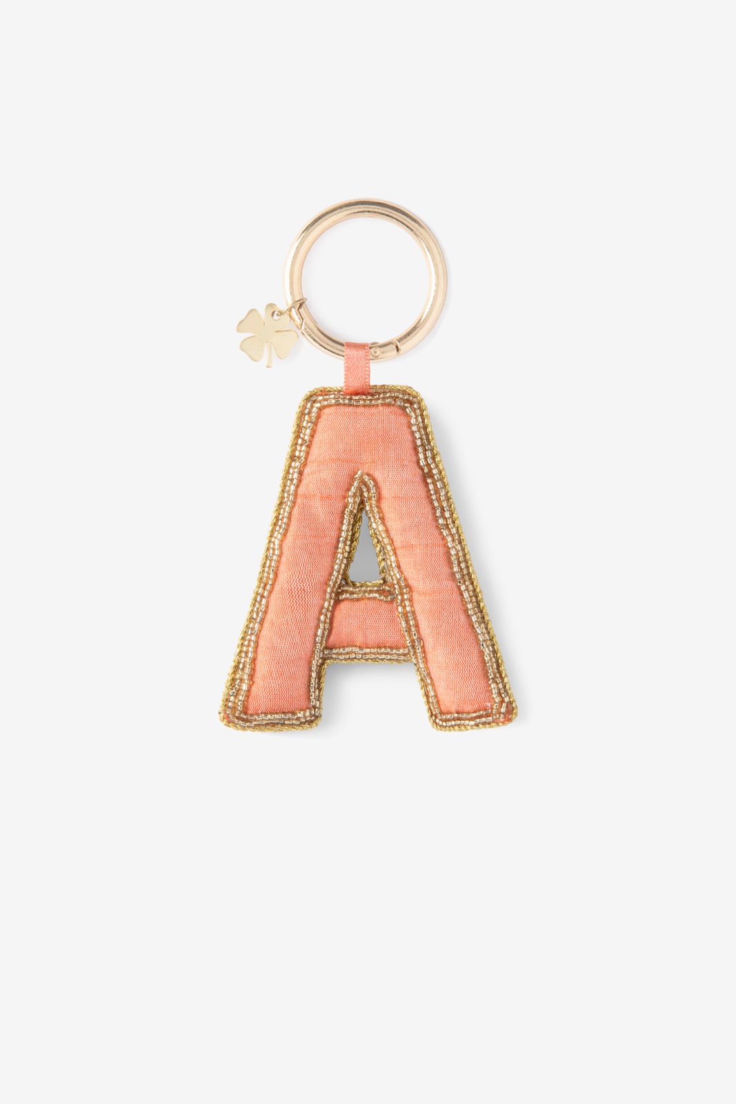 Hellroter Taschen-Charm der Marke Sissy-Boy. Der Anhänger hat die Form des Buchstaben A, ist mit Perlen bestickt und mit einem goldfarbenen Clip-Verschluss versehen. Material: 70% Glas, 30% Polyester.