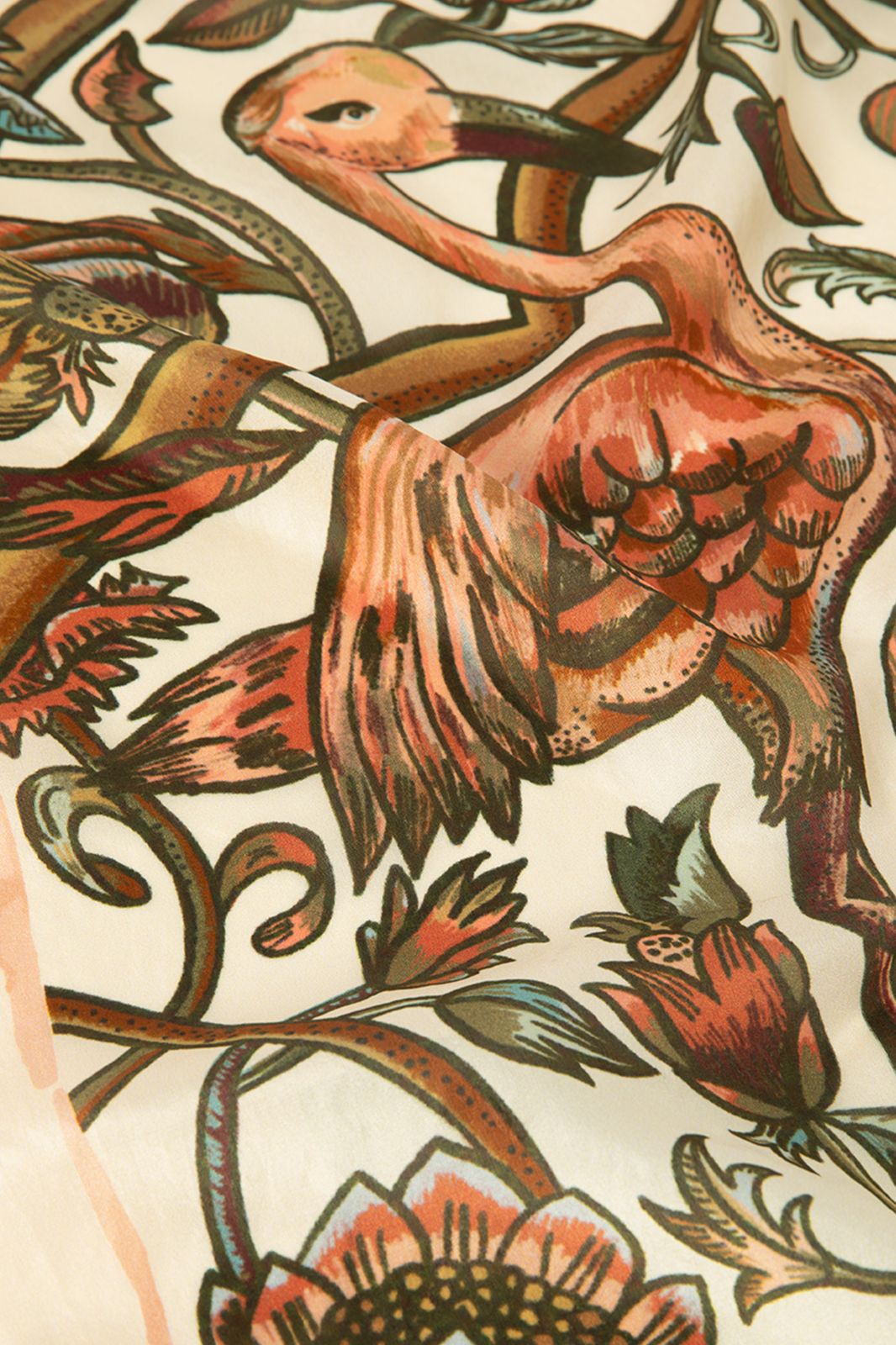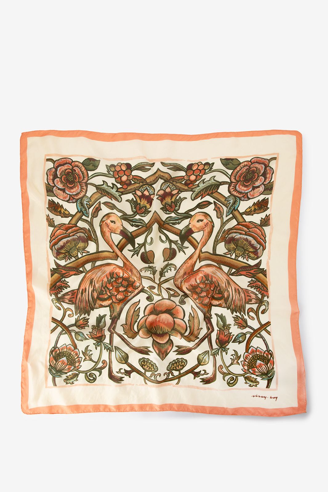 Weißes Tuch der Marke Sissy-Boy. Das Tuch ist mit einem wunderschönen Print aus Blumen und Flamingos versehen. Maβe: 67x69 cm. Material: 100% Seide.