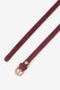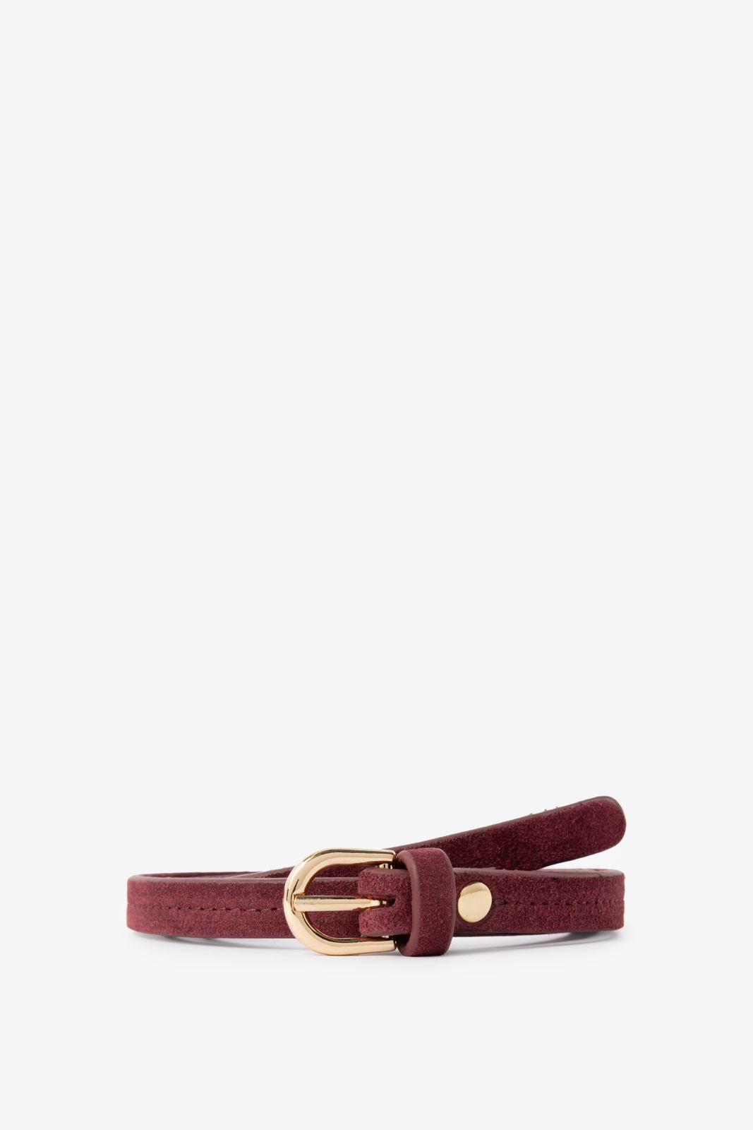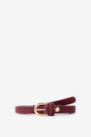 Dunkelroter Veloursleder-Gürtel der Marke Sissy-Boy. Der Gürtel hat eine goldfarbene Schnalle. Material: 100% Veloursleder.