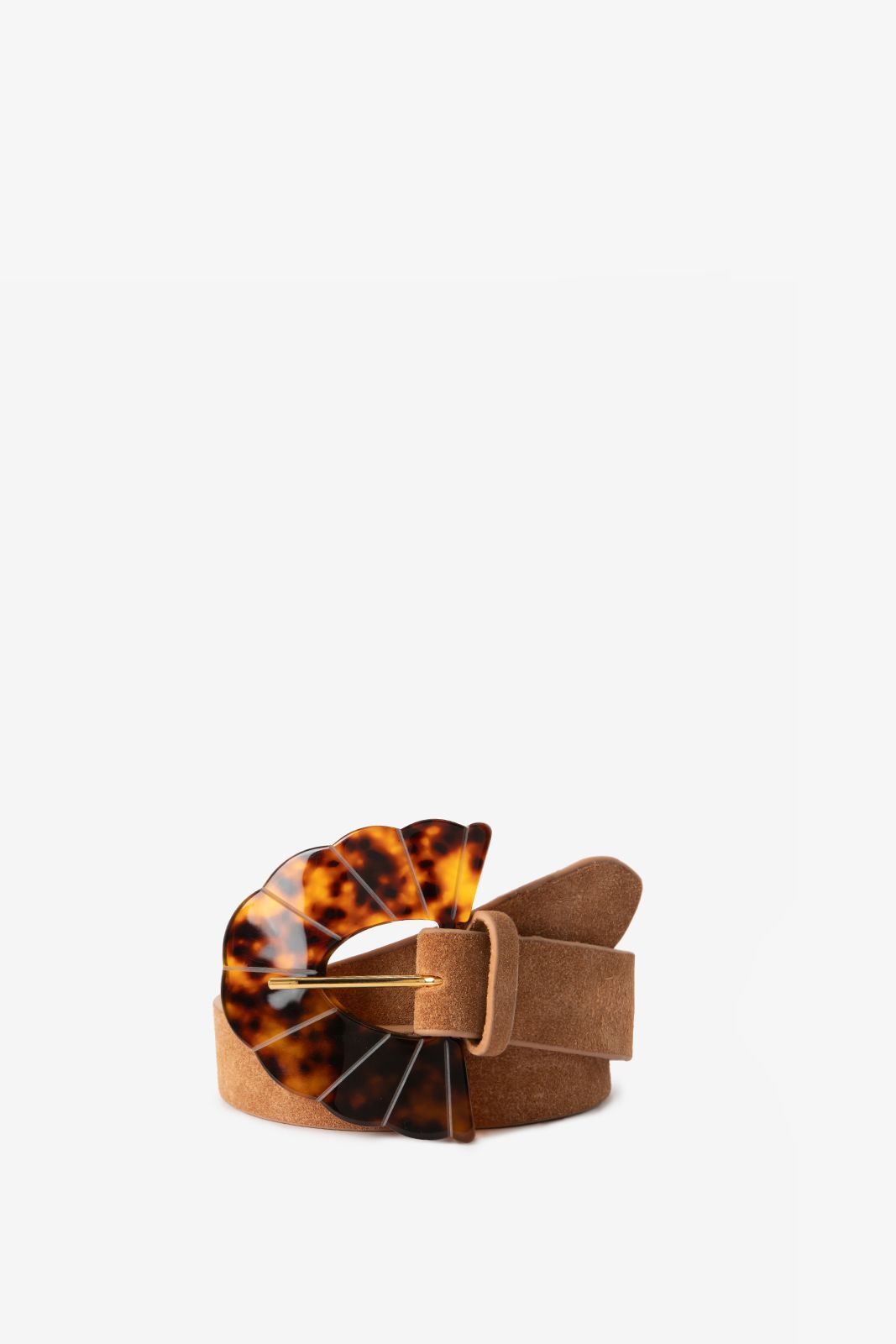 Hellbrauner Veloursleder-Gürtel der Marke Sissy-Boy. Der Gürtel hat eine wunderschöne braune Schnalle aus Resin. Material: 100% Veloursleder. Maβe der Schnalle: 8x7 cm.