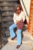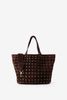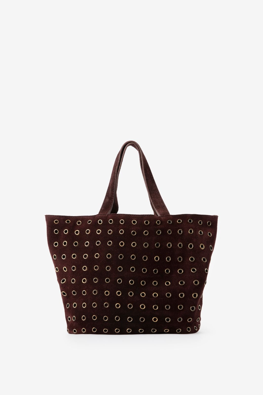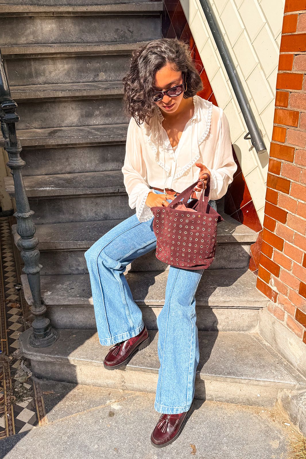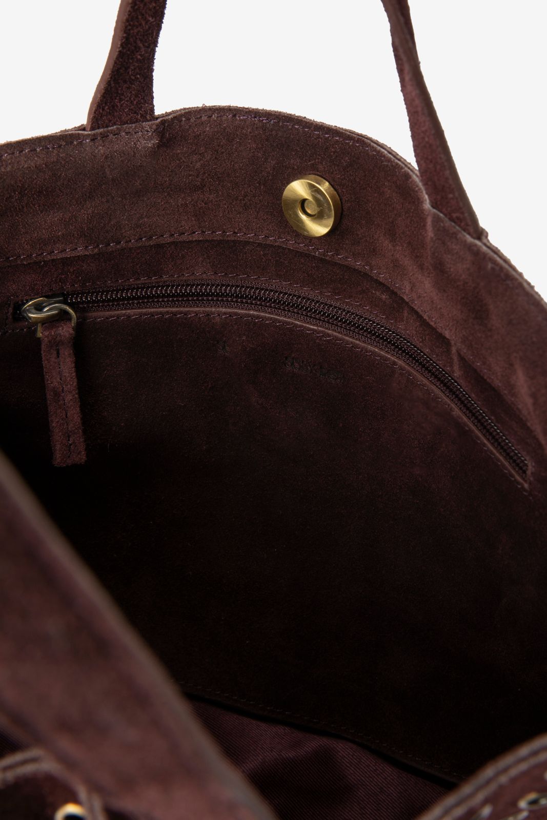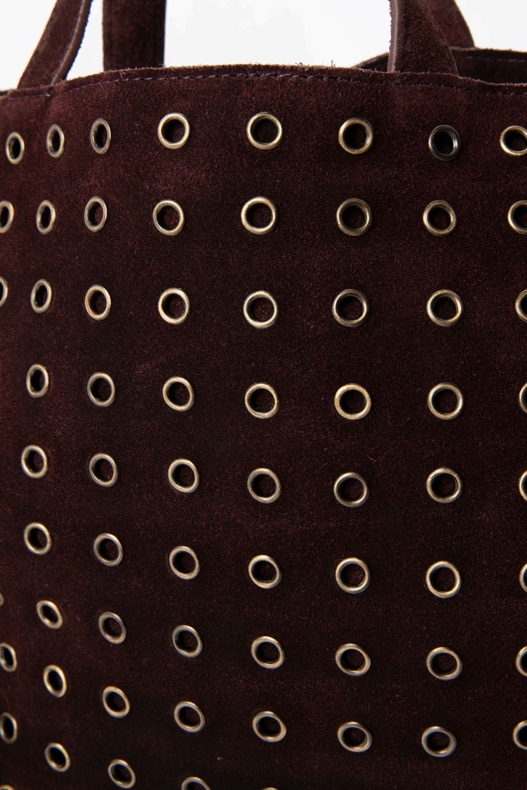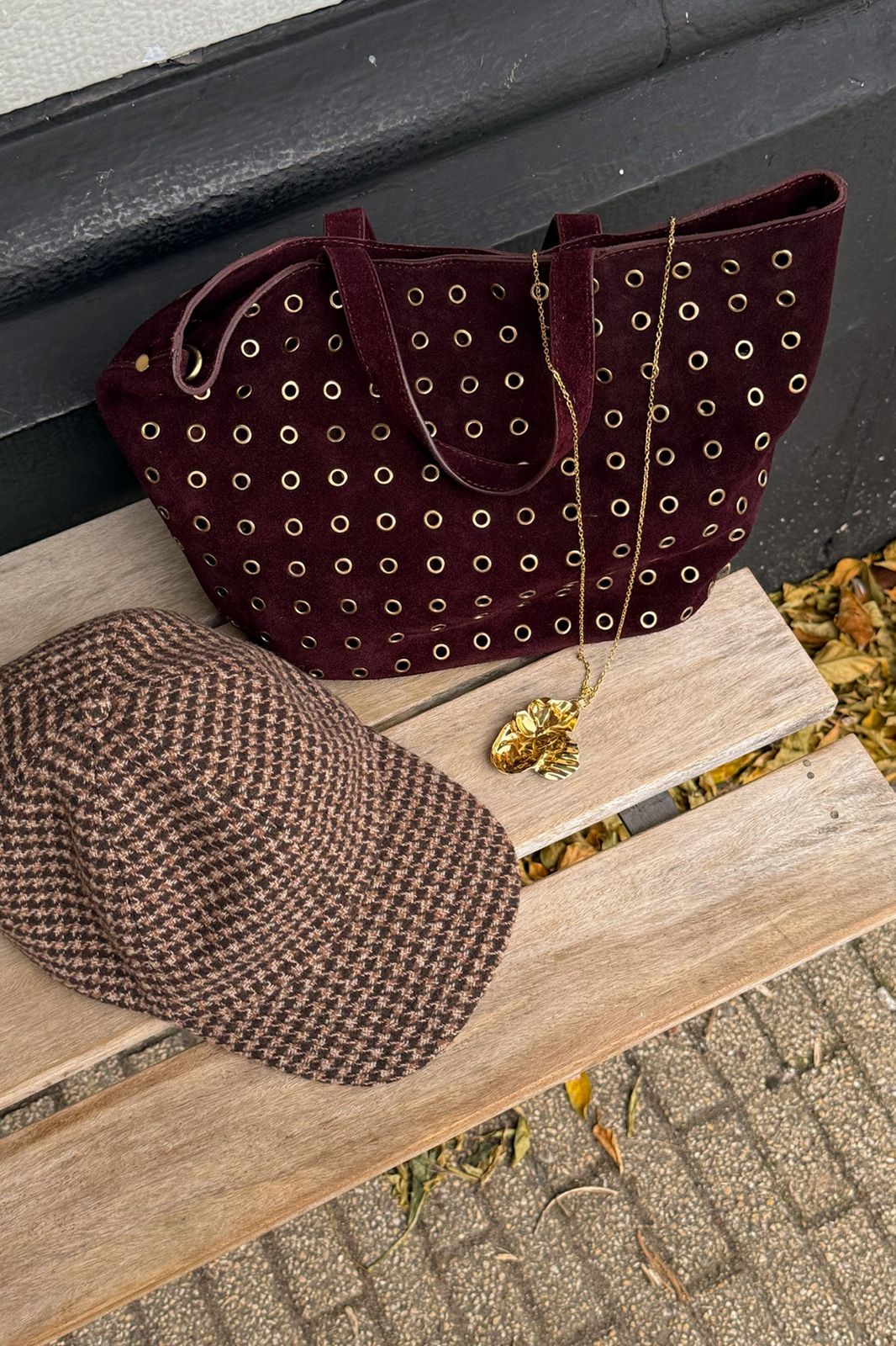 Dunkelrote Veloursledertasche mit Nieten der Marke Sissy-Boy. Die Tasche hat ein Innenfach mit Reißverschluss und ist mit edgy goldfarbenen Nieten versehen. Maβe: 23,5x38x12 cm. Länge der Henkel: 30 cm. Länge des abnehmbaren Trageriemens: 77 cm.