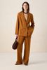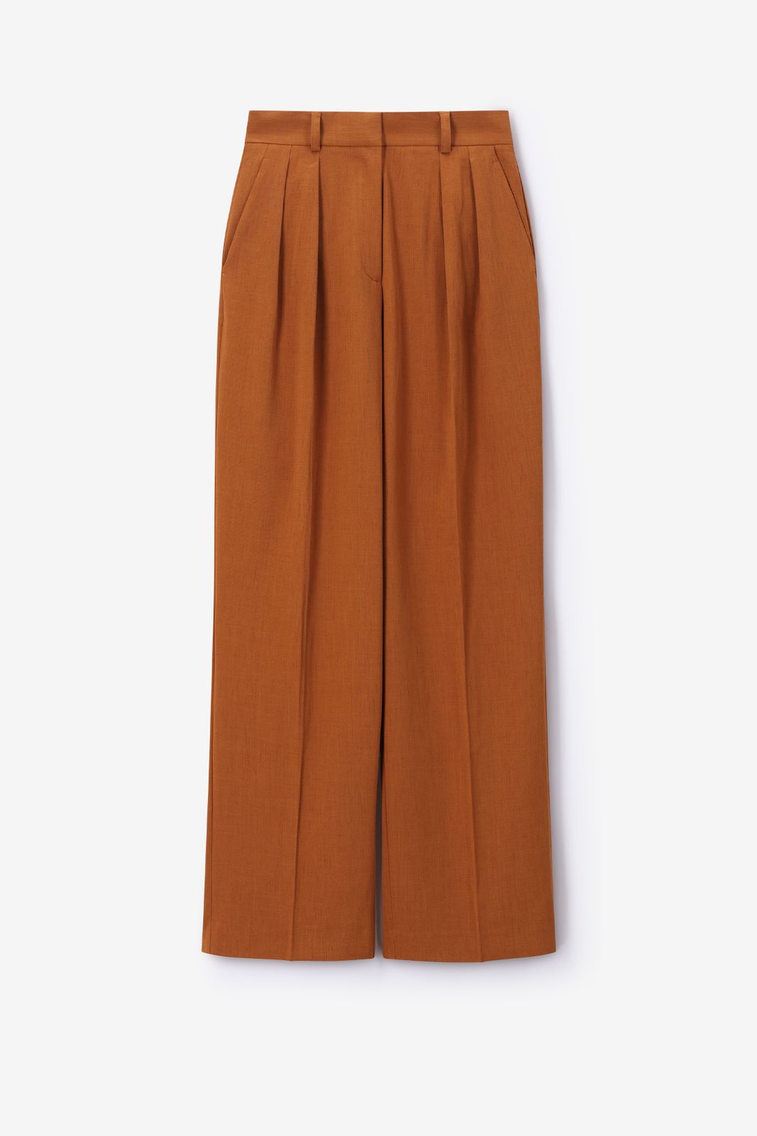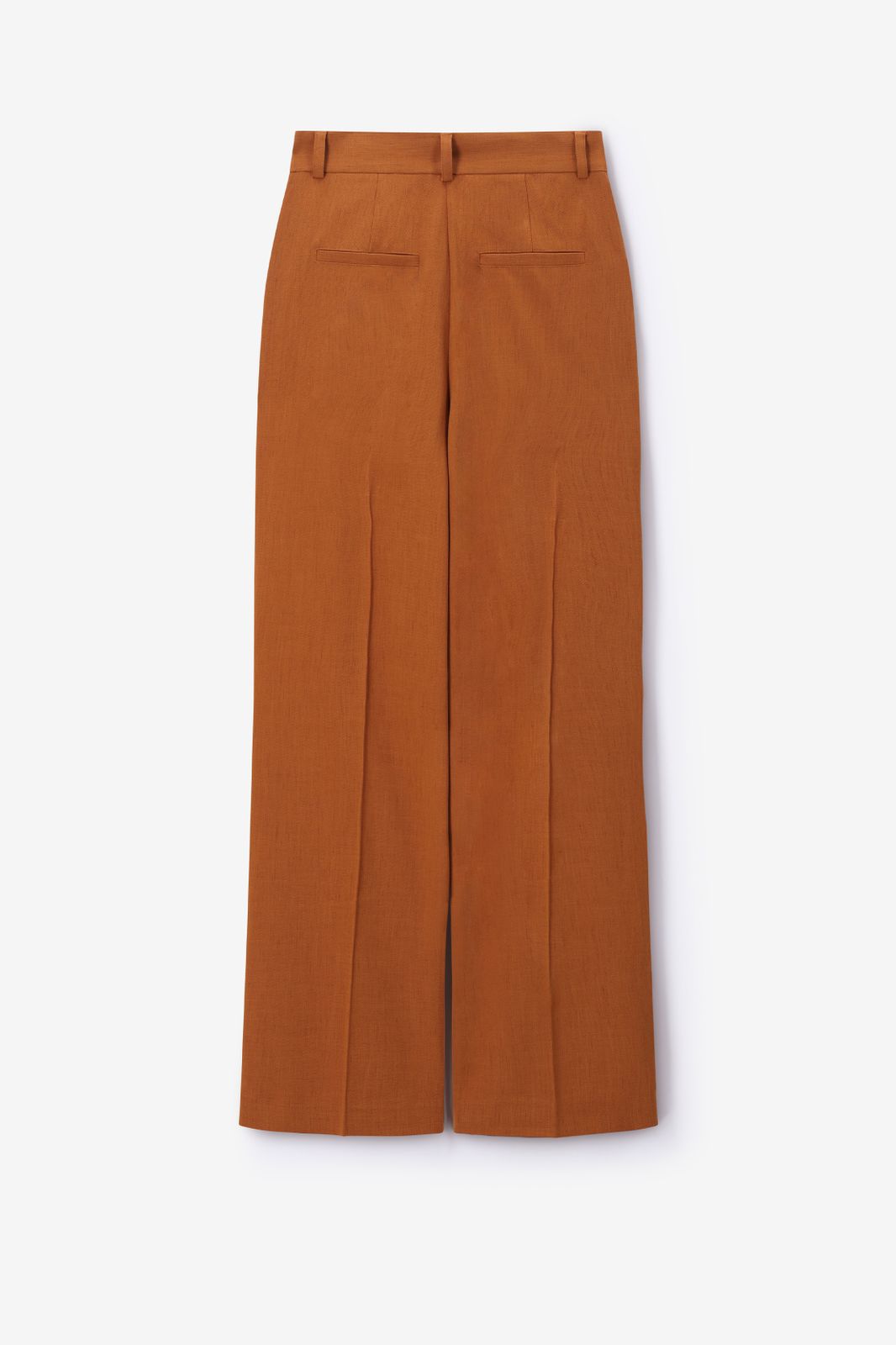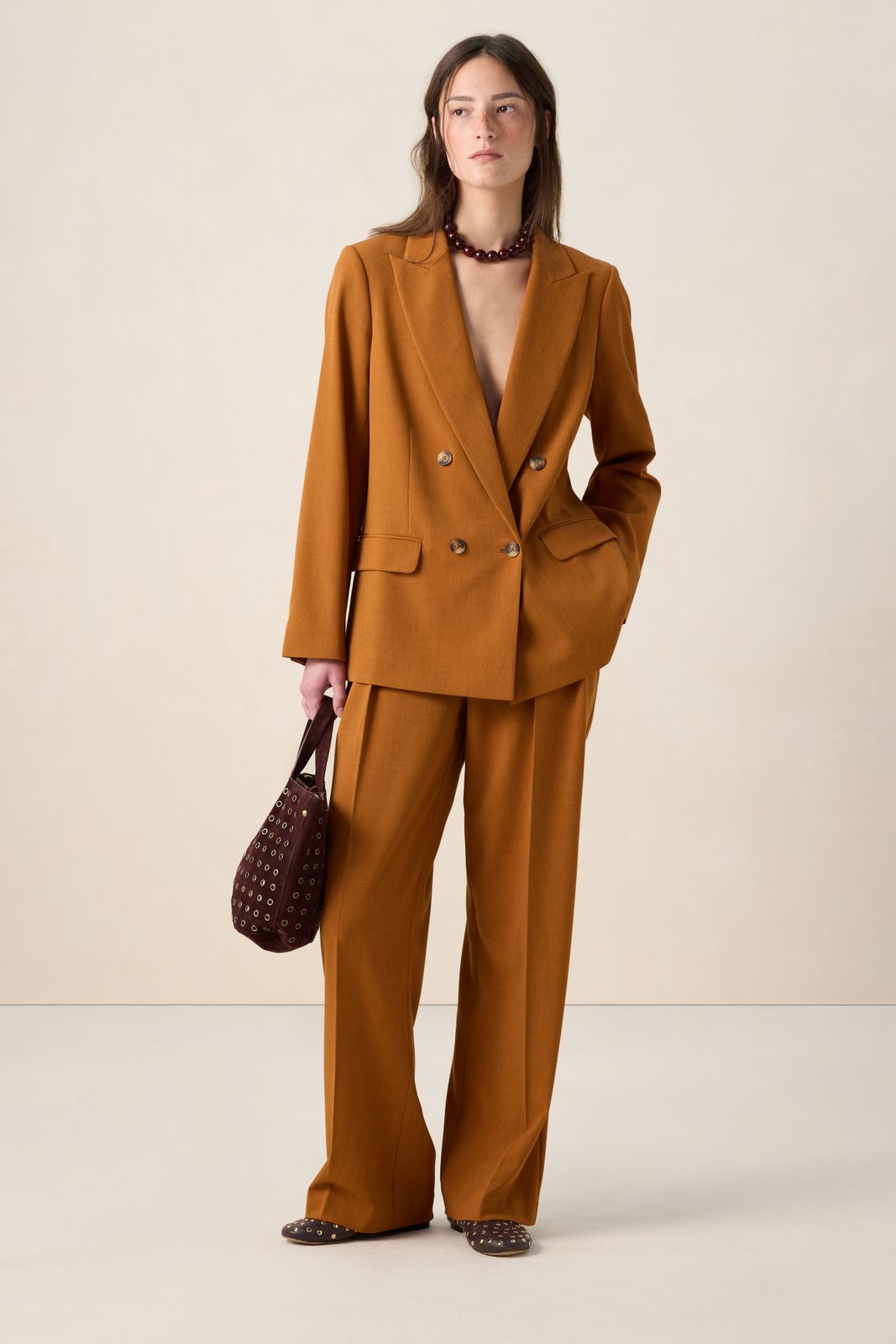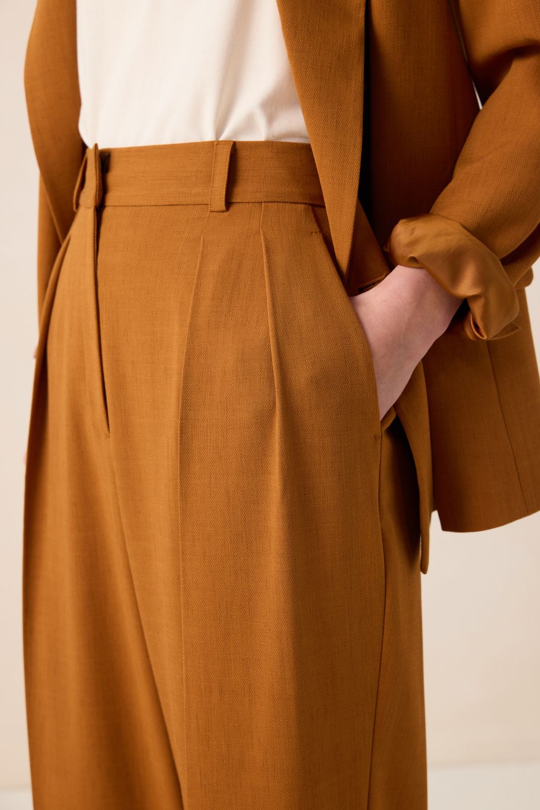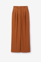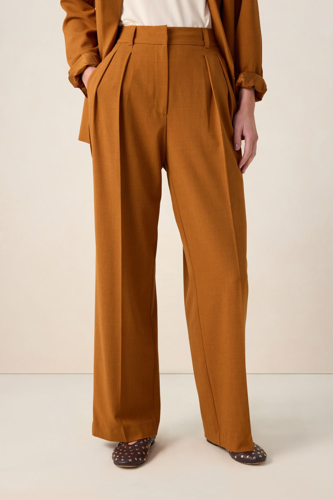Weite braune Hose der Marke Sissy-Boy. Die Hose hat eine hohe Taille, zwei seitliche Taschen, Paspeltaschen auf der Rückseite, Bundfalten auf der Vorderseite und wird mit einem Knopf und einem Reißverschluss geschlossen. Unser Model ist 1,77 m groß und trägt Größe S. Material: 48% Polyester, 48% Viskose, 4% Elasthan.