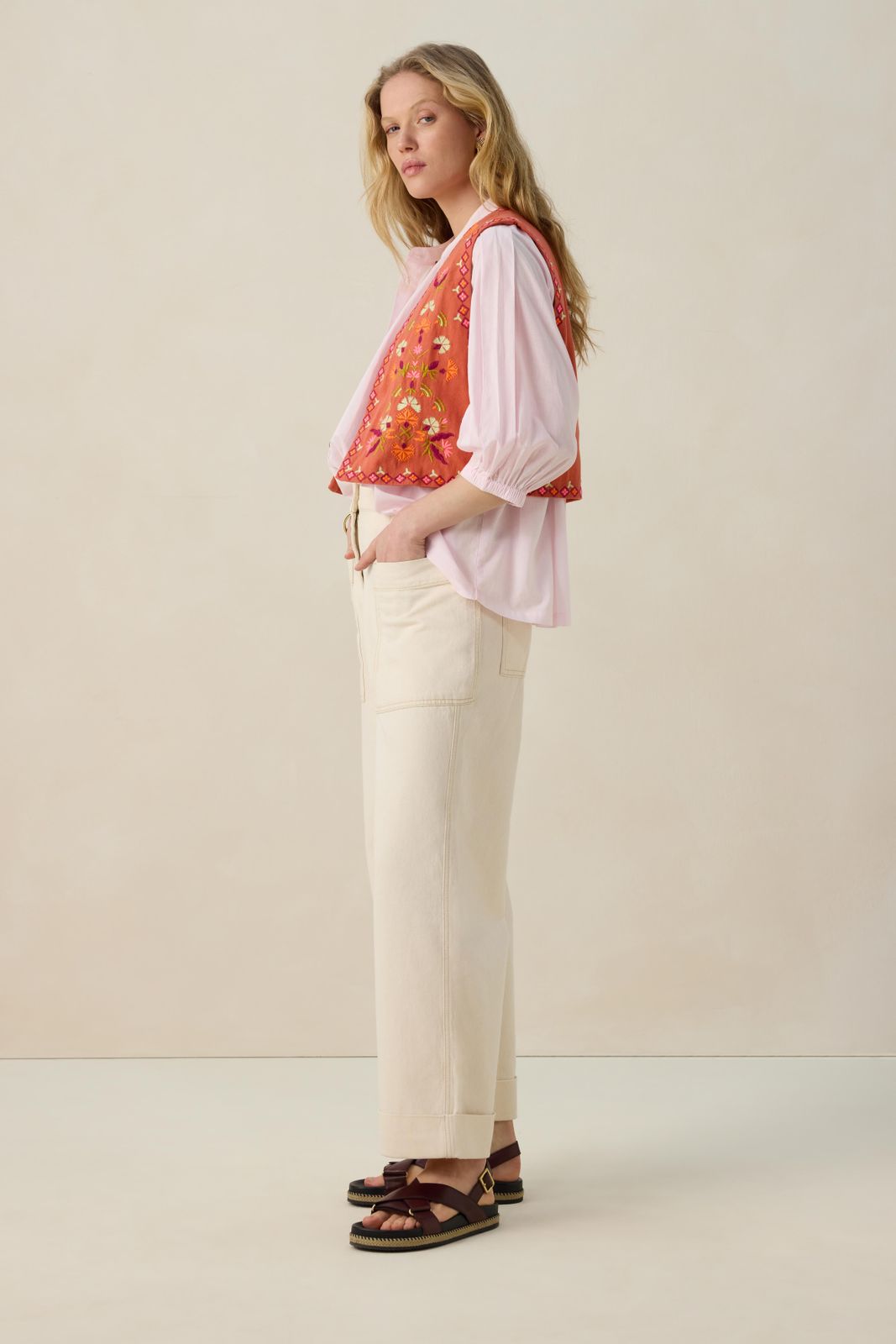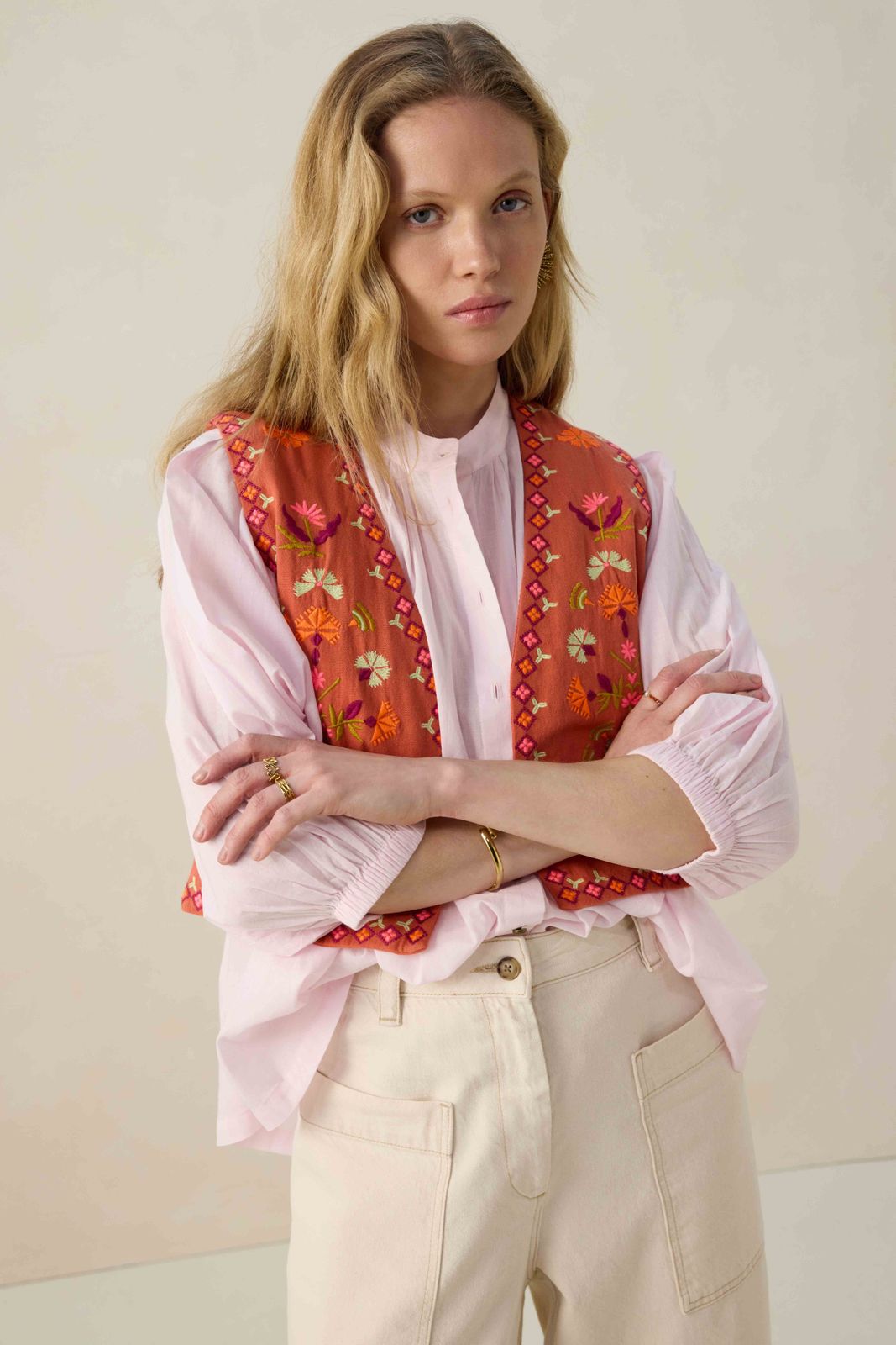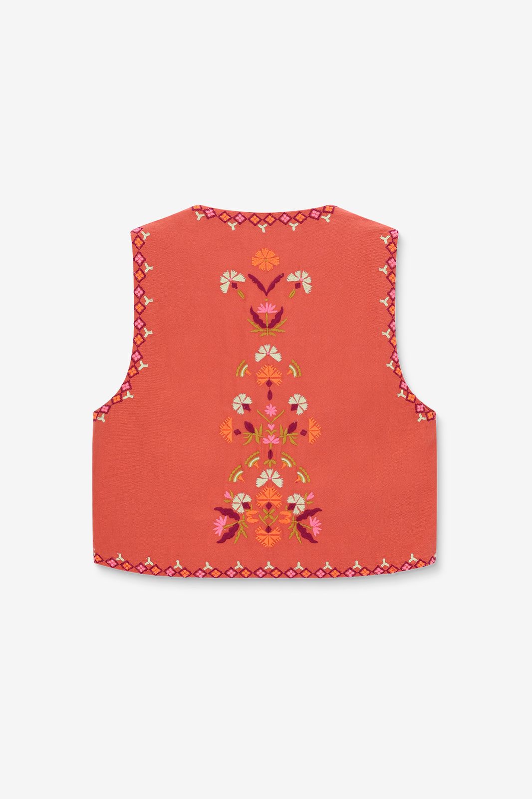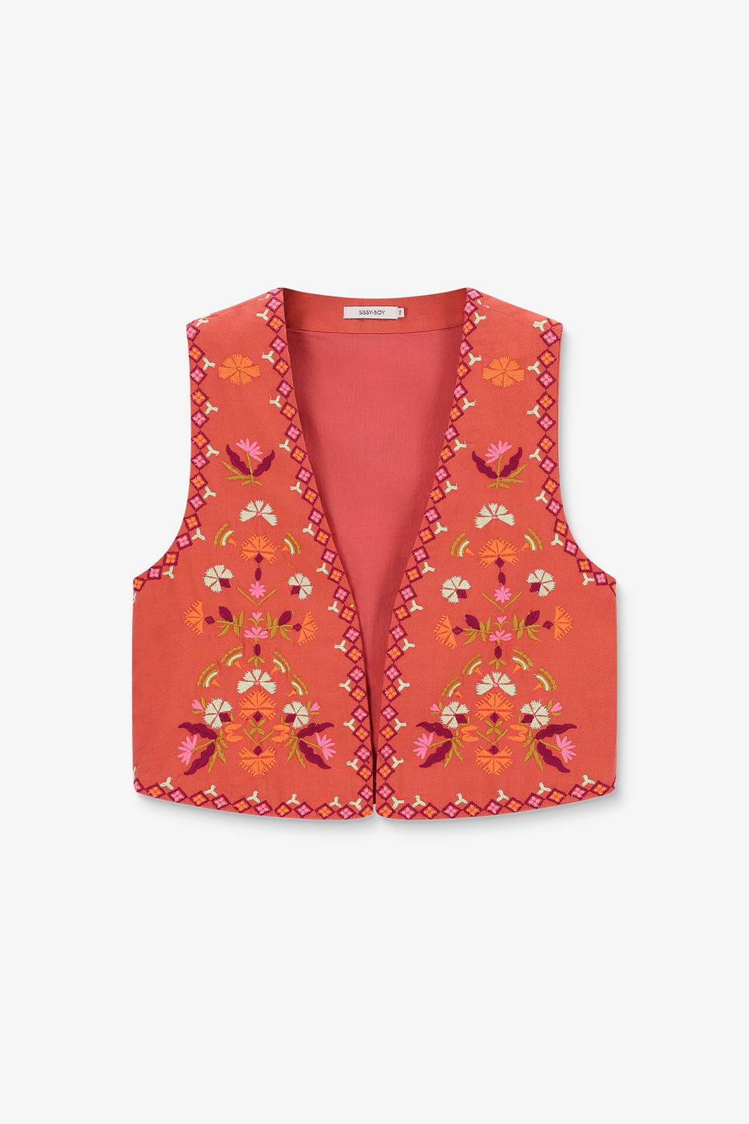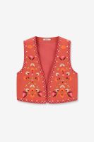 Hellrote Weste mit Blumenstickerei der Marke Sissy-Boy. Die Weste ist ein wunderschöner Eyecatcher. Material: 100% Baumwolle.