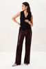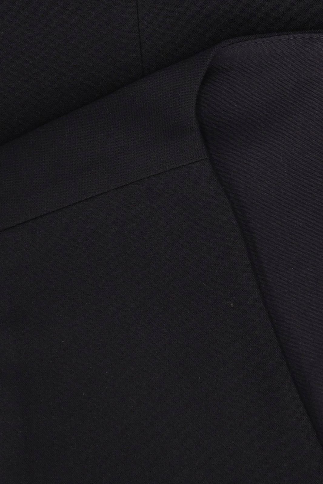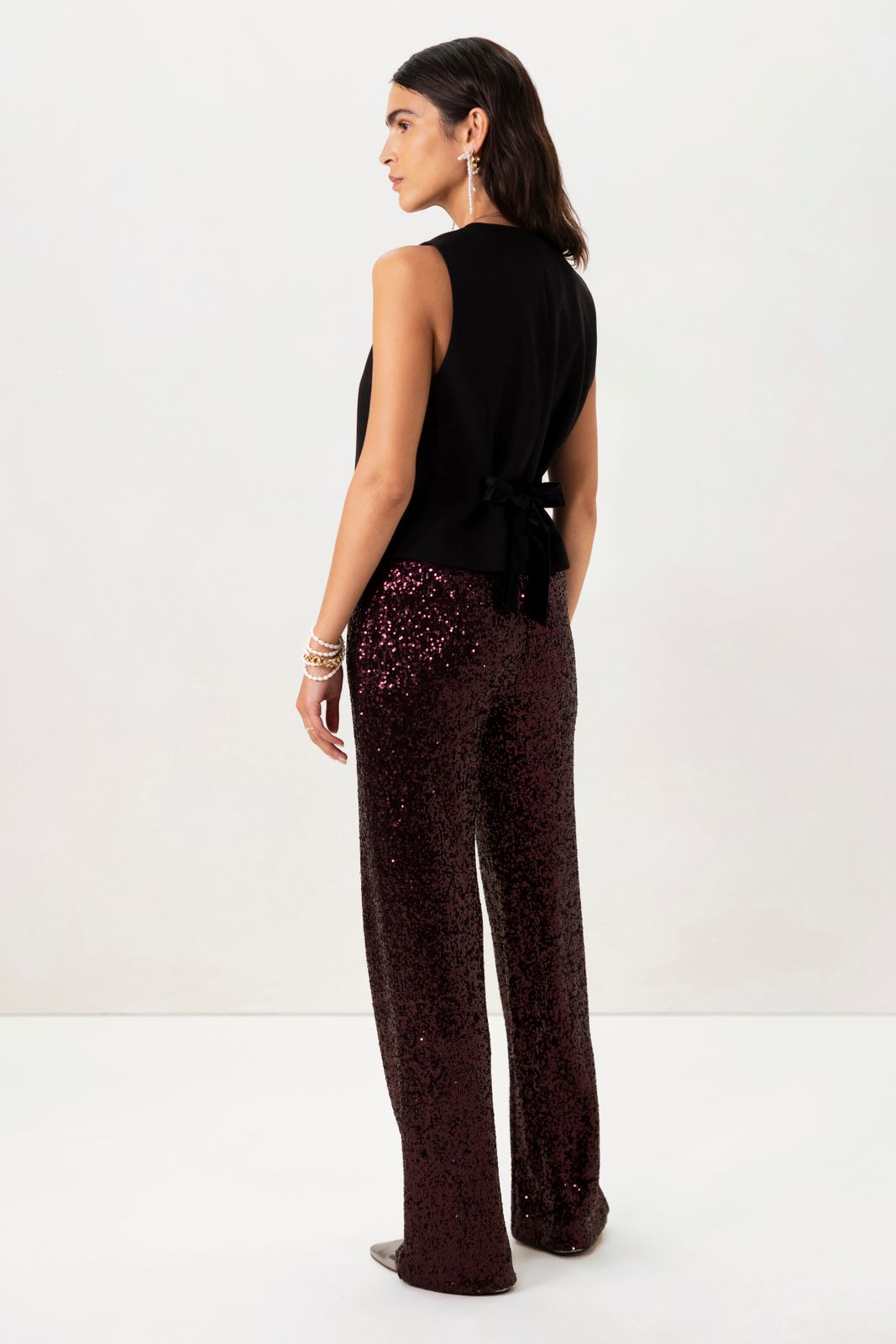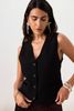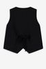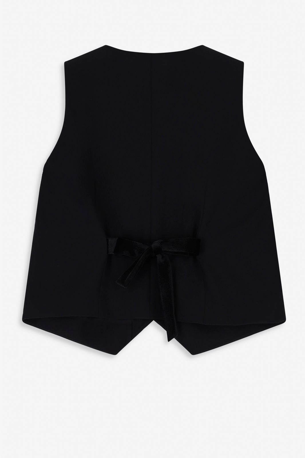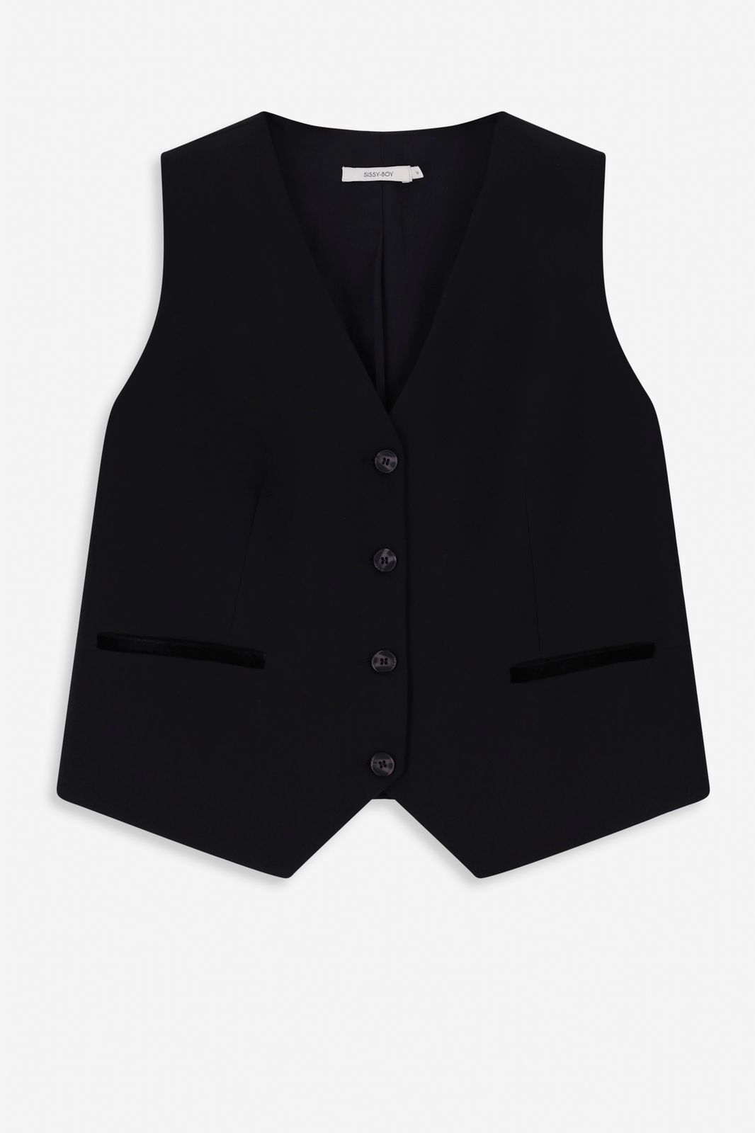 Schwarze Weste der Marke Sissy-Boy. Die Weste hat eine Knopfleiste, Paspeltaschen auf der Vorderseite und eine Samt-Schleife auf der Rückseite. Material: 71% Polyester, 22% Viskose, 7% Elasthan.