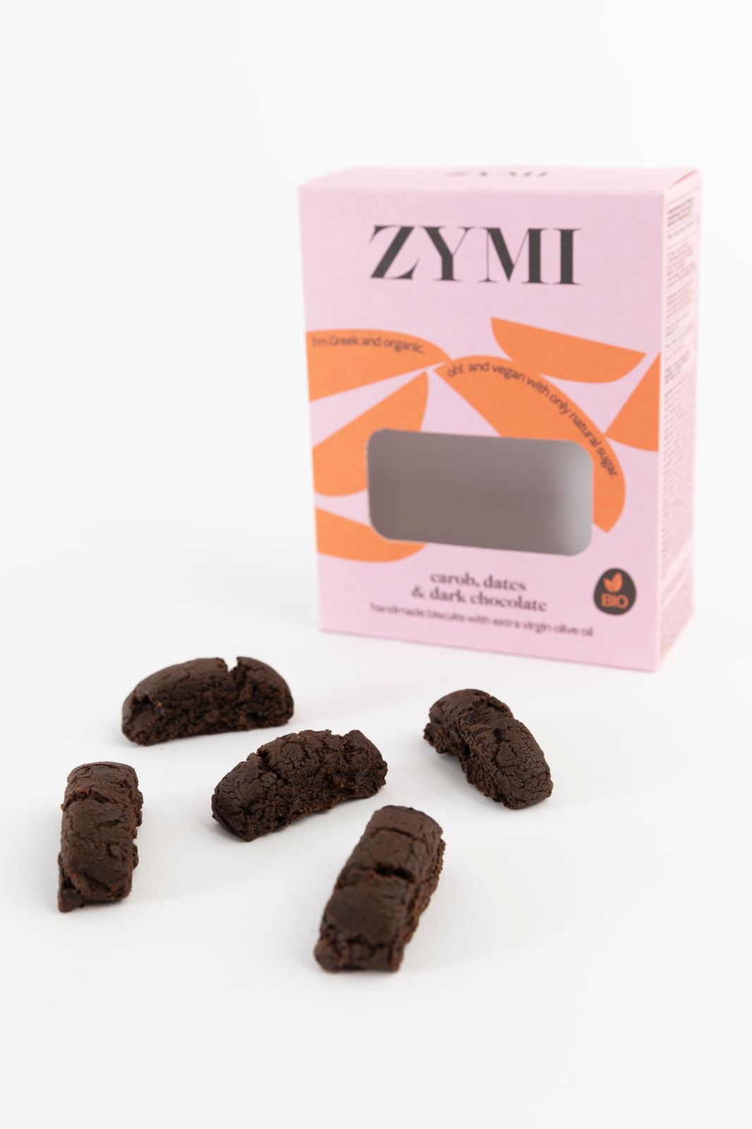 Keks mit dunkler Schokolade, Carob und Datteln. Zutaten: Weizenmehl, Orangensaft, Carobpulver, natives Olivenöl, dunkle Schokolade (Kakaomasse, Kokosblütenzucker, Kakaobutter, Emulgator: Sojalecithin, Vanilleextrakt), Datteln, Sonnenblumenöl, Orangenschale, Backpulver. Inhalt: 130 Gramm.