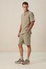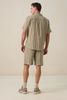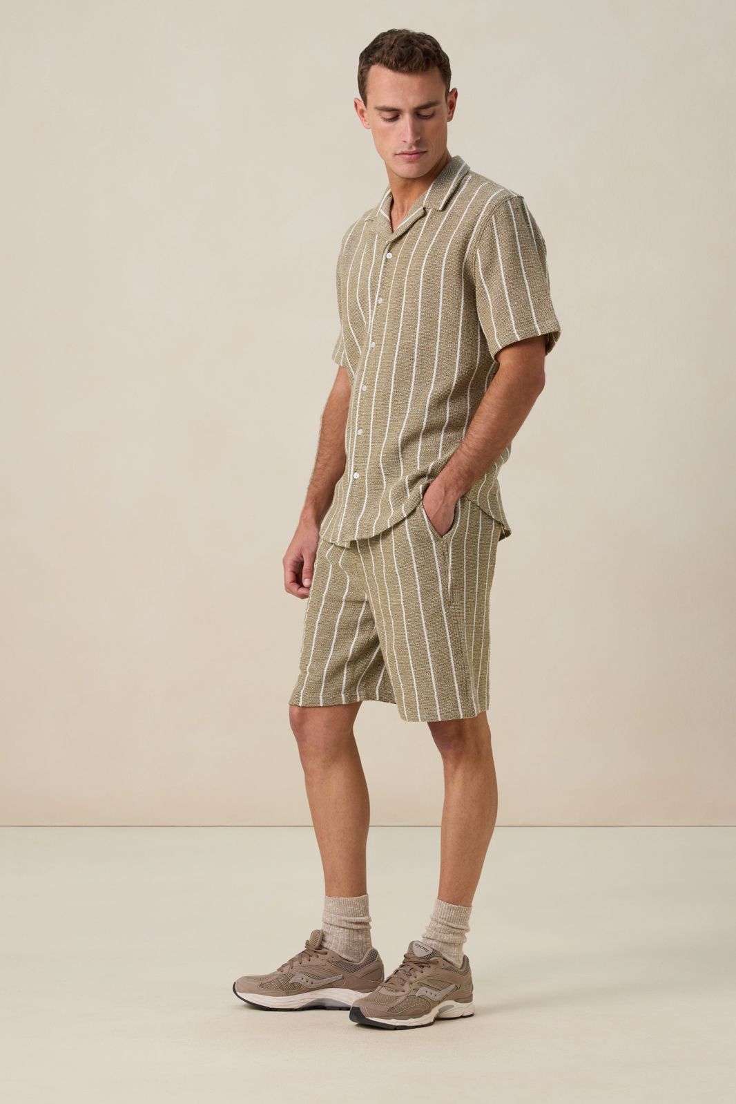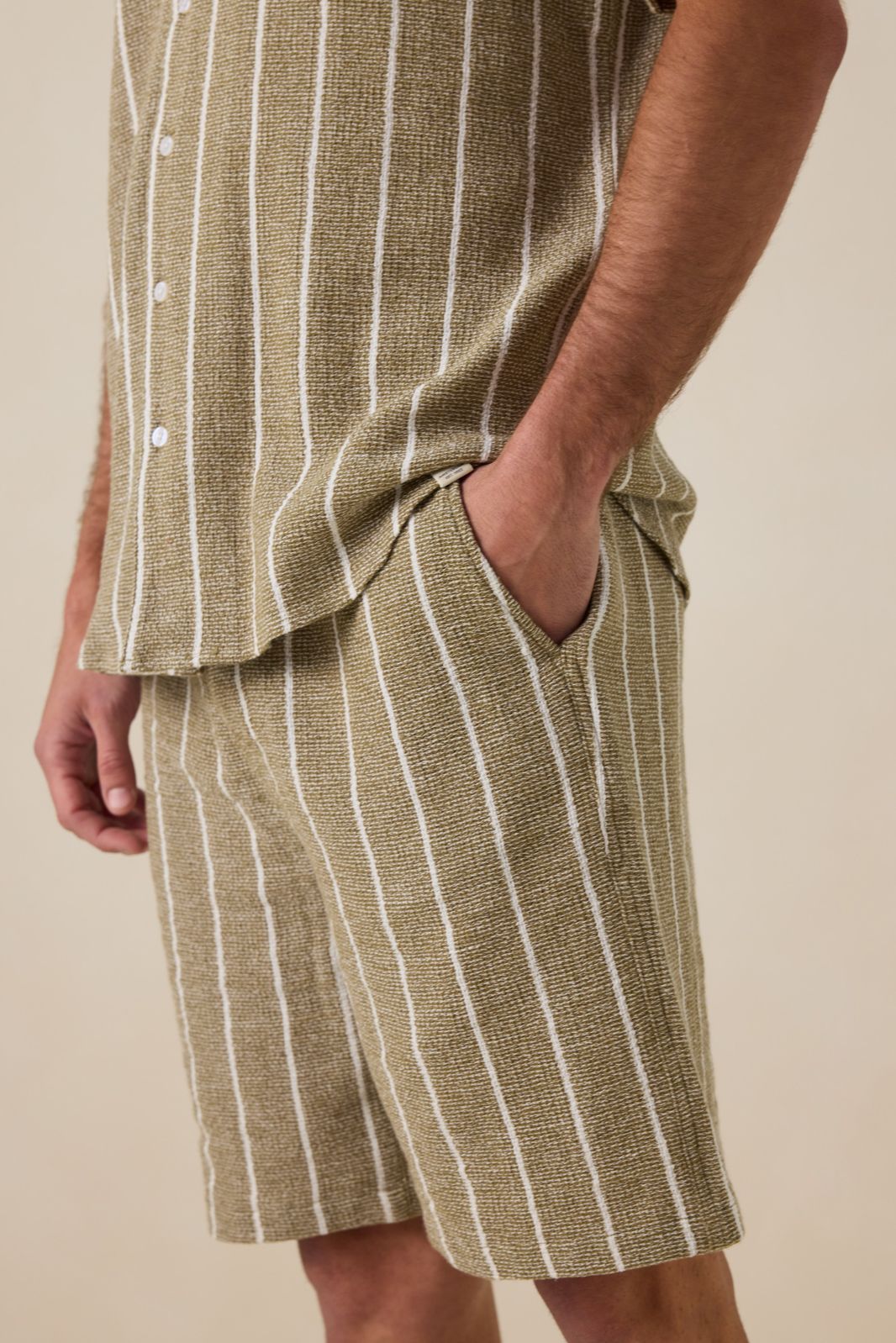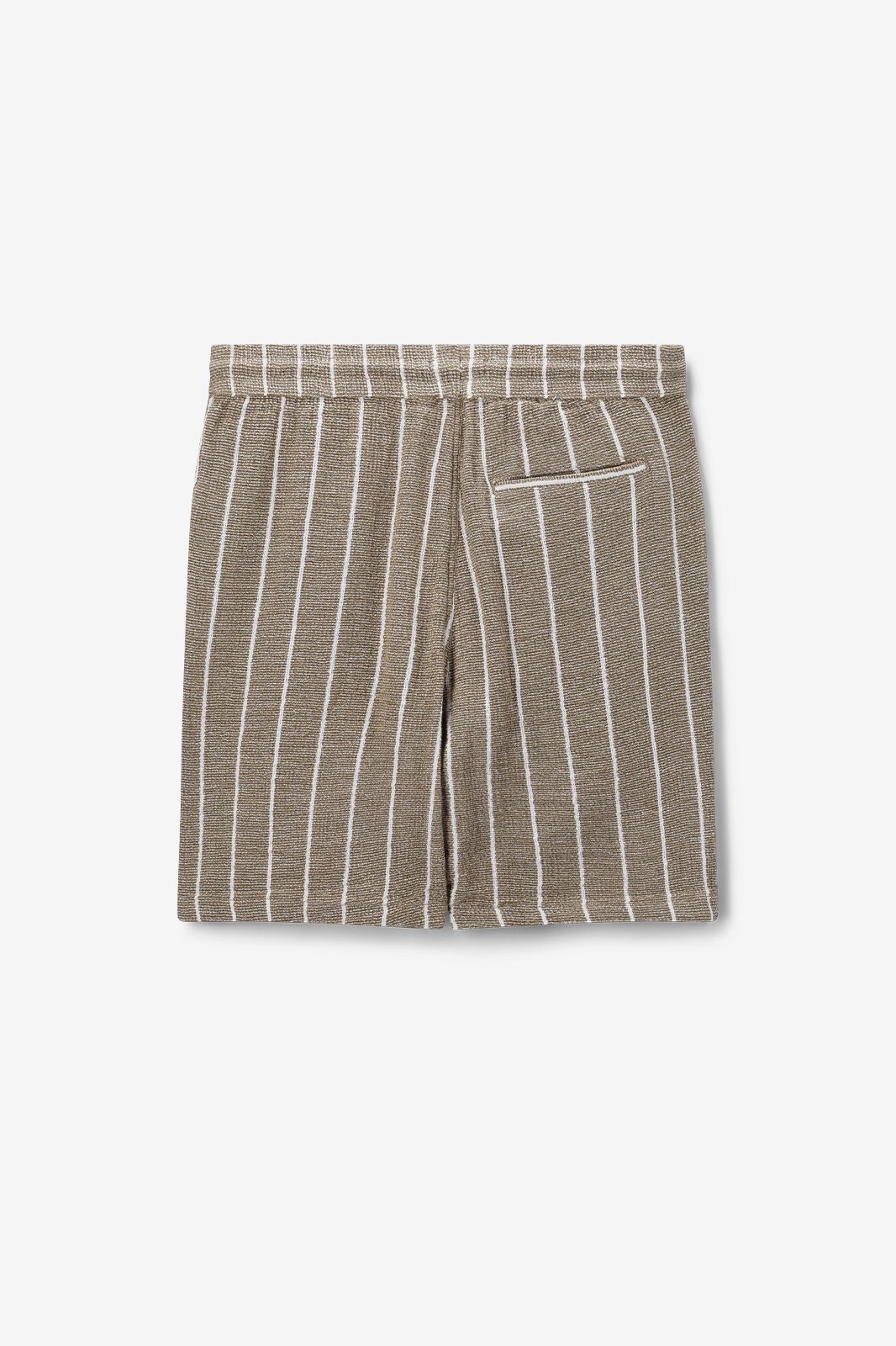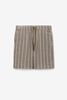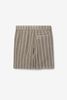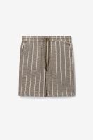 Hellgrüne Shorts mit Streifen der Marke Sissy-Boy. Die kurze Hose hat Seitentaschen, einen elastischen Bund mit Kordelzug und Längsstreifen. Unser Model ist 1,87 m groß und trägt Größe M. Material: 100% Baumwolle.
