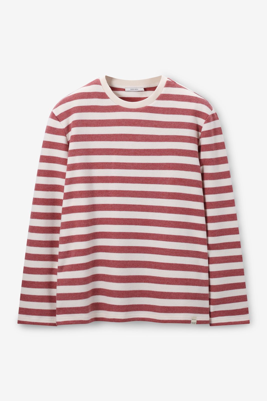 Rot gestreifter Sweater der Marke Sissy-Boy. Der Pullover hat einen runden Ausschnitt und einen geraden Schnitt. Material: 100% Baumwolle.