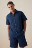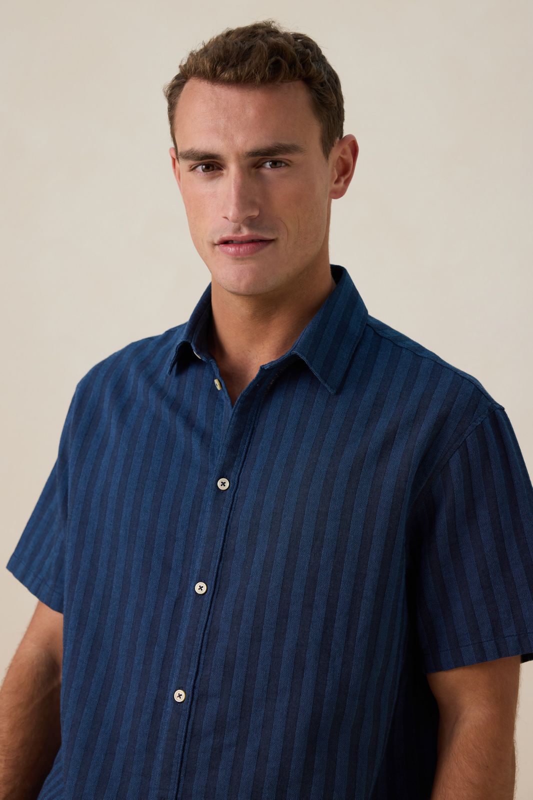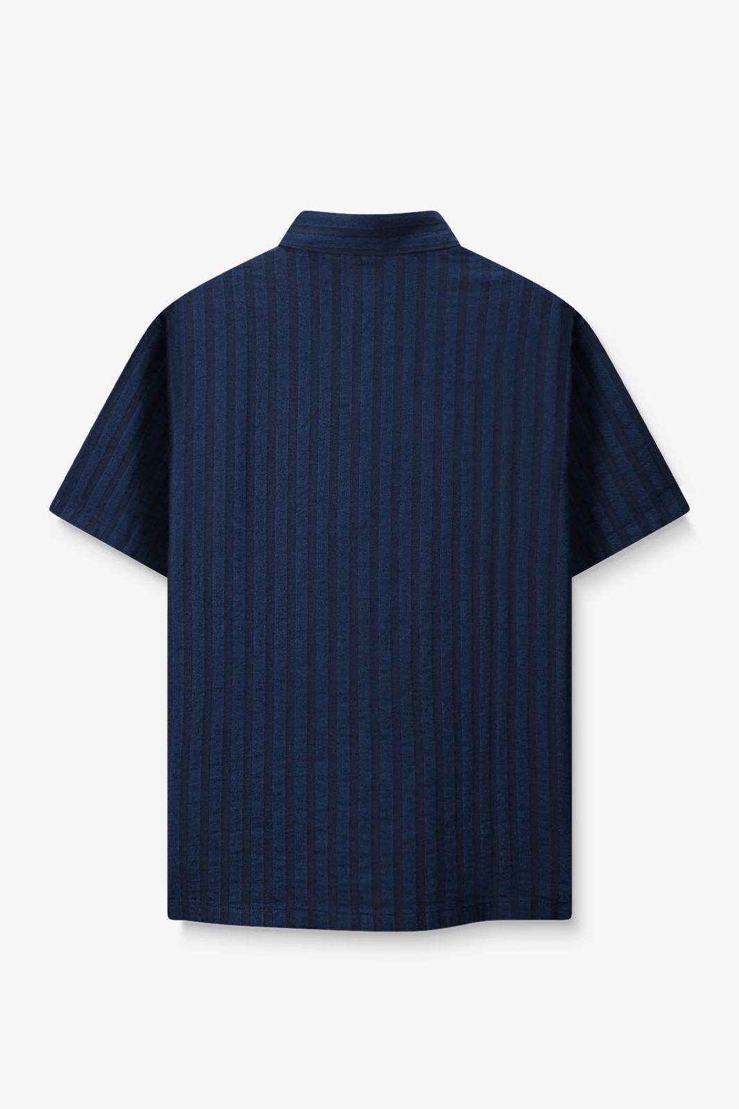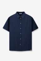 Dunkelblaues Hemd mit subtilem Streifenmuster der Marke Sissy-Boy. Das Hemd hat eine Knopfleiste, kurze Ärmel und einen klassischen Kragen. Material: 100% Baumwolle.