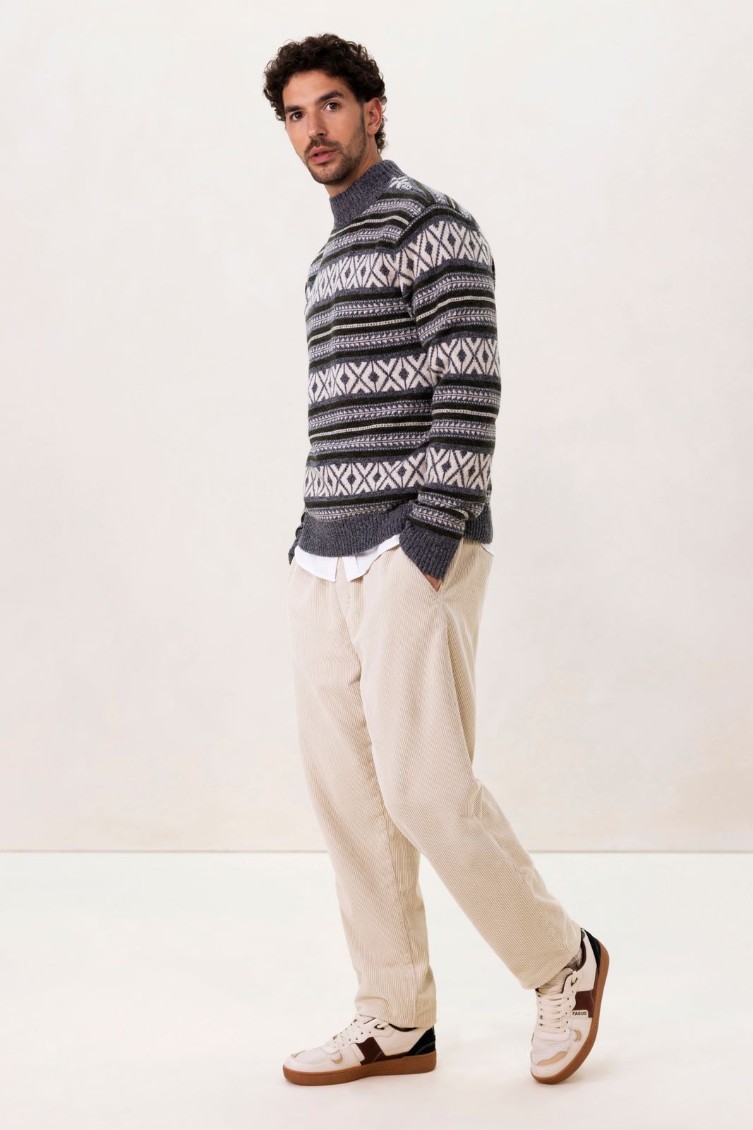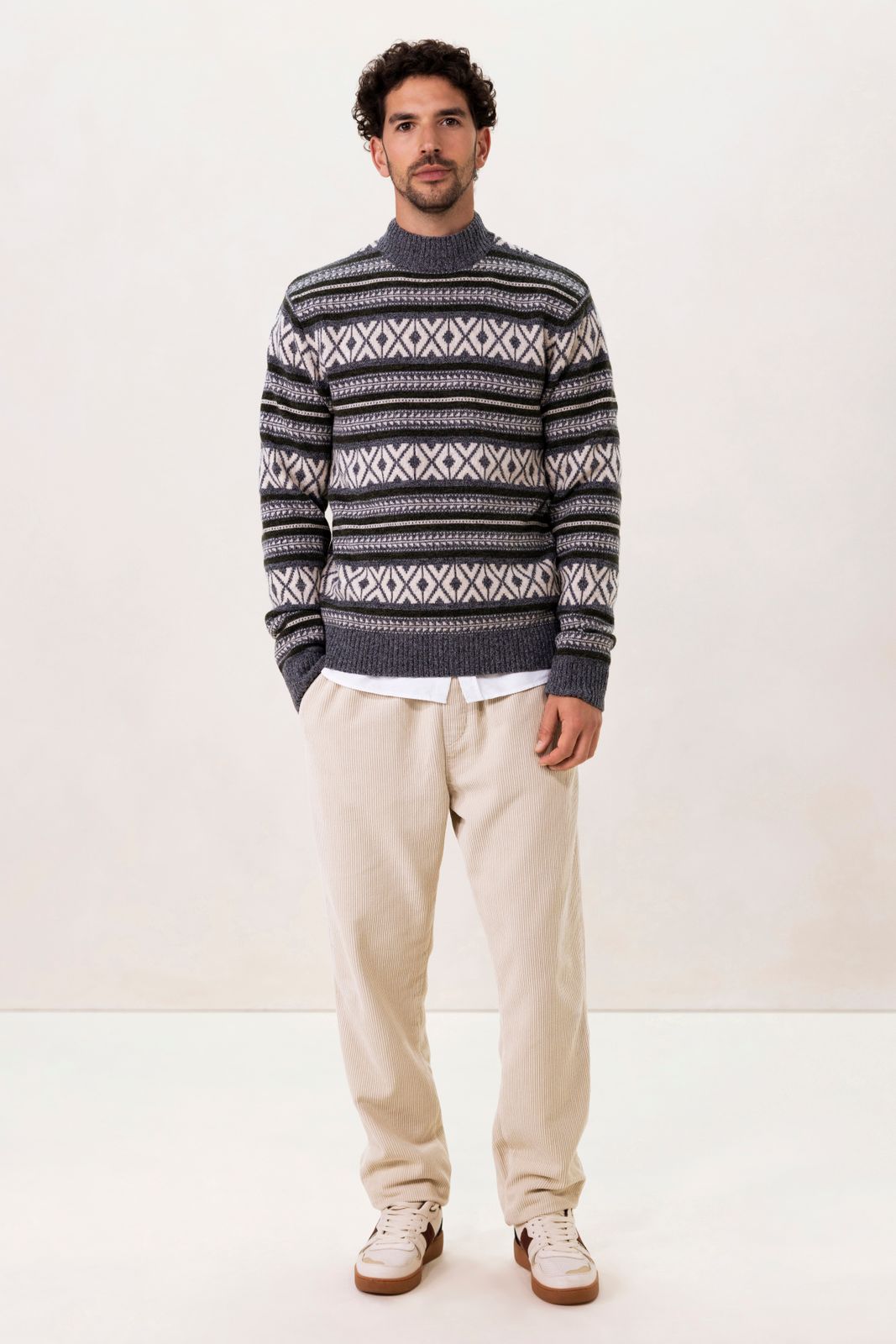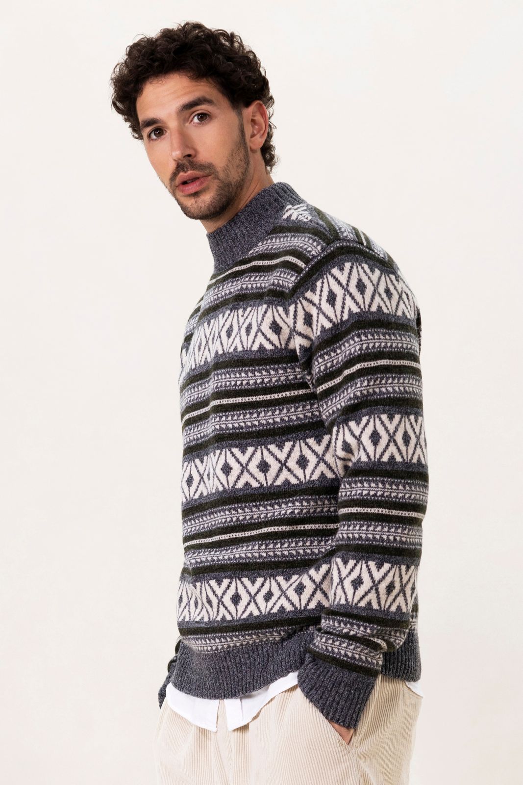 Grauer Jacquard-Pullover der Marke Sissy-Boy. Der Pullover hat einen runden Ausschnitt, einen regulären Schnitt und ein Jacquard-Muster. Material: 80% Wolle, 20% Nylon.