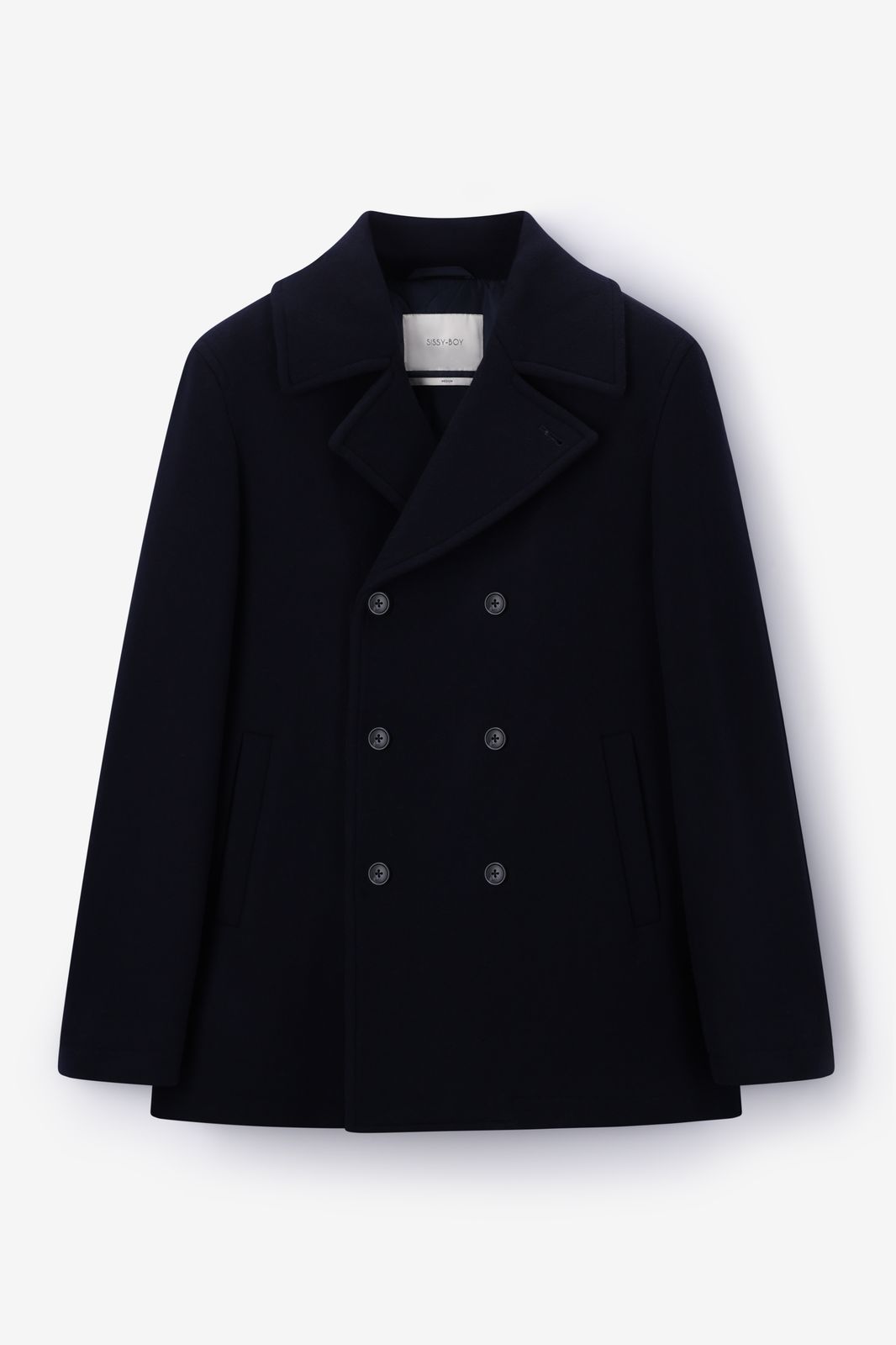 Dunkelblaue Peacoat-Jacke aus Wolle der Marke Sissy-Boy. Die Jacke hat einen Reverskragen, eine Knopfleiste, Seitentaschen und ein klassisches Peacoat-Design. Material: 70% Wolle, 30% Polyamid.