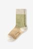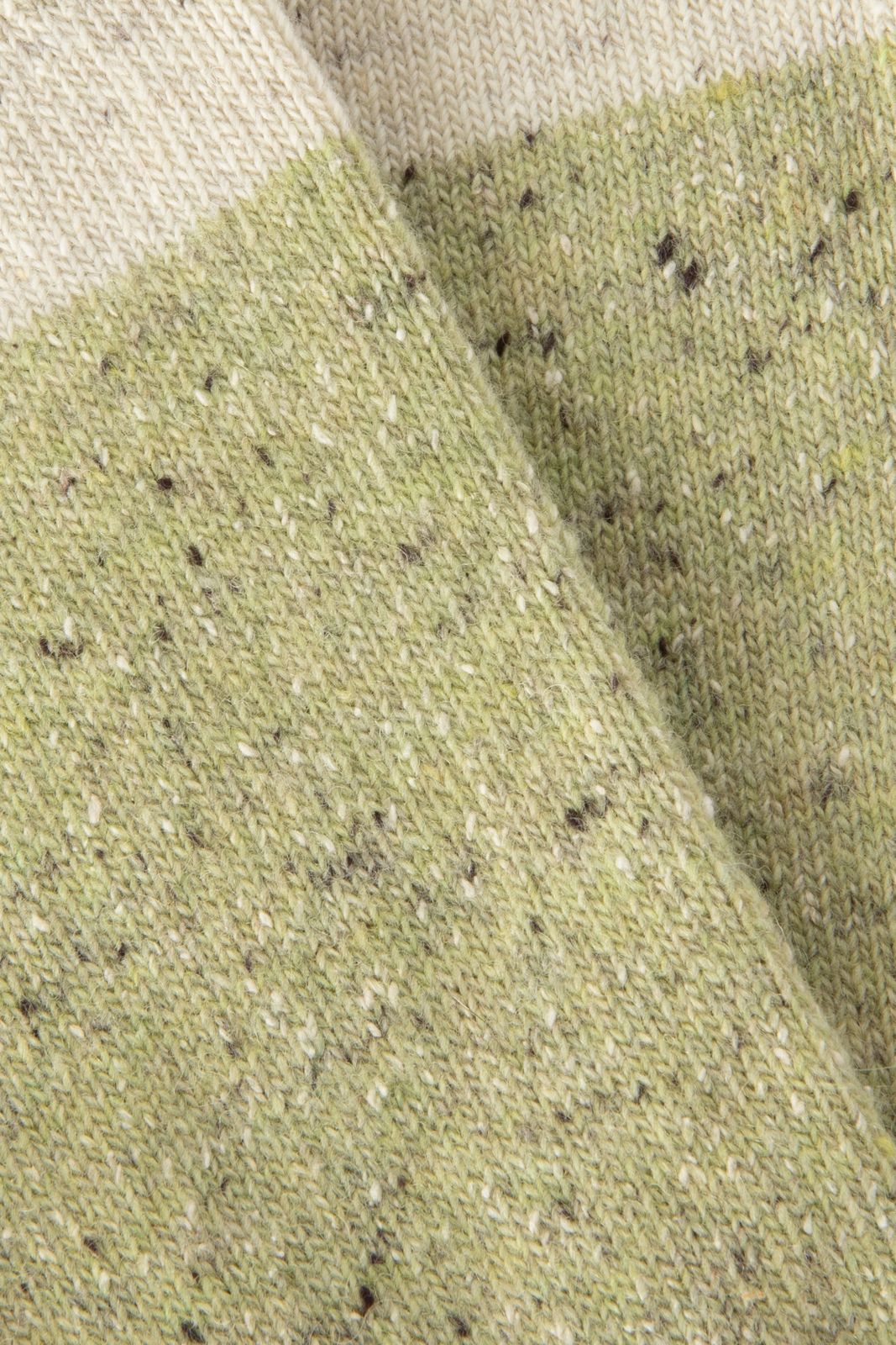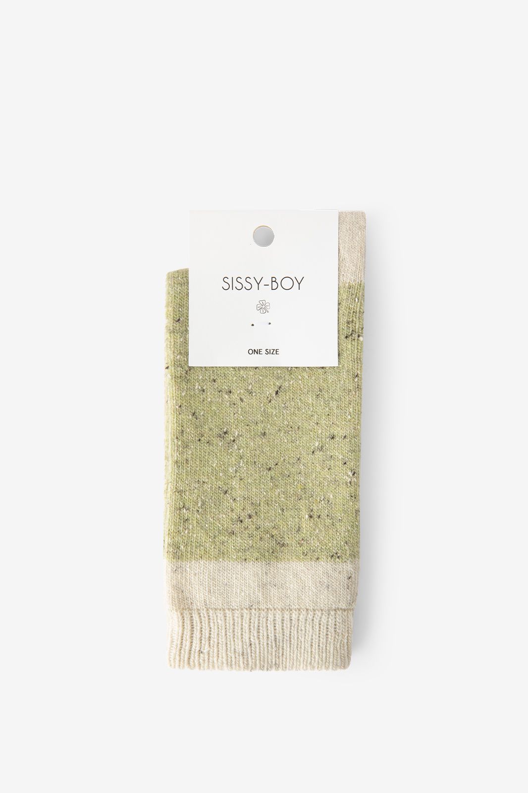 Grüne Socken in Colorblocking-Optik der Marke Sissy-Boy. Die Socken haben einen Wollanteil. Material: 46% Wolle, 36% Polyamid, 16% Seide, 1% Polyester, 1% Elasthan.