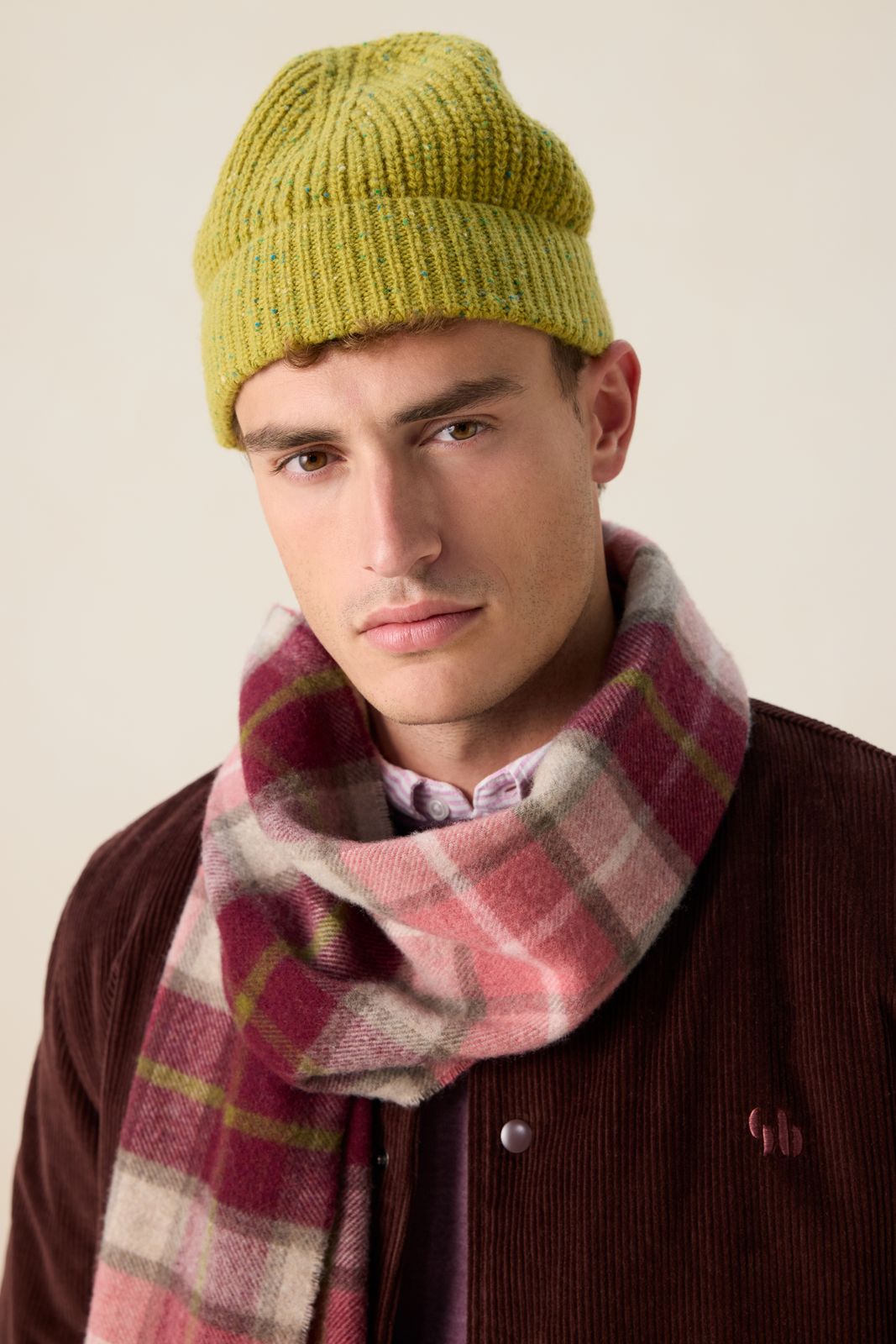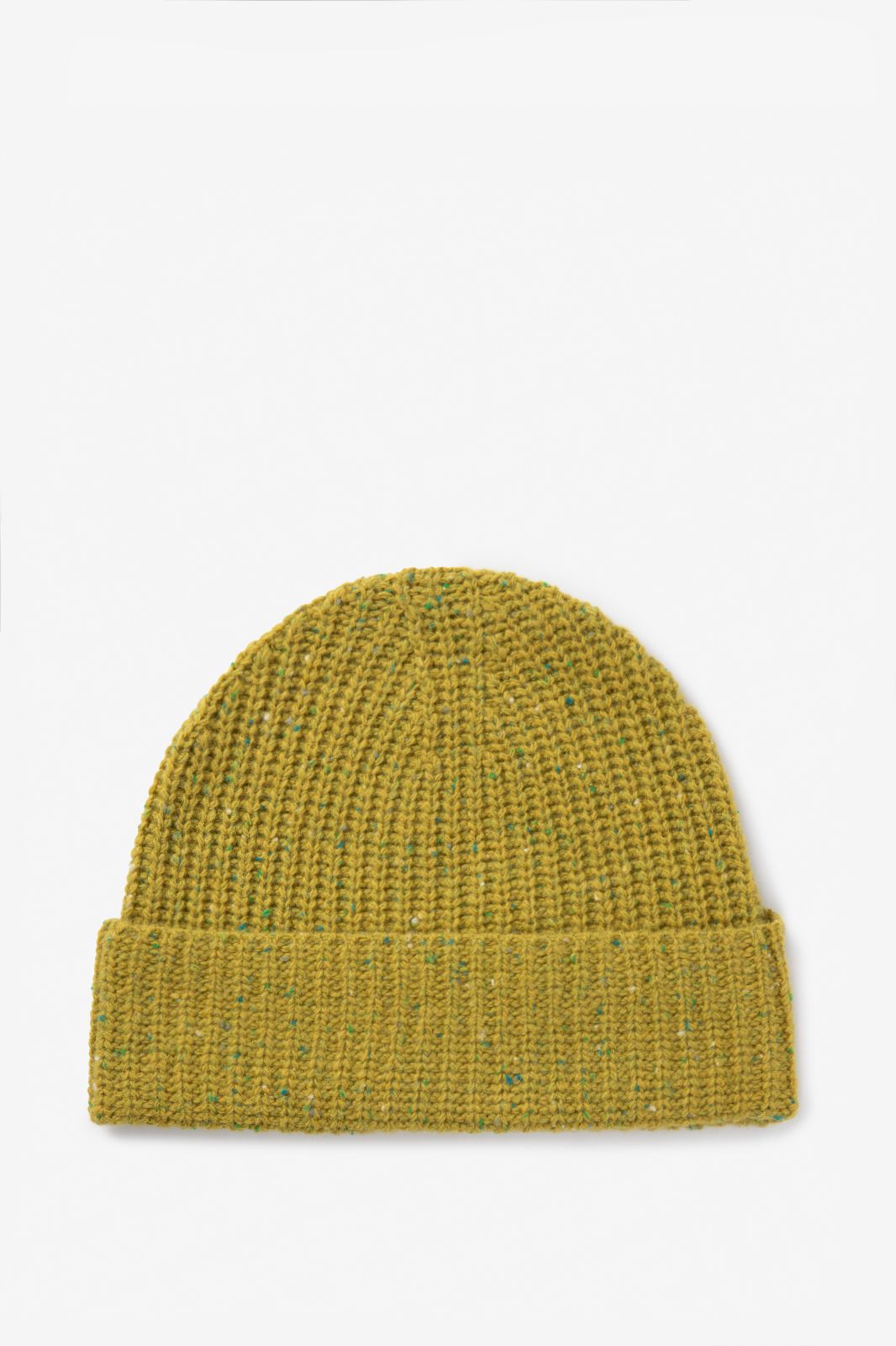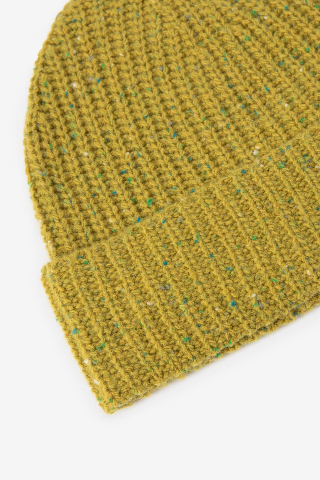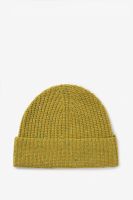 Hellgrüne Wollmütze der Marke Sissy-Boy. Die Mütze hat einen Umschlag, ein Rippmuster und kleine farbige Details. Material: 80% Wolle, 20% Nylon.