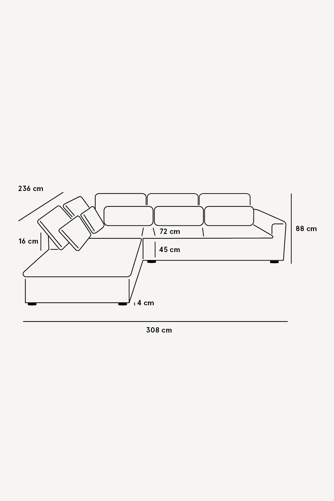 Wunderschönes Ecksofa aus der neuen Baron-Serie in Größe XL (3,5-Sitzer). Das Sofa ist herrlich bequem und besteht aus zwei einzelnen Teilen: der Couch und dem Lounge-Teil. Der Lounge-Teil befindet sich an der linken Seite. Hinweis: Die fünf Lendenkissen werden nicht standardmäßig mitgeliefert. Material: 85% Polyester, 15% Baumwolle. Der 3,5-Sitzer hat eine Höhe von 88 cm, eine Breite von 308 cm und eine Tiefe von 236 cm. Farbe: Darkblue 48.