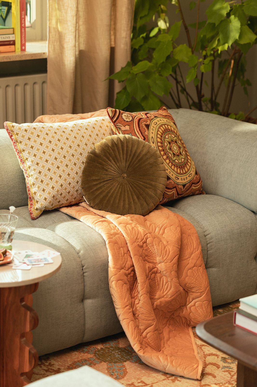 Orangefarbene Decke der Marke Sissy-Boy. Die Decke hat auf einer Seite eine Muschel-Steppung und auf der anderen Seite ein tolles Boho-Muster. Pflegeanleitung: Bei 30 Grad waschen. Gesondert waschen. Nicht bleichen. Nicht im Trockner trocknen. Auf kleiner Stufe bügeln. Maβe: 130x180 cm. Material: 100% Baumwolle. Füllung: 100% Polyester.