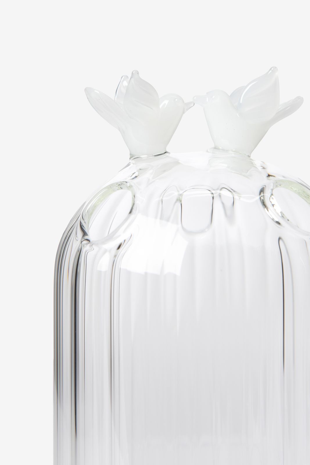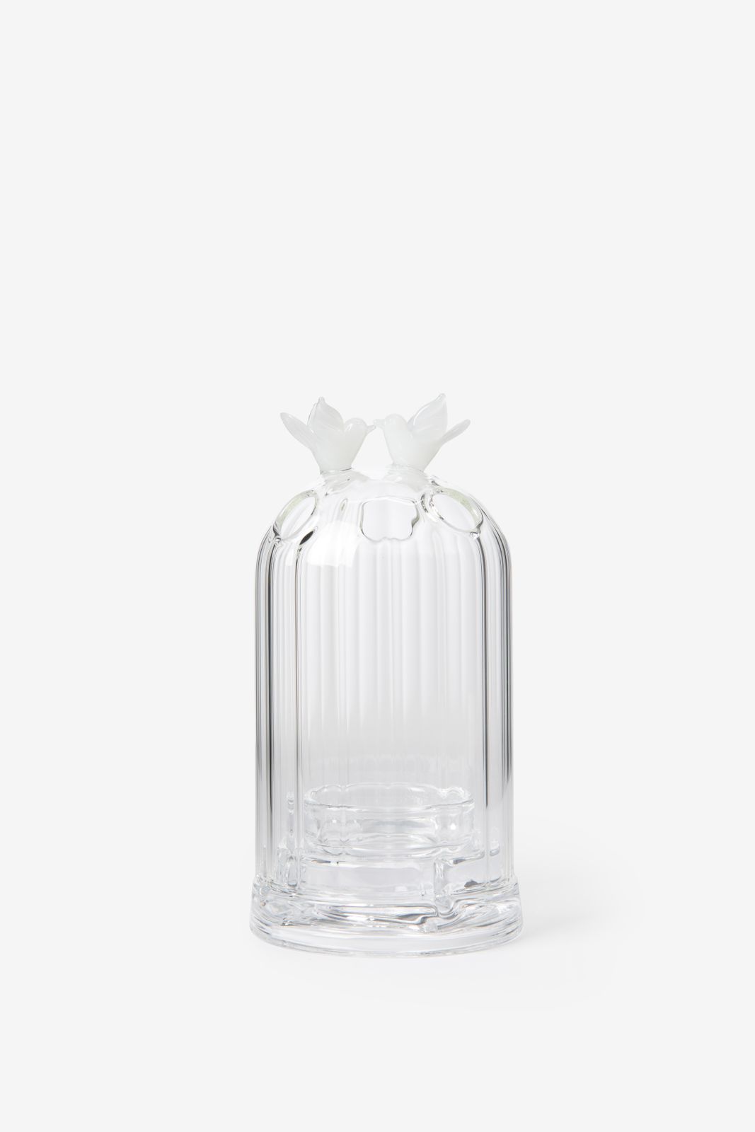 Teelichthalter aus Glas der Marke Sissy-Boy. Der Teelichthalter hat die Form einer Glasglocke und ist auf der Oberseite mit zwei verliebten Turteltauben versehen. Maβe: 14,5x7,5 cm. Material: 100% Glas.