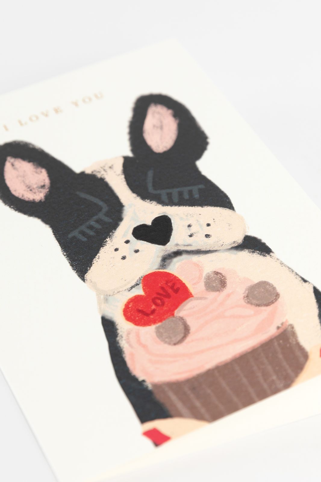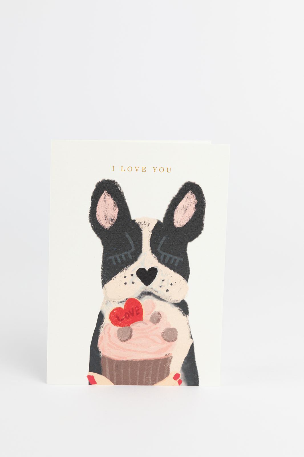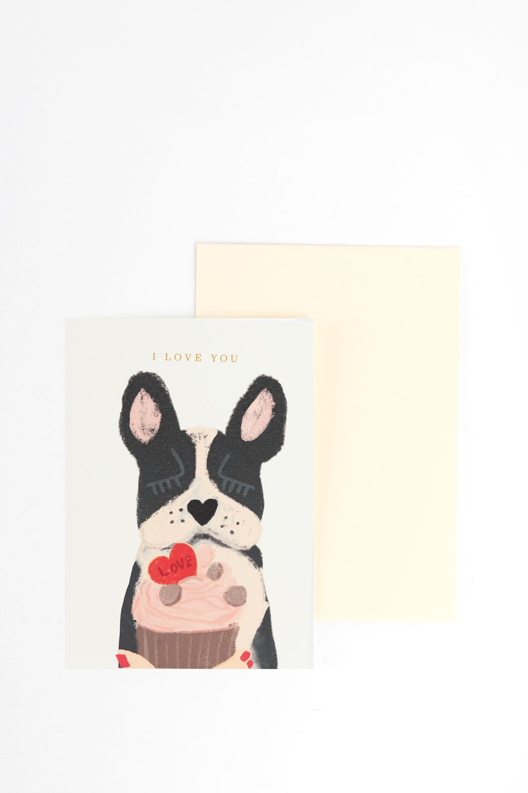 Illustrierte Faltkarte im A6-Format mit "I love you"-Aufschrift und niedlicher Bulldogge. Die Karte wird mit einem Umschlag geliefert.