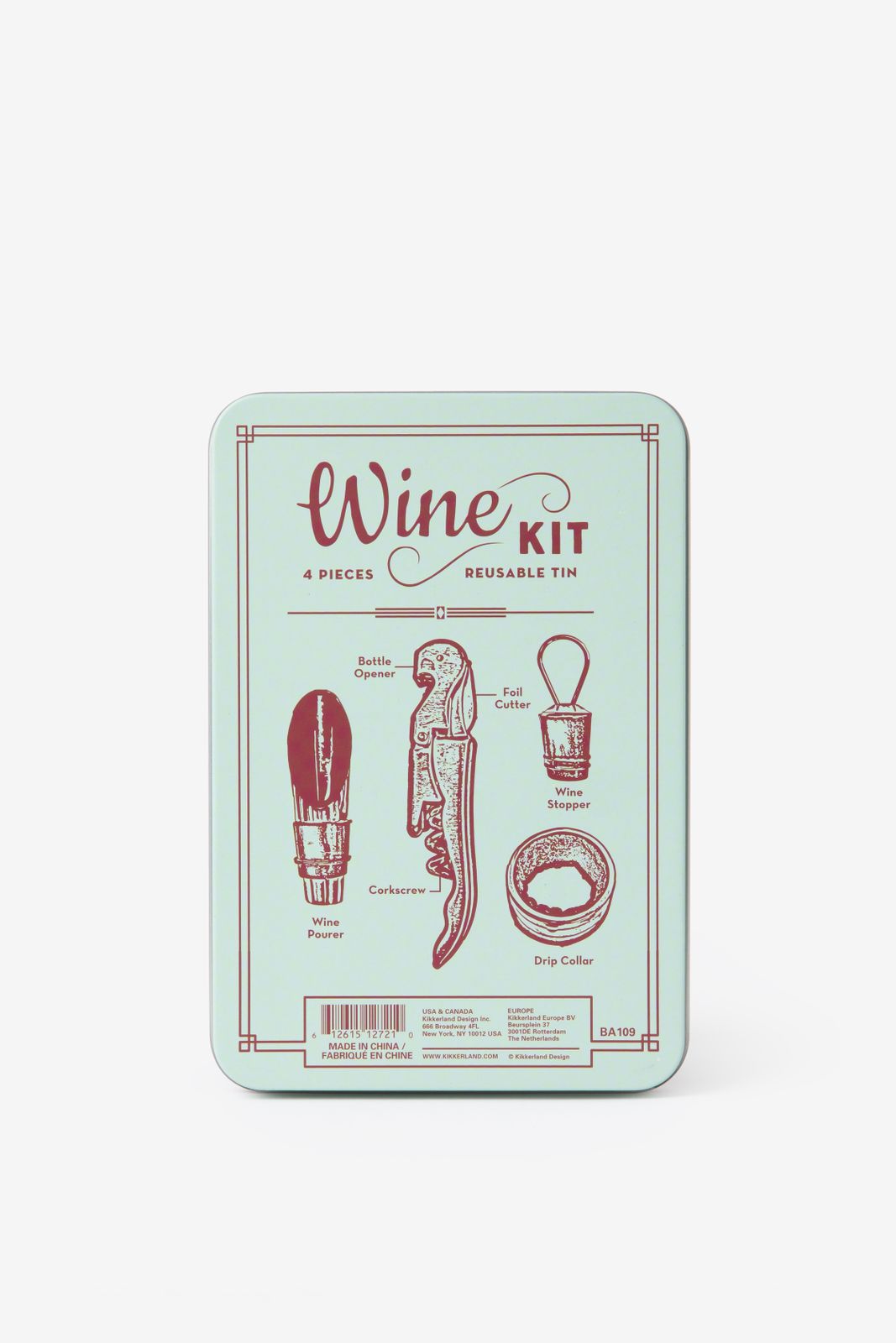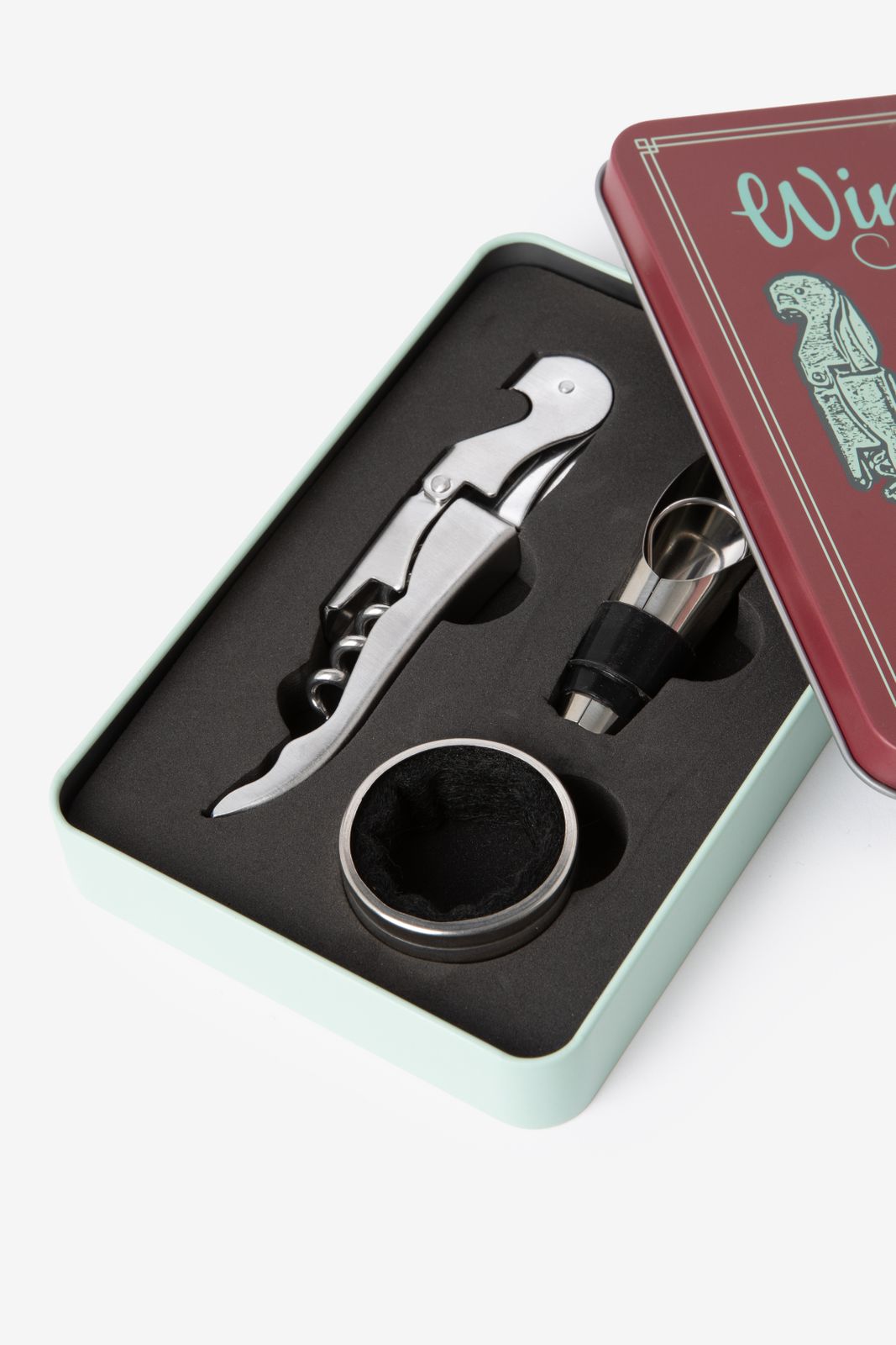 Retro Wine Kit der Marke Kikkerland. Das Set enthält hochwertige Accessoires, die jeder Weinliebhaber zu schätzen weiß und ist ein tolles Geschenk für Sie oder Ihn. Maβe: 15,5x10,5 cm.