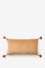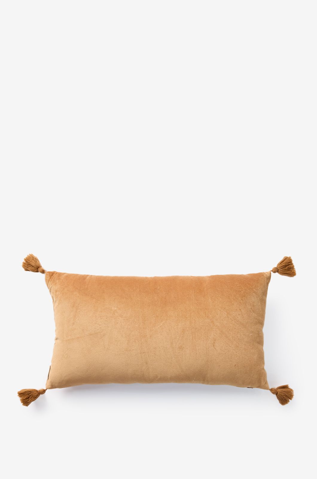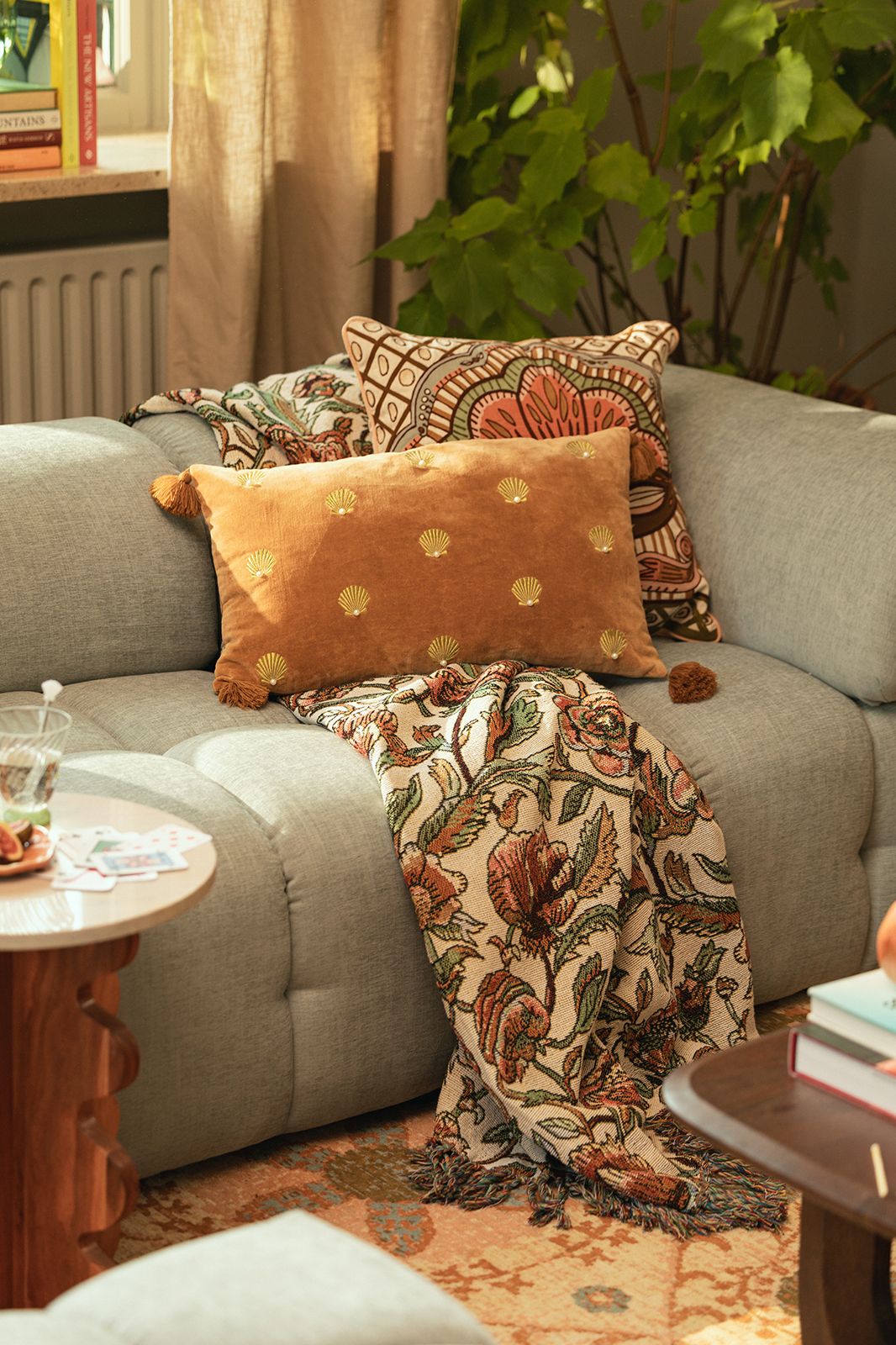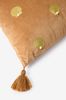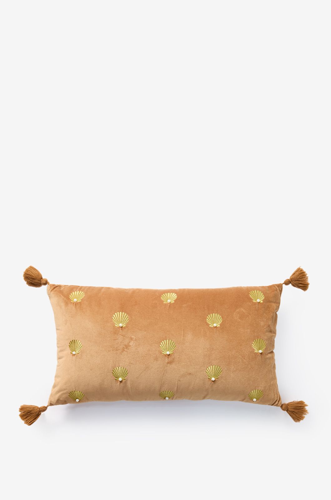 Hellbraunes Kissen mit goldfarbener Muschelstickerei der Marke Sissy-Boy. Das Kissen ist aus Samt gearbeitet und mit kleinen Perlen und Quasten abgesetzt. Maβe: 35x60 cm. Material: 100% Baumwollsamt.