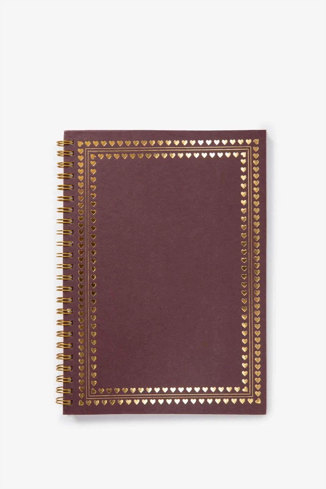 Lilafarbenes Notizbuch der Marke Sissy-Boy. Das Notizbuch hat einen festen Einband, einen goldfarbenen Herz-Print, ein A5-Format und linierte Seiten. Maβe: 21x15 cm. Material: 100% Papier.