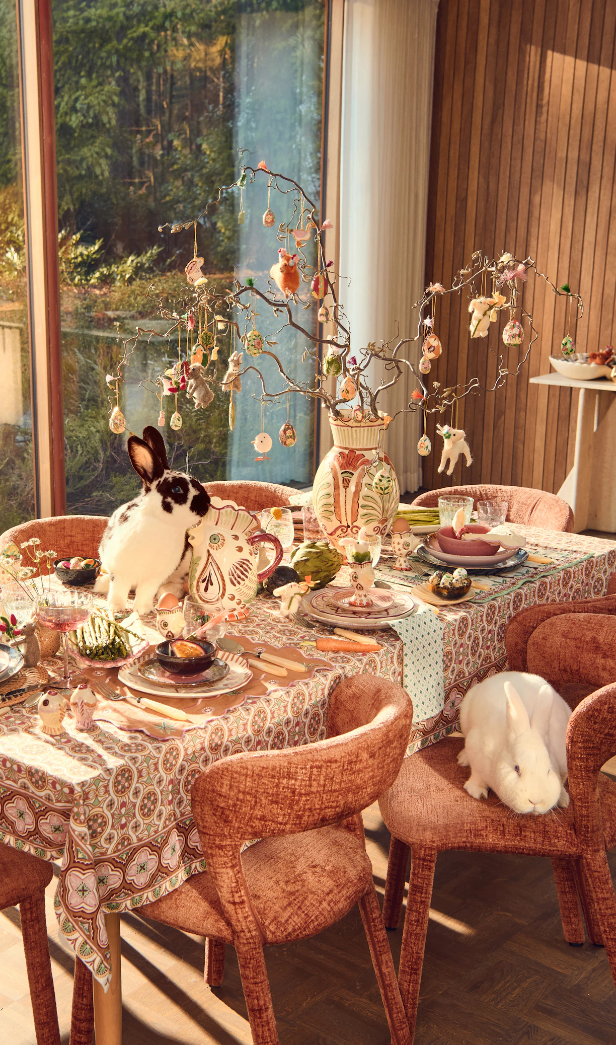 Die Ostereier haben in diesem Jahr außerdem ein neues Design bekommen. Wir haben Osterornamente aus Pappmaché und Papier entworfen, die du an deinen Osterzweig hängen kannst. Auch die Servietten, Tischdecken und das Geschirr sind mit einzigartigen Prints gestaltet.