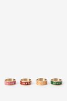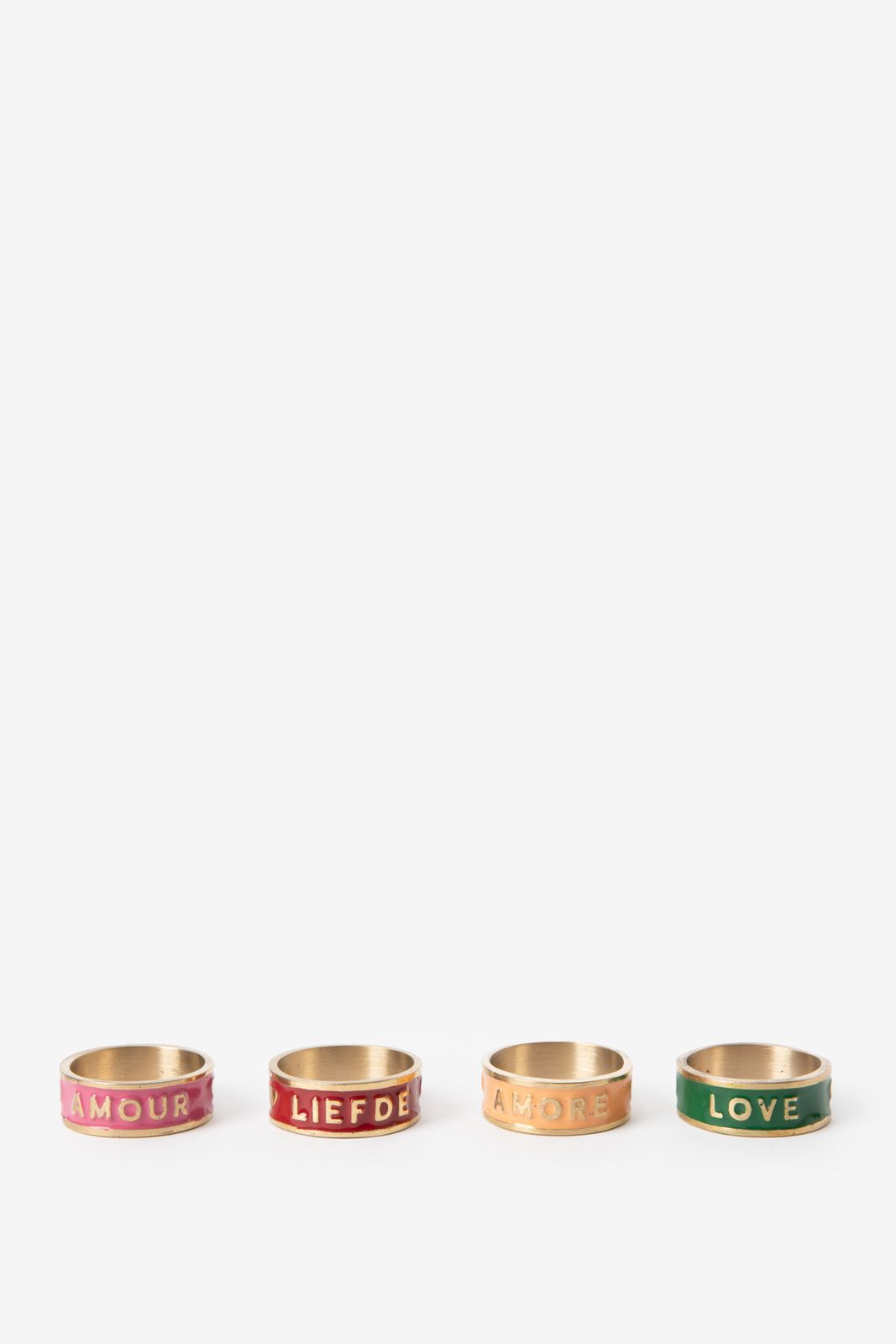 Set aus 4 mehrfarbigen Serviettenringen der Marke Sissy-Boy. Die Serviettenringe haben die Farben Rot, Rosa, Orange und Grün und sind mit einer "Love"-Aufschrift in unterschiedlichen Sprachen versehen: Love, Amore, Liefde und Amour. Die Ringe werden im 4er-Set geliefert. Maβe: 3 cm. Material: 100% Messing.