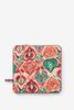 Mehrfarbiger Topflappen. Der Topflappen hat ein farbenfrohes Ikatmuster, einen rosafarbenen Rand und sind mit einer kleinen Schlaufe zum Aufhängen versehen. Maβe: 21x21 cm. Material: 100% Baumwolle.